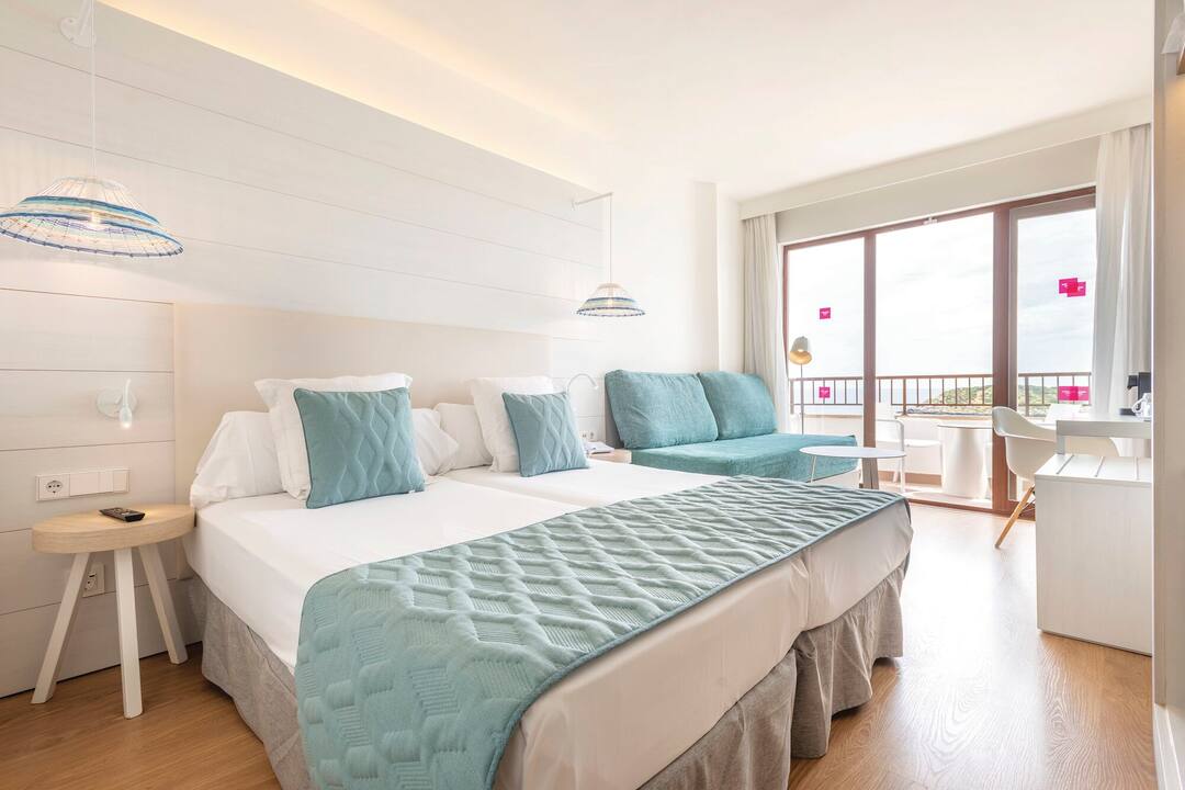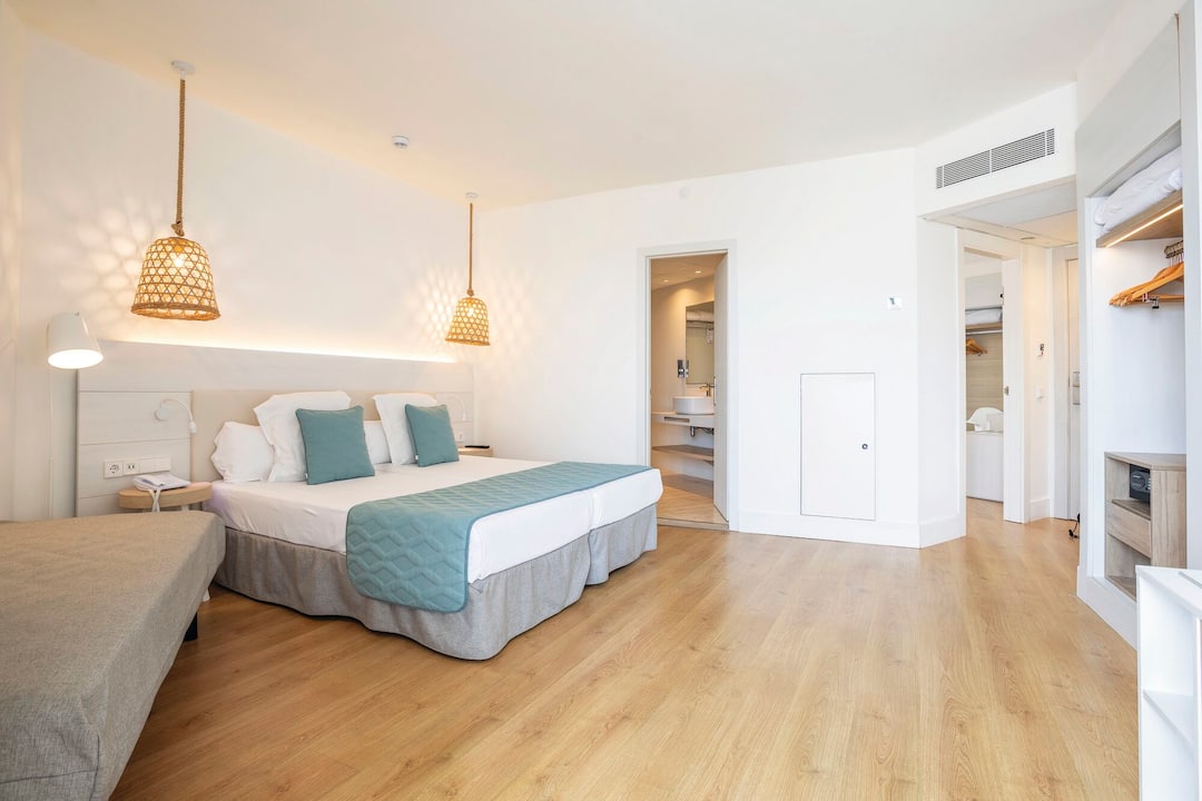 The golden sand is right on the doorstep at Alua Miami Ibiza Hotel and Apartments, so you can go from your room to the beach in just a few minutes. There’s a chilled-out feel throughout the inside, plus a bar and buffet restaurant – and there’s plenty of family-friendly fun to be had outside too. The big outdoor pool has a splash zone for the kids that features a pirate ship with mini flumes, and a sea monster figure that sprays water. There’s also a playground to keep them happy. Everyone will love the games room with pool table and arcade games.