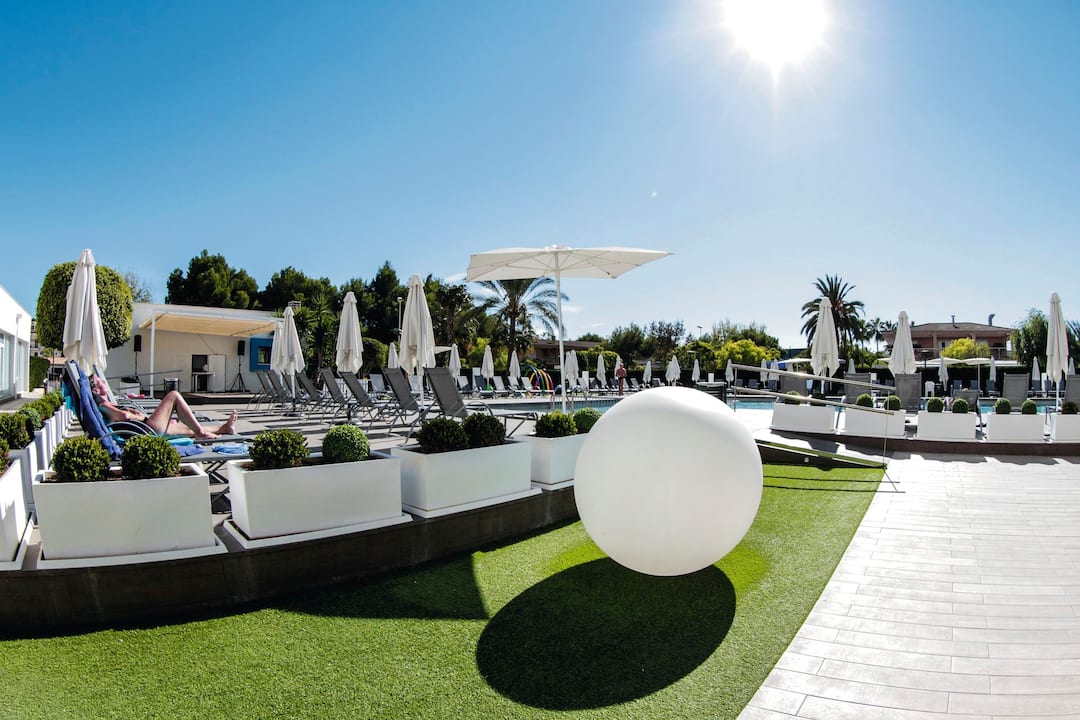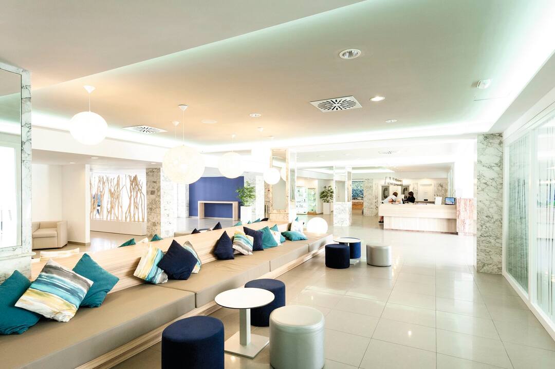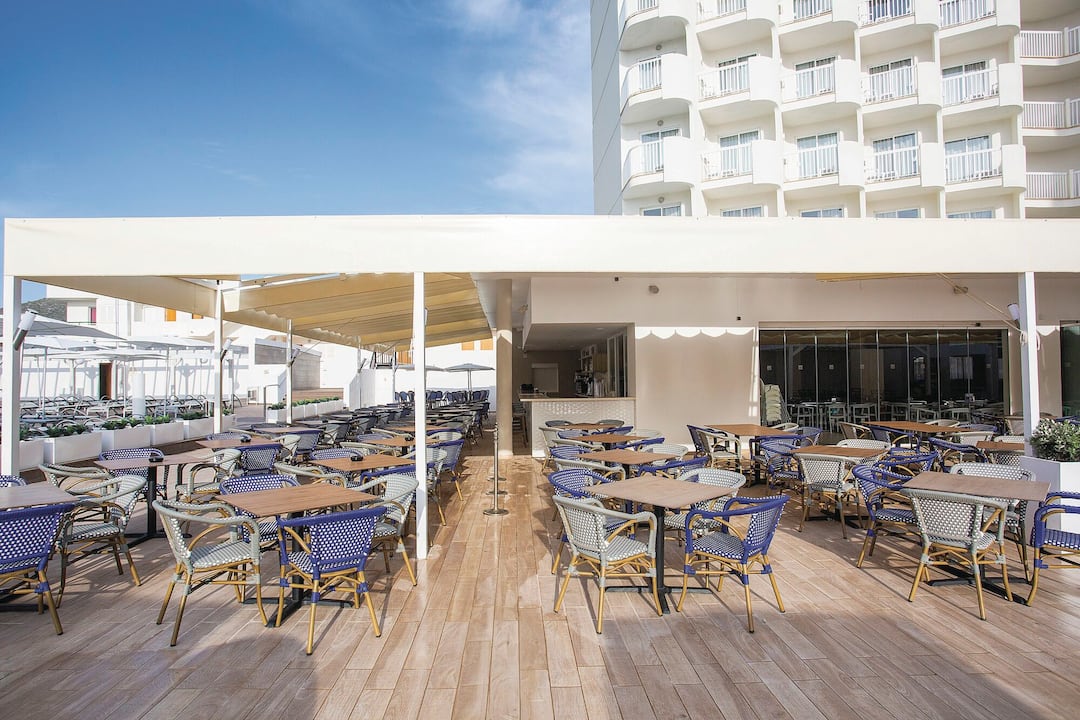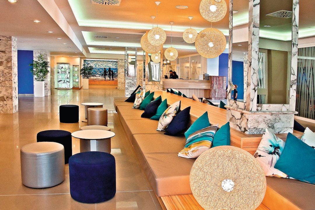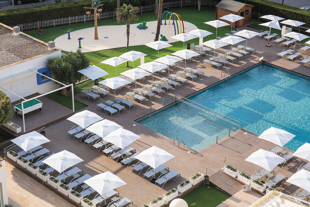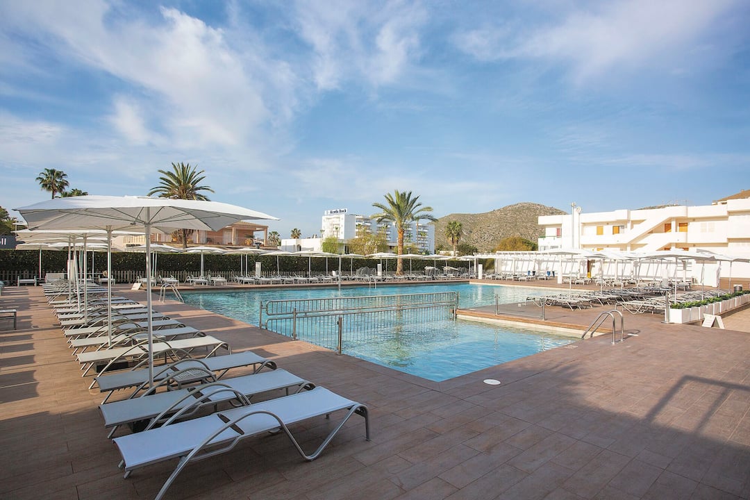 Delfin Azul Hotel offers everything you could want for a relaxed holiday. The modern rooms are decorated with splashes of turquoise and sea-blue, and downstairs is a sophisticated lounge area. Outside, you’ll find a large rectangular pool, with a shallower section for children. There’s also a splash park, a playground and a kids’ club, to keep the little ones entertained. Meanwhile, you can relax in the sun with a drink from the pool bar, tuck into an international spread at the buffet restaurant, or dine al fresco on the terrace. The hotel is located in the modern resort area of Alcudia, a short walk from Alcudia Beach.