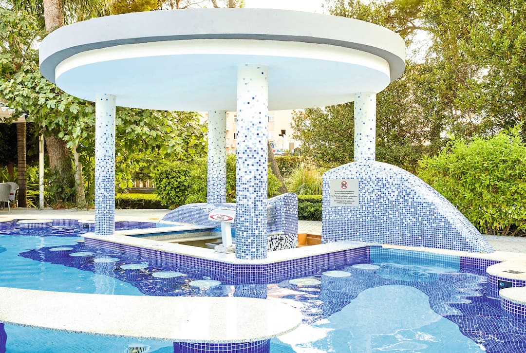 The main pool is a curvy number that wraps around a couple of chunky palm trees. There’s a bar next to it that’s sunken into its own little pool, with in-water tables and chairs for chilling out. The second pool is smaller and is a great place to escape the crowds.