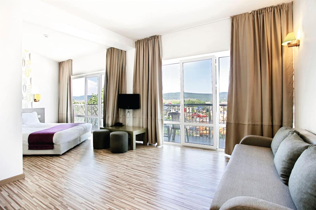 Just a short walk from the town centre, Aqua Nevis Clubhotel combines comfortable, modern accommodation with family-friendly fun and a watery wonderland. The built-in waterpark is an extravaganza of excitement, but there’s also an outdoor pool for a more relaxing experience, away from general public, who can use the waterpark. Large and elegantly furnished guestrooms offer comfort at the end of a relaxing day, and Aqua Nevis Clubhotel’s restaurant has impressive choices on its menu. For more variety, Sunny Beach resort centre is worth a walk if you’d like to mix dinner up a bit.