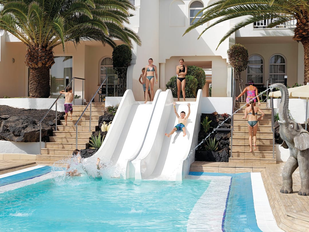 The main lagoon-style pool comes with rocks and bridges. In addition to the second pool, there are also two miniature pools for little ones to splash around in. Sunloungers and parasols line all the options, and there are snack bars, too.