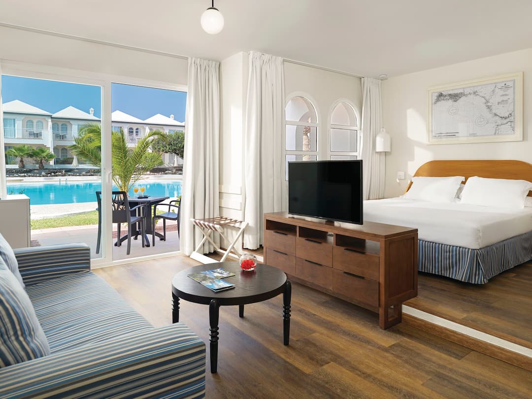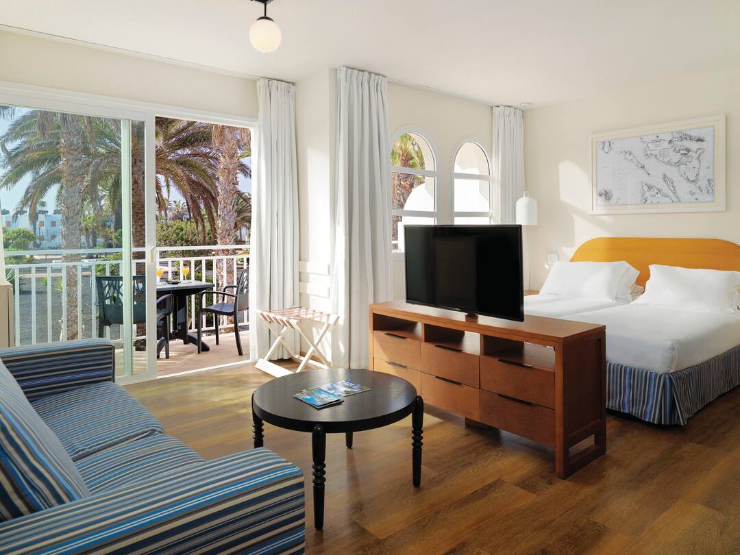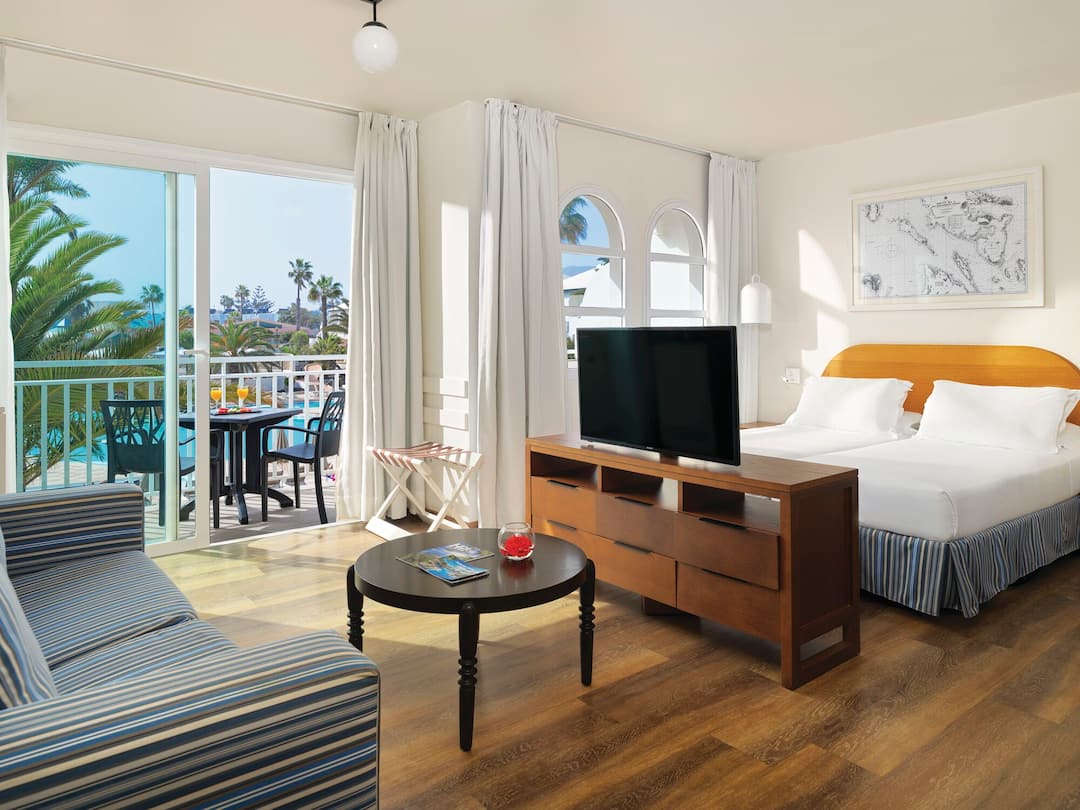 The H10 Ocean Suites has modern interiors and a pair of pools. Whitewashed apartments are scattered among palm trees and manicured gardens. Inside, there’s a light and airy feel with cream walls, white linen and oak-style furniture.