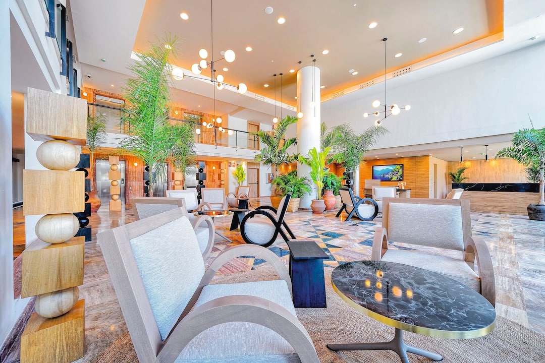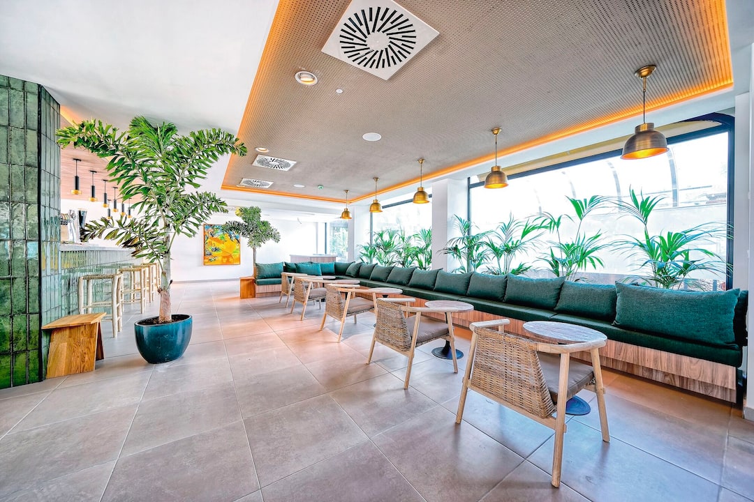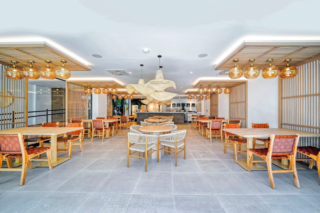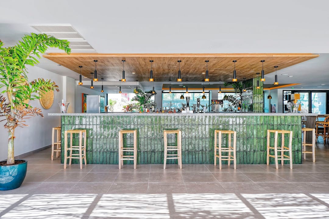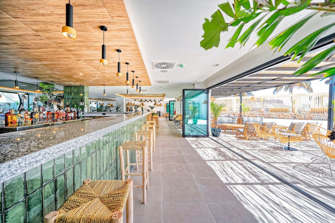The hotel has two pools on a decked terrace. One of these has a couple of whirlpools, and there are two separate splash pools for kids. By the water, you’ll also find a bar that serves drinks and snacks.