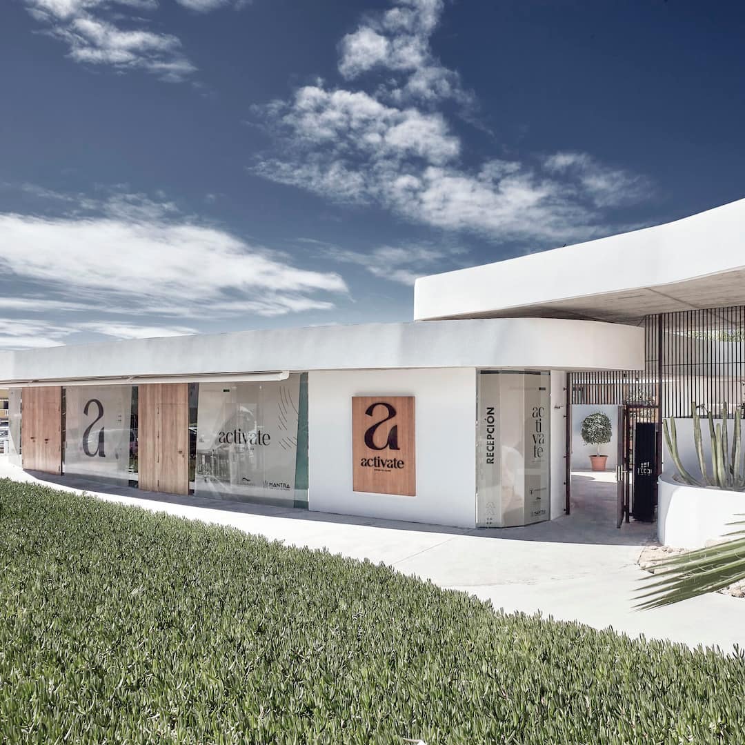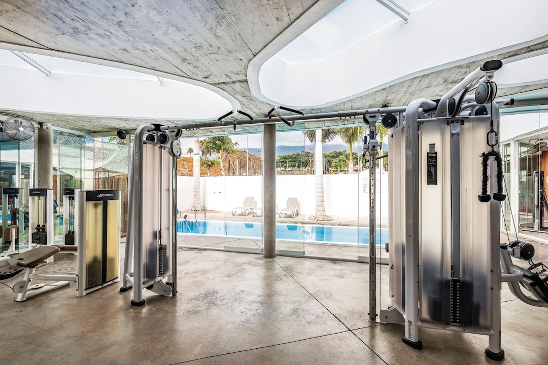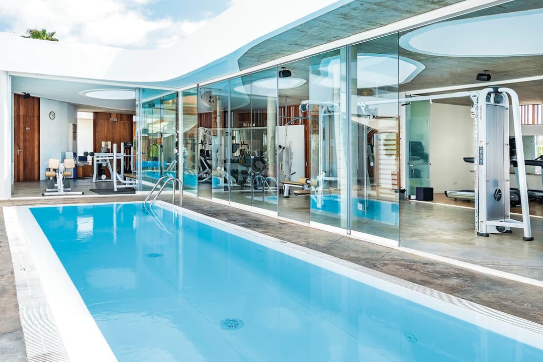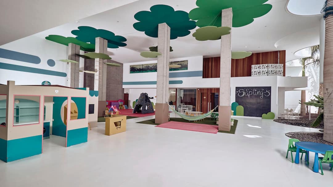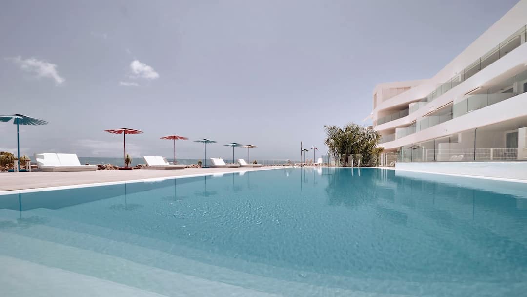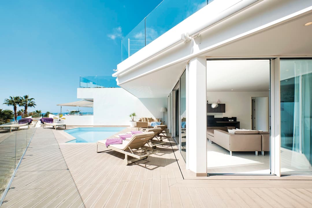 There are a couple of pools split between two storeys, both with a contemporary feel. Multi-coloured parasols line the edges and provide some shade, while the decking is backed by sleek, white balconies. Inside, the rooms are ultra-modern and come with a fully kitted-out kitchen.