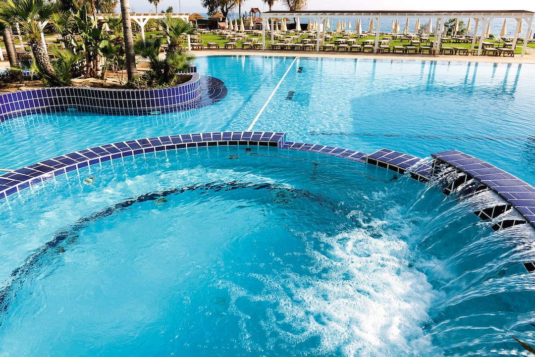 One of the outdoor pools is surrounded by palms and tropical flowers. Teak loungers line the water’s edge and there’s a bar at one end. In the summer, it’s reserved for adults. There’s also an adults-only pool in the spa that has a whirlpool bath.
