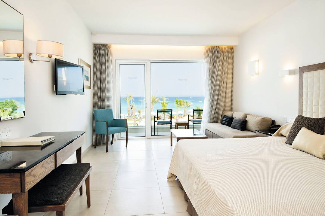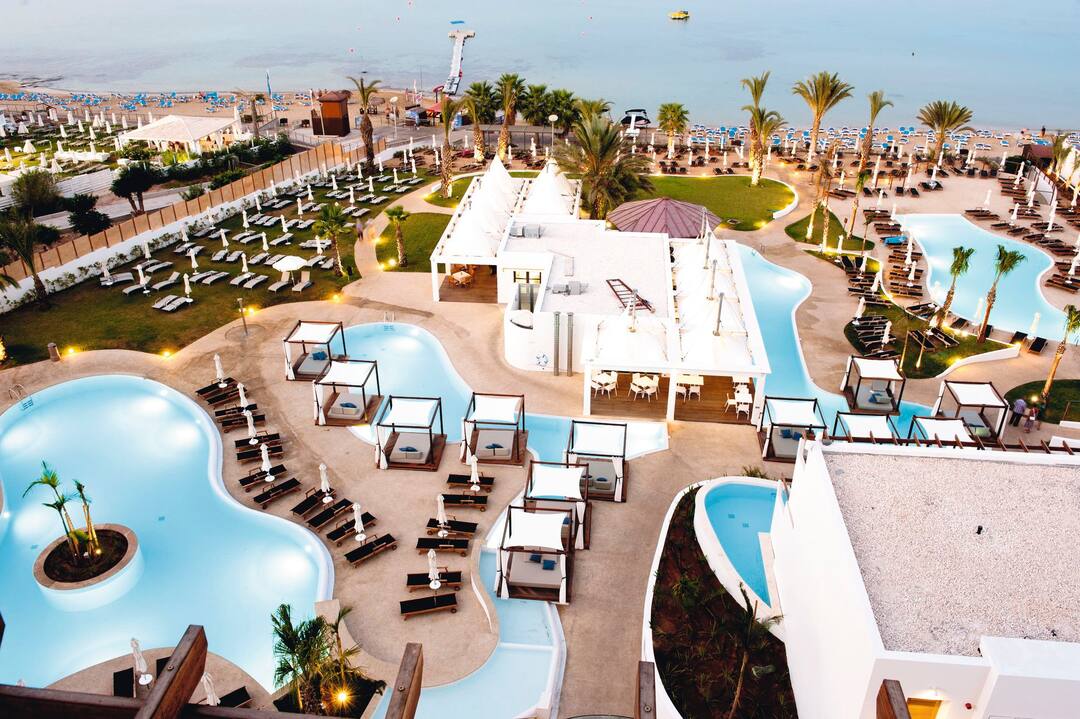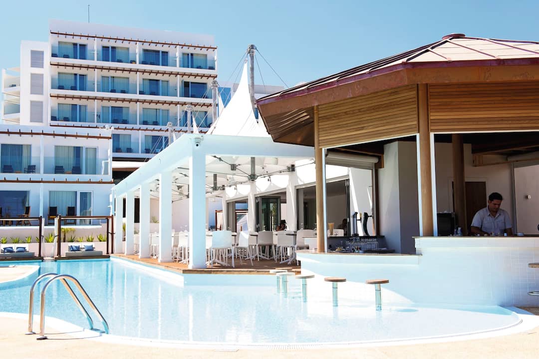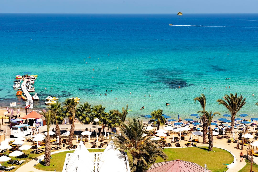 Sunrise Pearl Hotel and Spa is a great choice for holidays to Cyprus and is one of the most luxurious hotels in the region. This five-star get away is right on the beach and only a short walk into central Protaras. The hotel has been finished with modern opulence which sees the pools framed with white parasols and decadent day beds. Inside the hotel, there’s even a glass lift that gives you fantastic sea views all the way up. There are three restaurants on site, and a variety of options ranging from American to Greek and Italian fare nearby.
