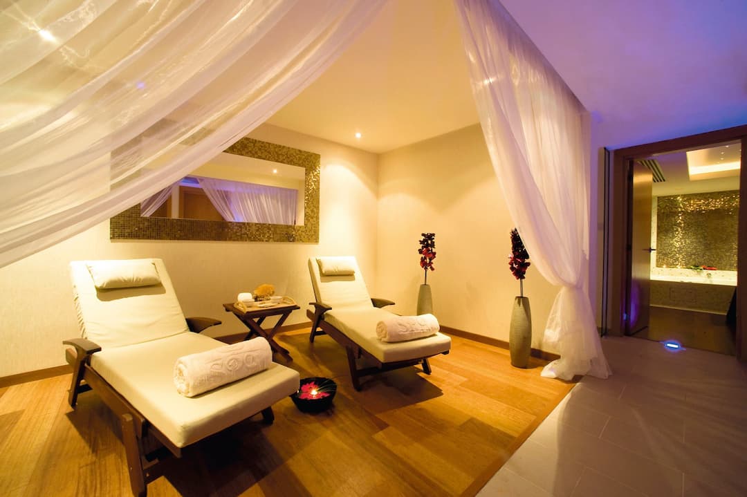 Within the tree-lined grounds of the property, the two interconnected swimming pools have whirlpool baths, and indoors, you’ll also find an extra pool that has massage jets.