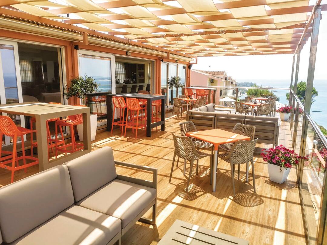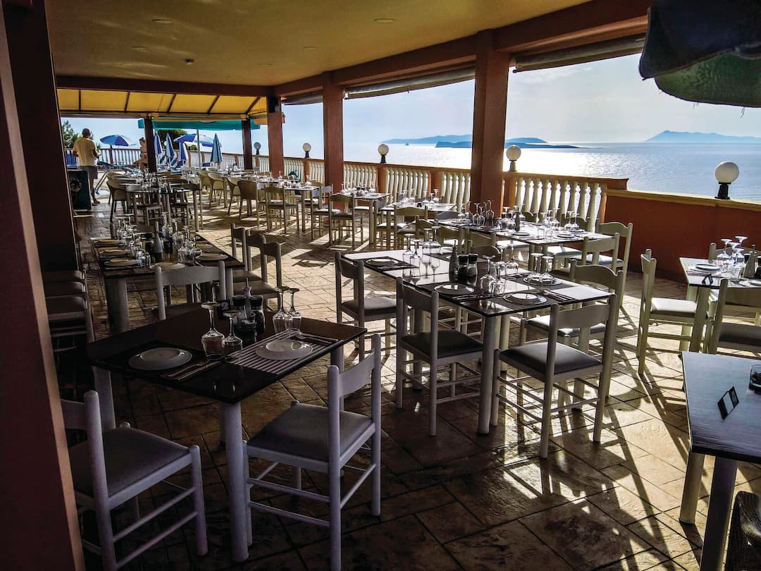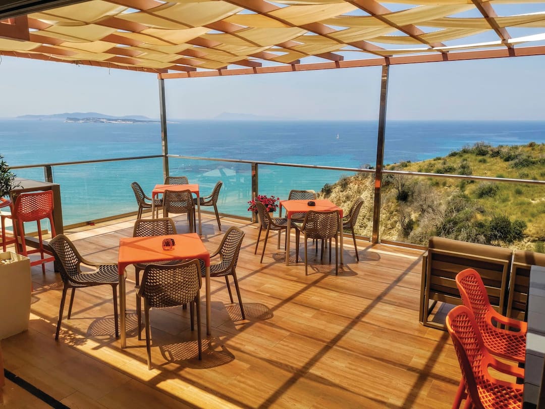 The villa-style Romanza Hotel sits on a cliff above San Stefanos and treats guests to beautiful views across the Ionian Sea.