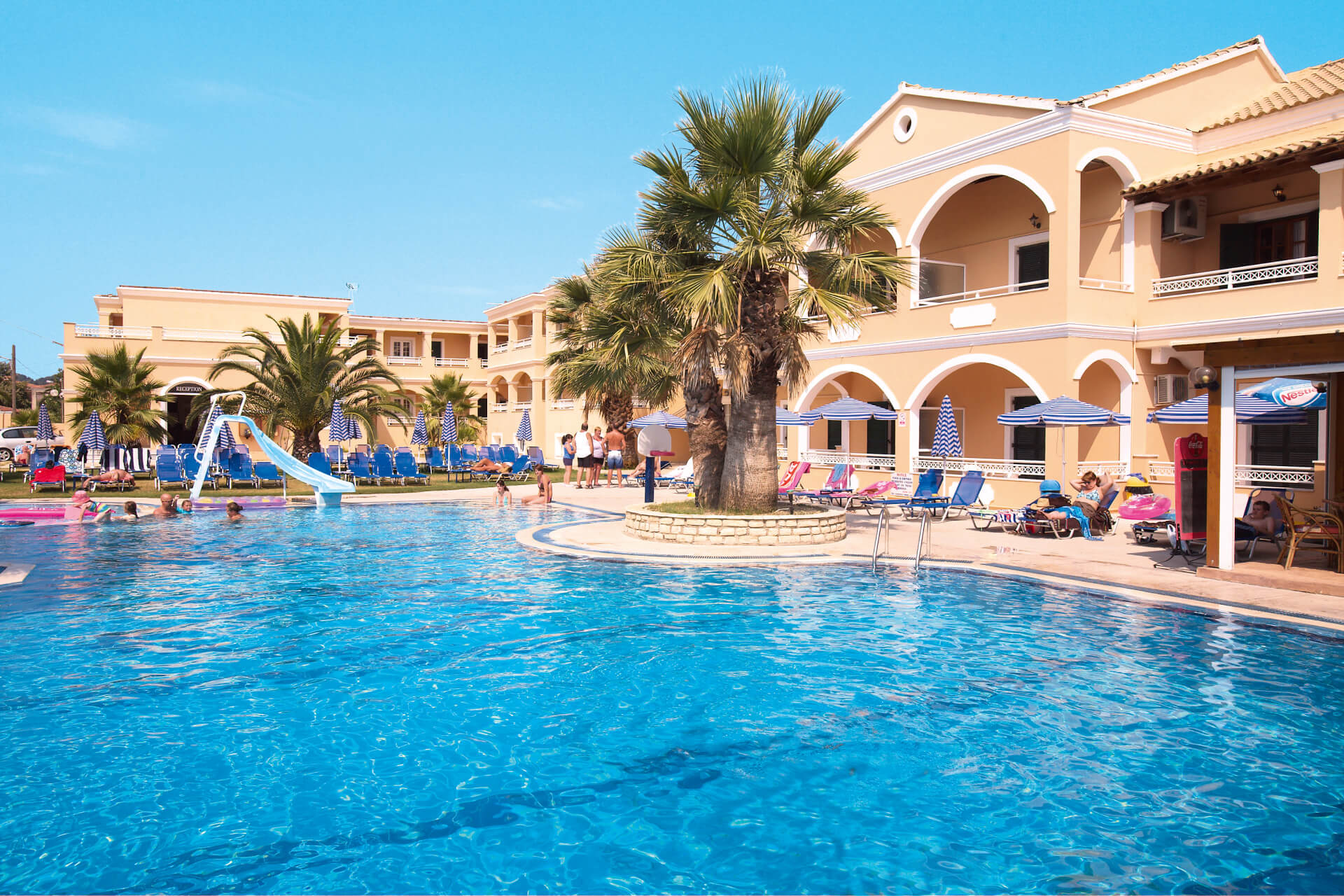 The atmosphere at Lagoon Studios and Apartments is friendly and relaxed. Rooms are arranged around the magnificent lagoon pool and yours will have its own balcony or terrace and a kitchenette for simple meals. You can also head down to the pool-side bar for delicious food served throughout the day. Soak up the sun on the lawns and pool terrace surrounded by shady palm trees, parasols and loungers. Children have their very own splash pool and slide. Once the sun sets, you’ll be entertained with quiz nights, live music and Greek evenings. Sports fans can follow the action on big screens in the bar.