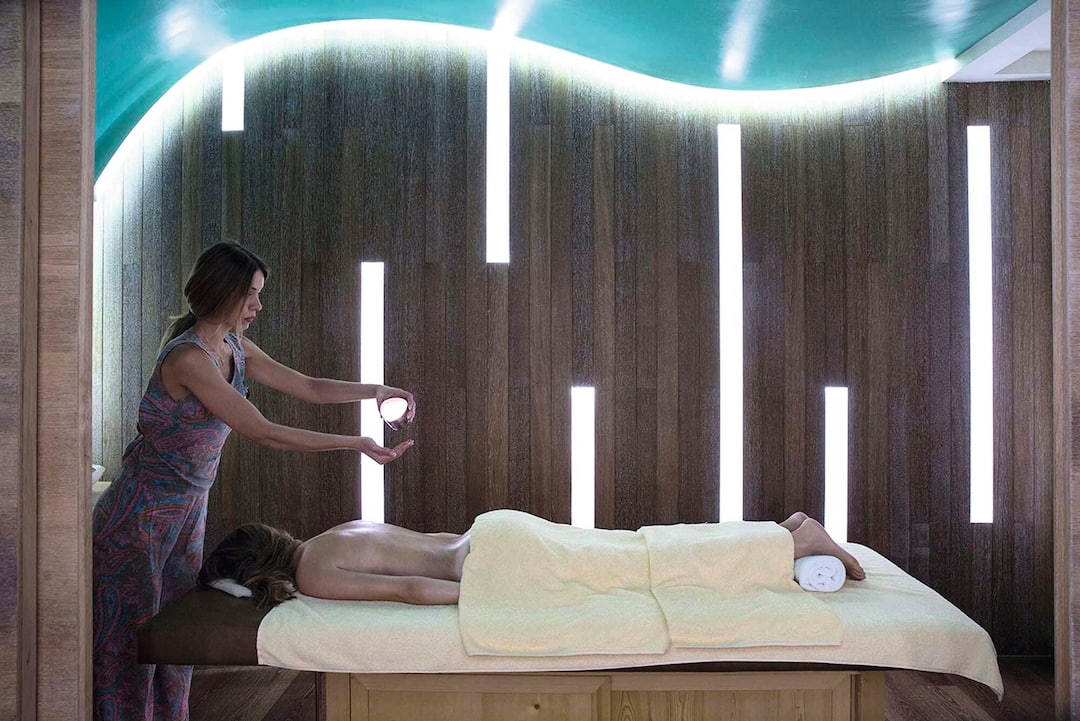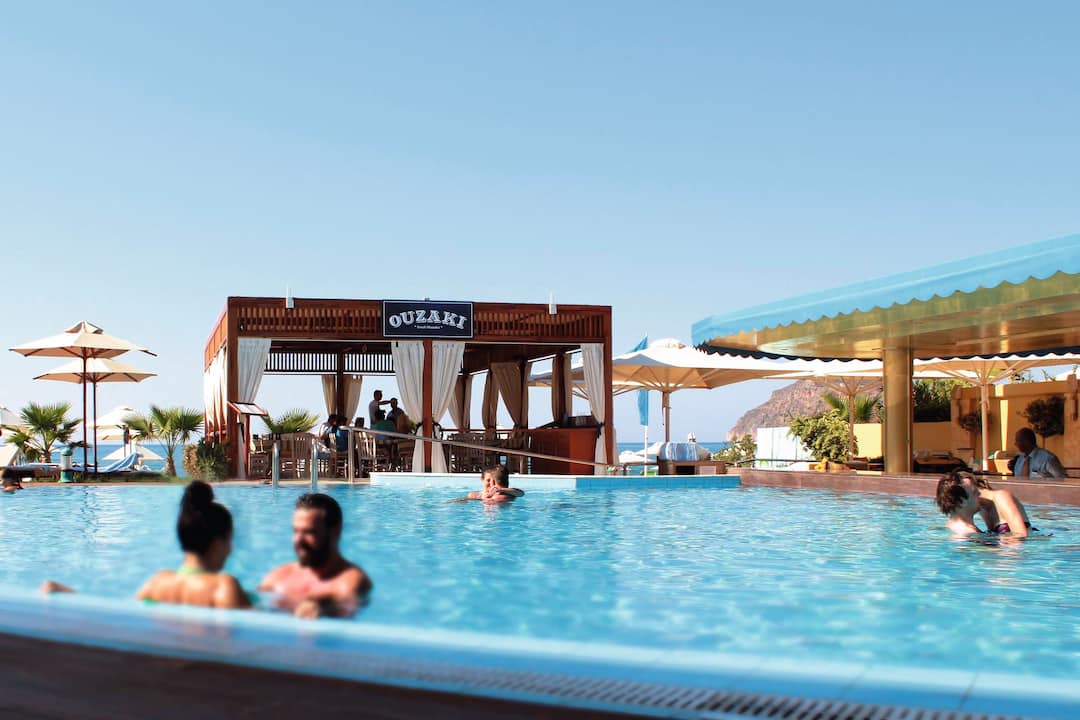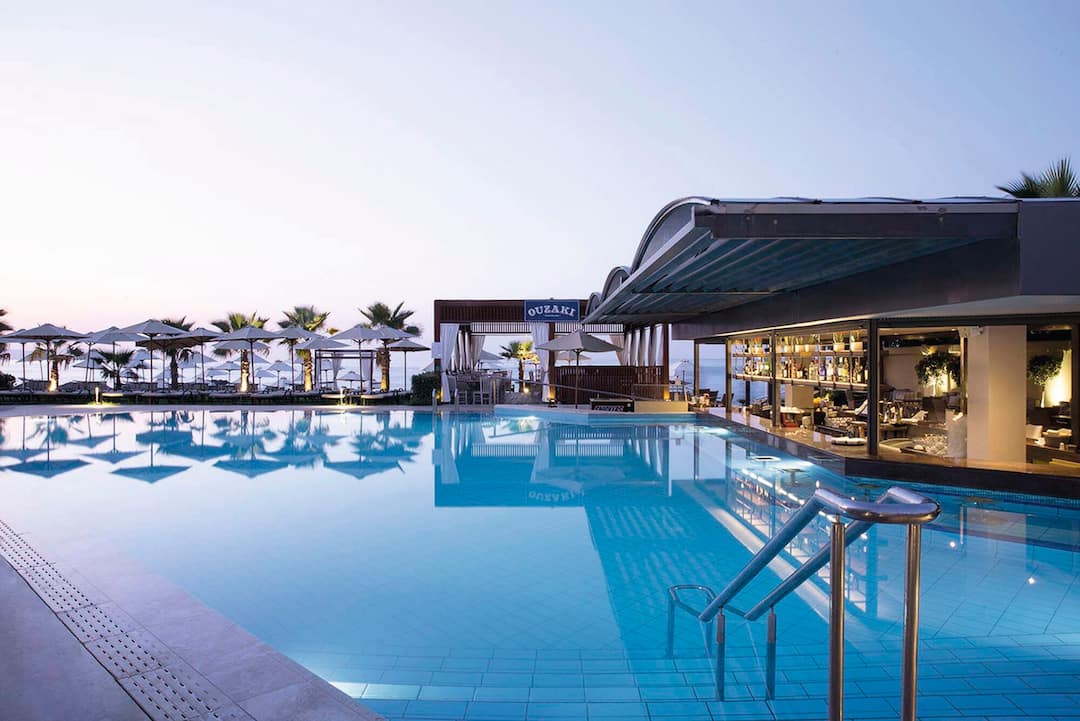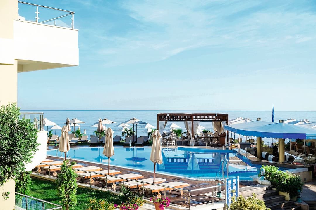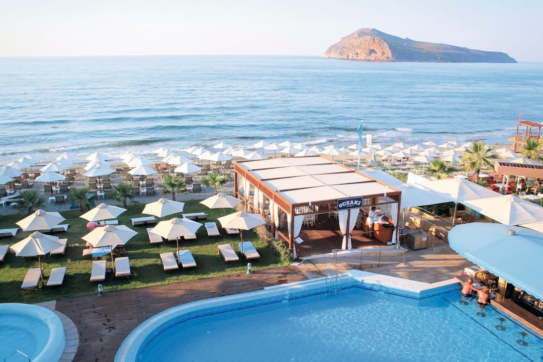 The adults-only Thalassa Beach Resort has a seafront location and swish pool scene. The hotel’s interiors are really smart, too. The marble lobby features bronze and gold accents, and it’s much of the same in the bedrooms. The hotel even has its own contemporary art gallery.