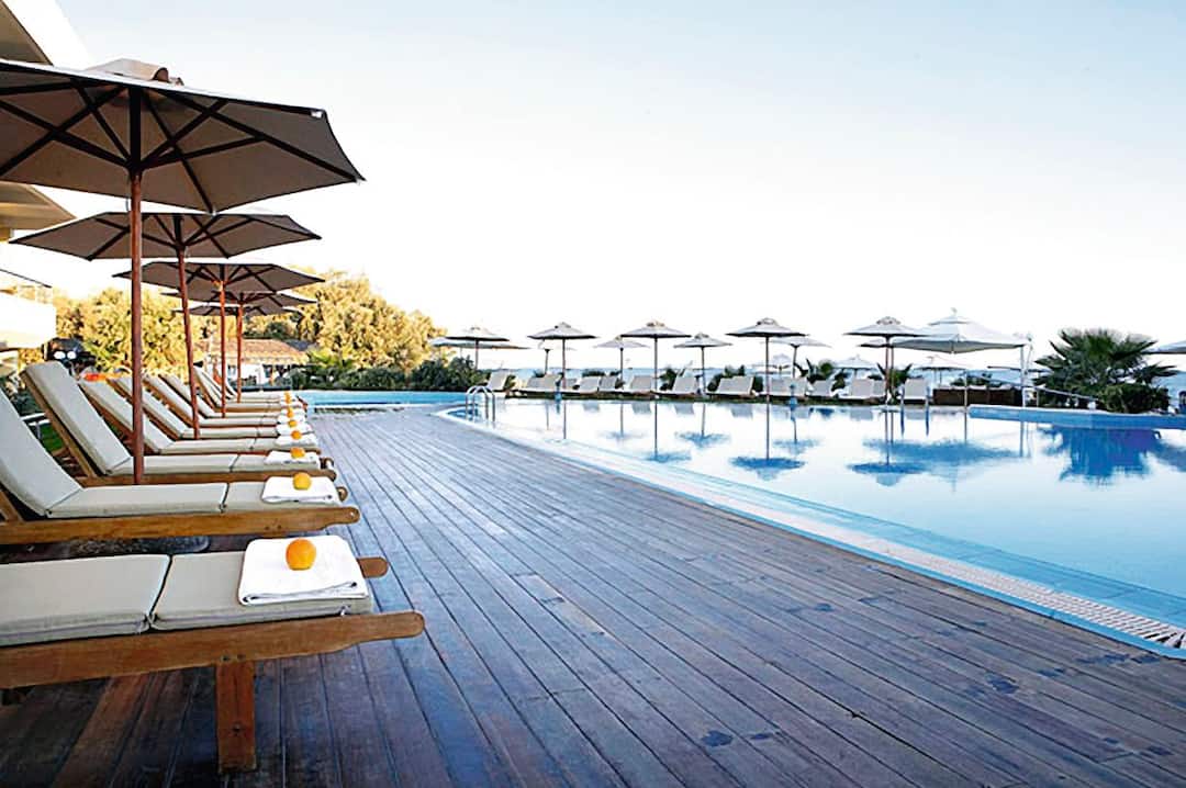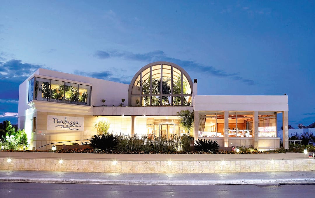 The Thalassa Beach Resort is sidled up next to a stretch of sand overlooking the Mediterranean Sea and Thodorou Island.