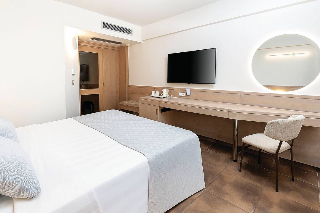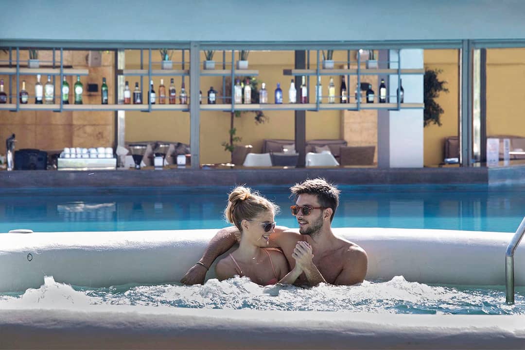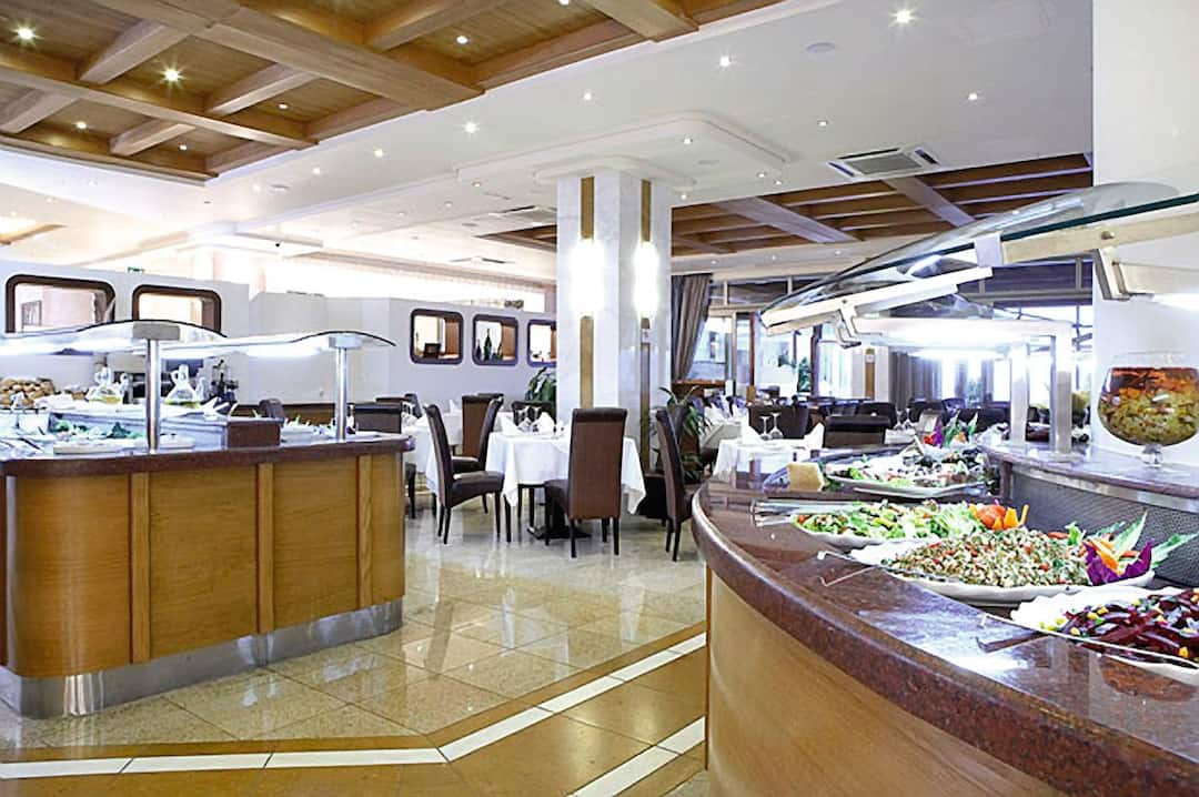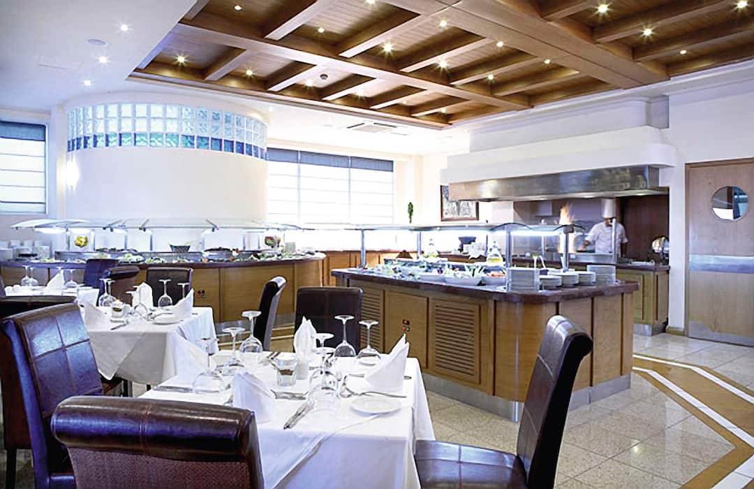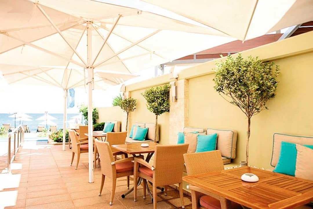 Outside, the swimming pool has a seaside position, smart wooden decking and stylish loungers. There’s a swim-up bar and neighbouring whirlpool, too. The main restaurant serves up buffets with a cheeky glass of fizz in the morning! And in the evening, it serves an a la carte menu of modern Mediterranean cuisine.