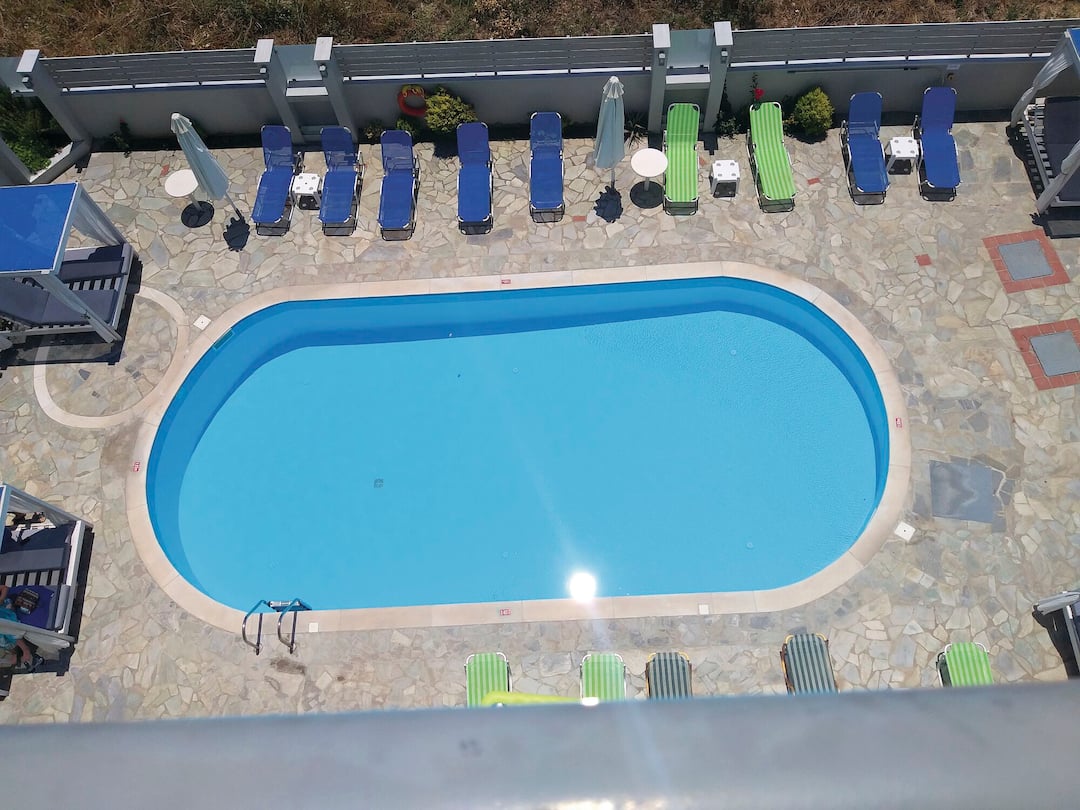 Outside, there’s an oval-shaped pool that includes an add-on section for children. The sun terrace is bordered by trees and there’s also a bar that provides drinks and snacks by the water’s edge.