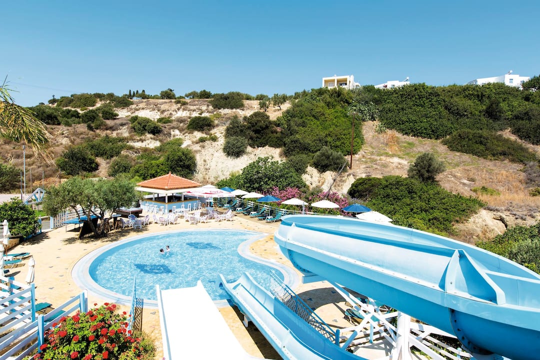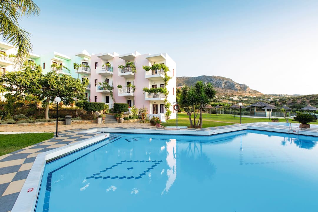 At the Bellos Apartments, pastel-coloured apartment blocks, palm-studded grounds and a great pool scene will wow you from the very first second you walk through the doors.