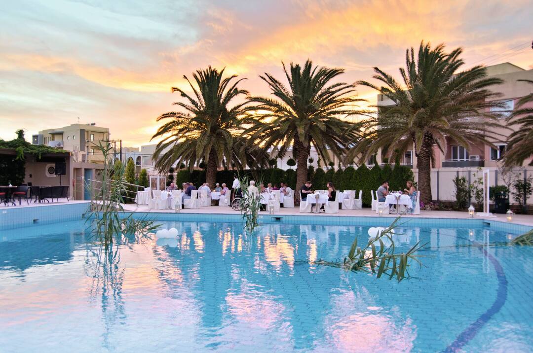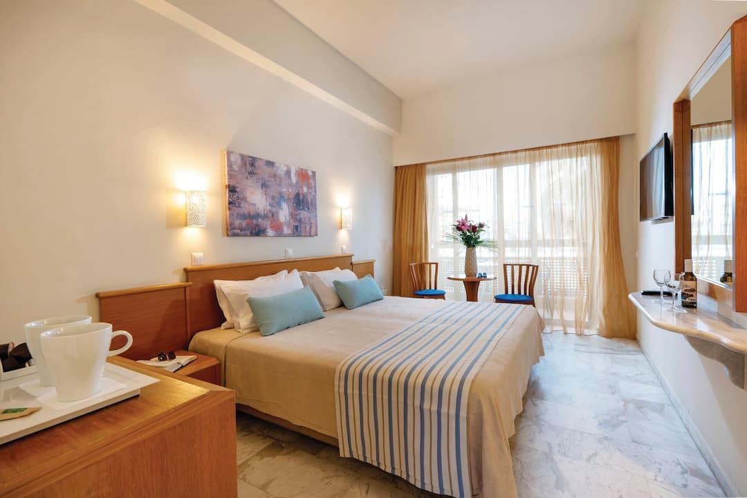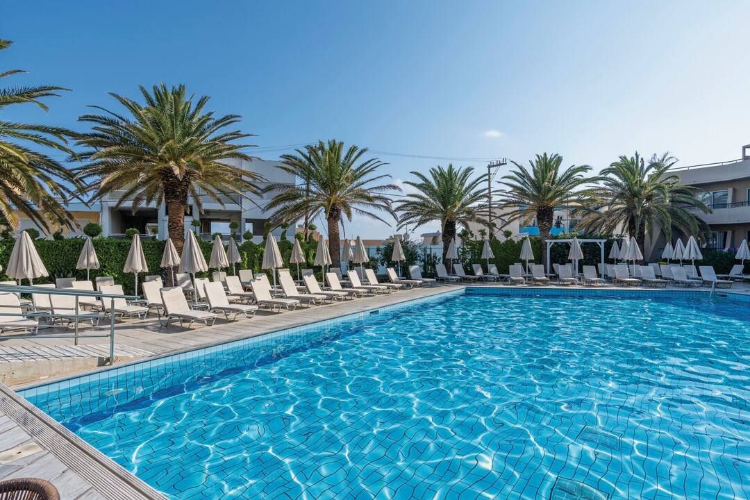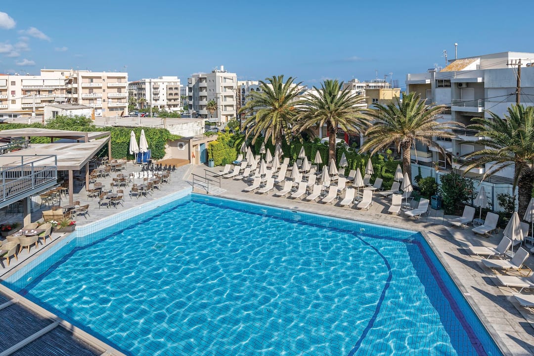 Families love the spacious rooms and the lively pool scene at the Minos Hotel.