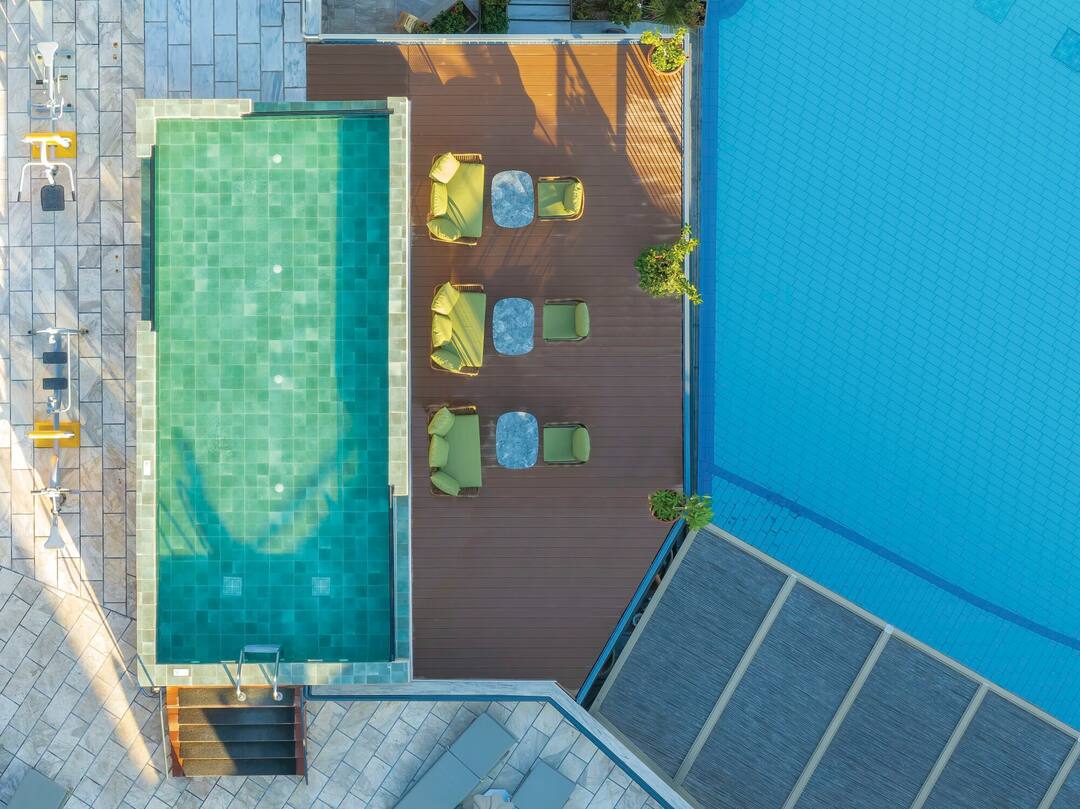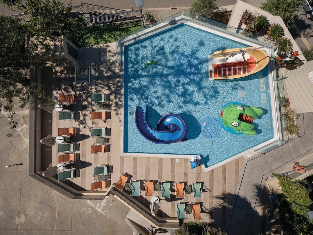 A pair of swimming pools steal the limelight – they sit on a sun terrace lined with loungers and parasols. There’s also a cafe on the side that serves cocktails and classic Mediterranean lunches.