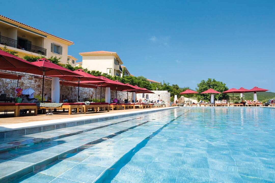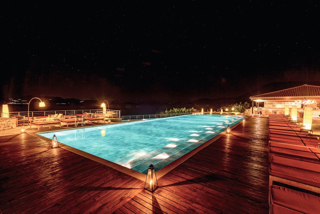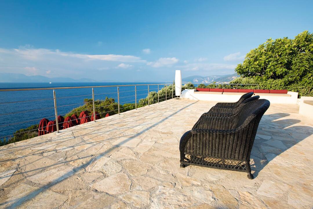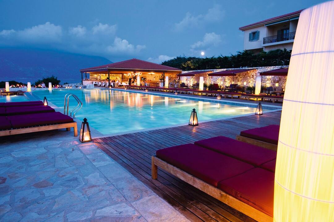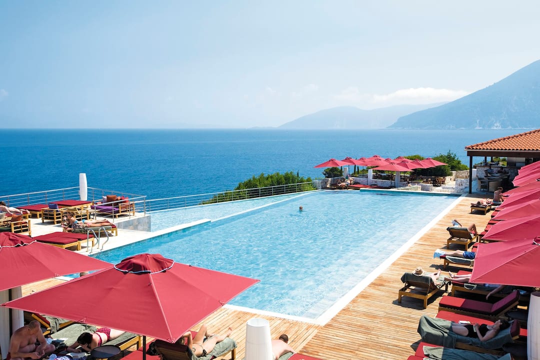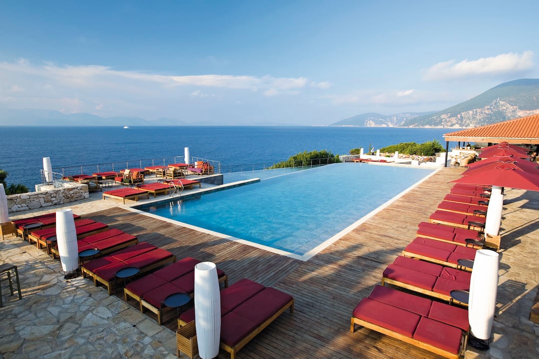 The hotel has been designed to look like a cluster of villages. Surrounded by cypress and cedar trees, it provides beautiful views over Ithaca. For a spot of additional luxury, there’s a walk-in infinity pool with views over the bay. There’s also a tennis court and a squash court.