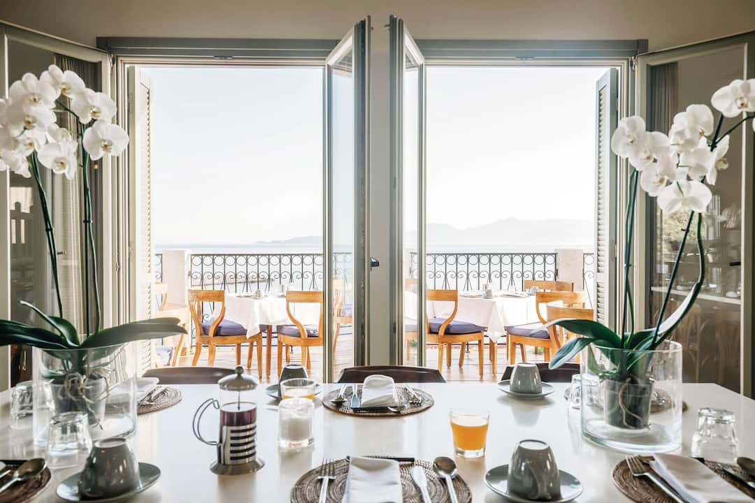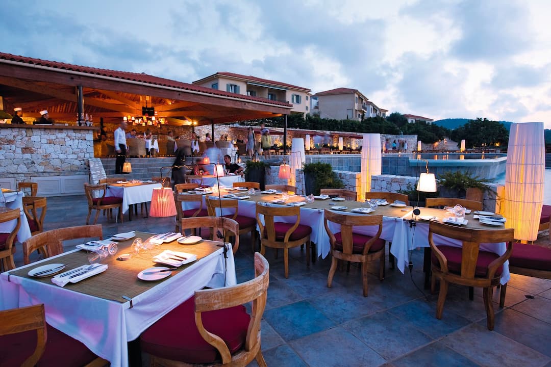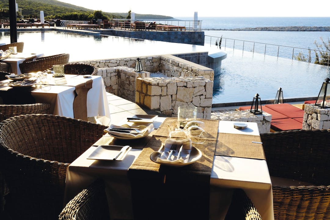 In the morning, the hotel bakes its own bread and pastries, which are served in a restaurant that overlooks the sea. For lunch, expect waiter service at the poolside restaurant. In the evening, there’s a choice between the main restaurant and an a la carte.