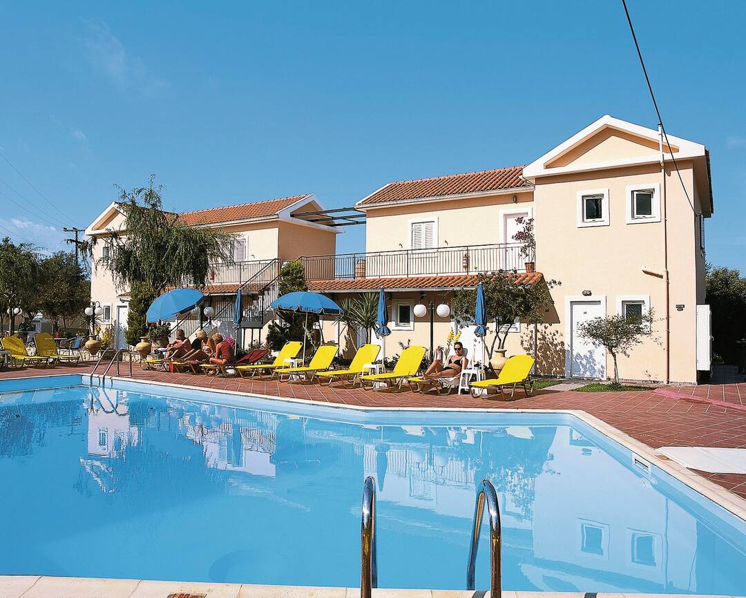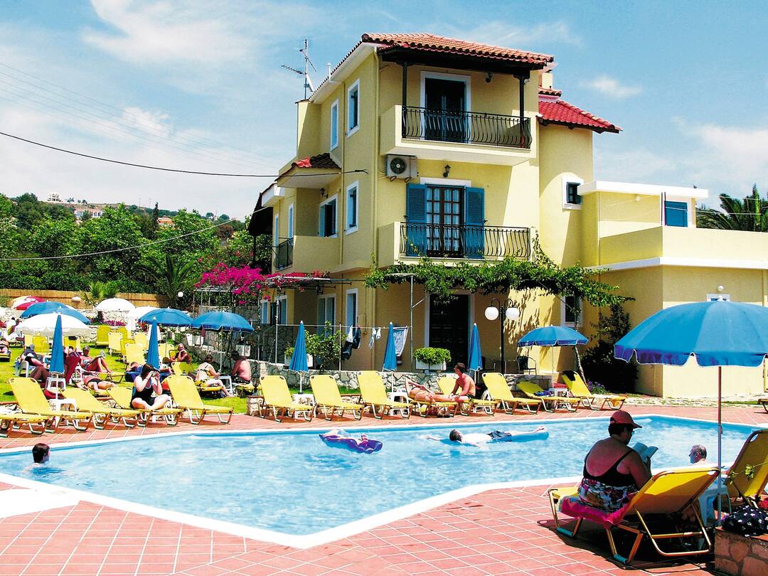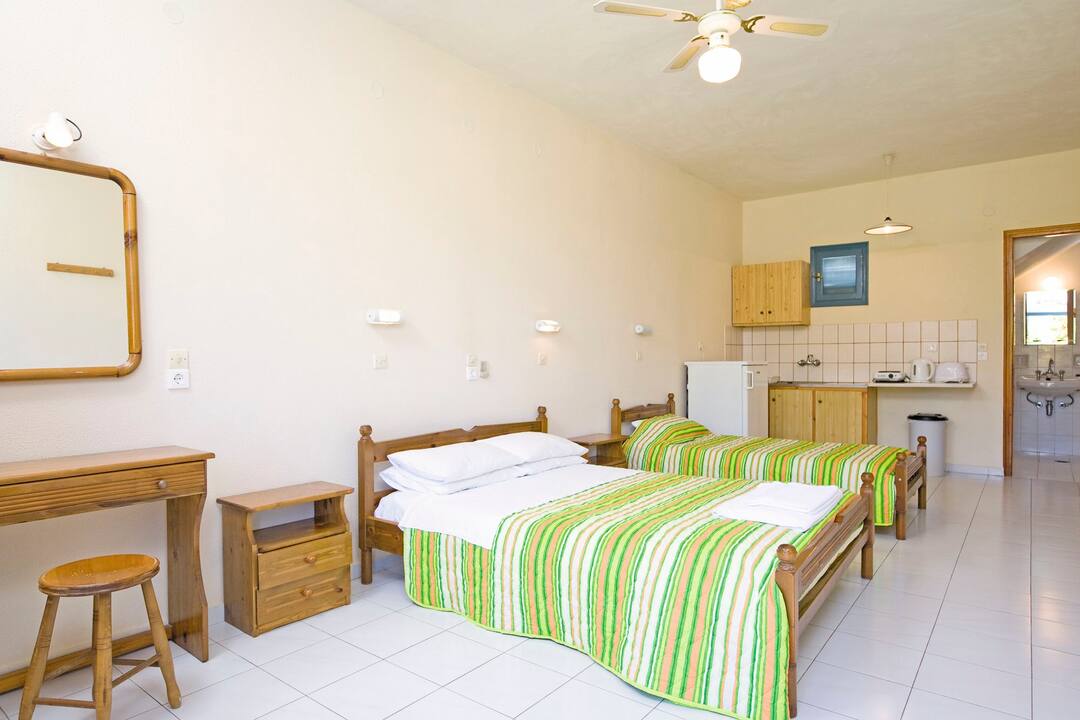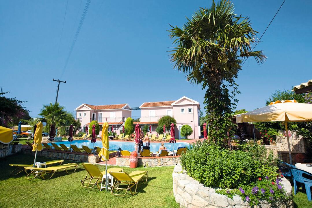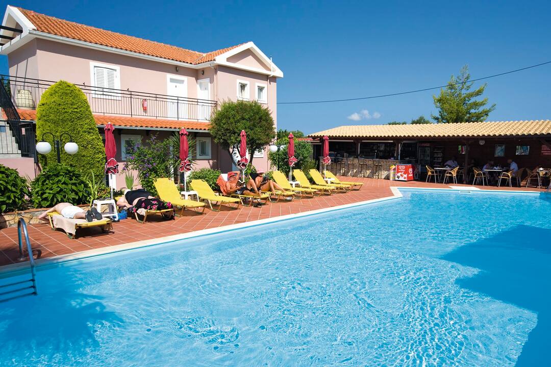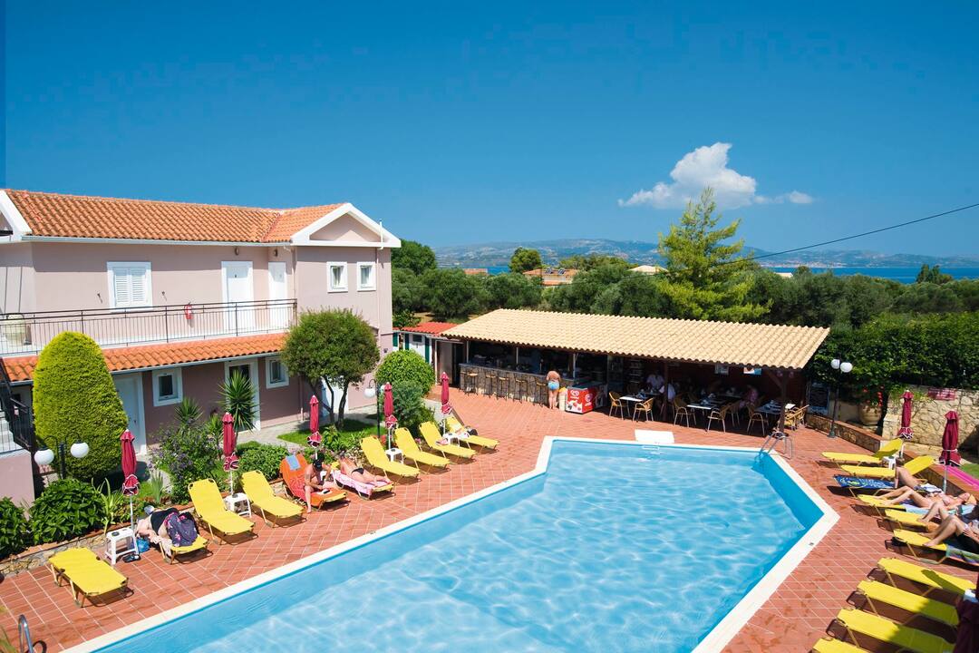 The Marianna Studios offer a real homely feel for your stay in a peaceful setting just a stone’s throw from the sandy shores of Lassi. The pool is on a spacious sun terrace with sun loungers and parasols, plus, the luscious green lawn makes for extra sunbathing space or an area for the kids to play. You’ll find an inviting pool bar that serves up refreshments and a mix snacks to keep you going throughout the day. All of the studios are good sizes with a fully equipped kitchenette so you can cook up a storm for dinner – then you can sit out on the terrace or balcony and enjoy the sunset.
