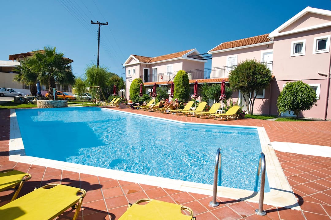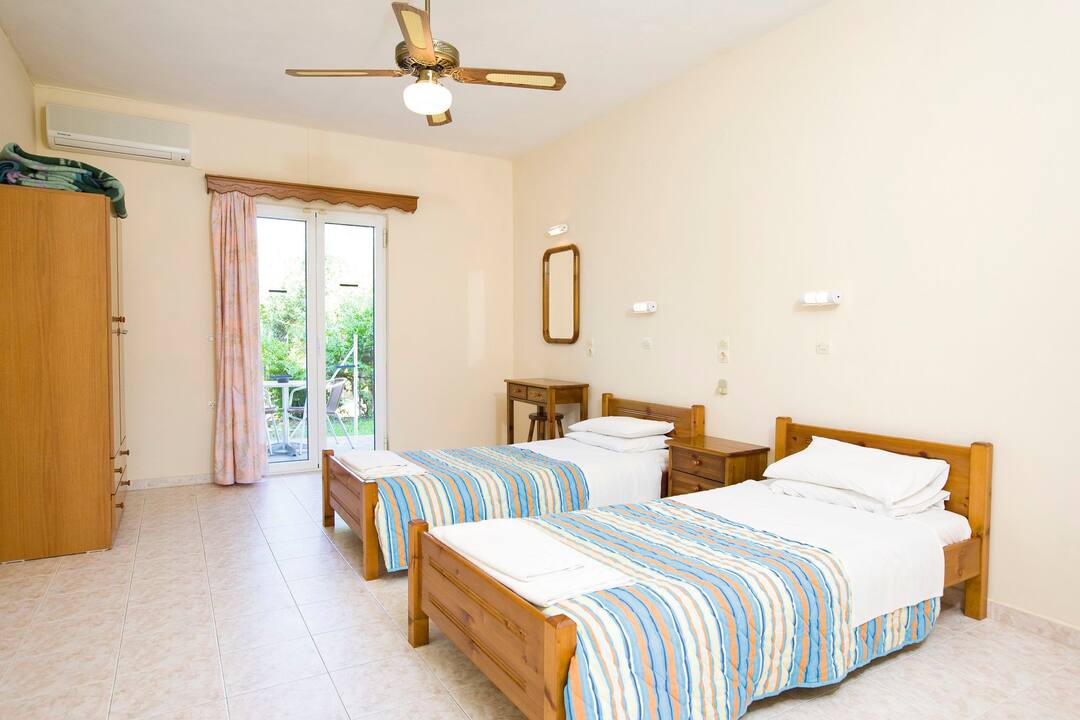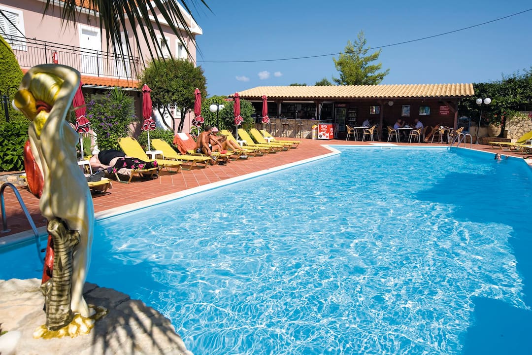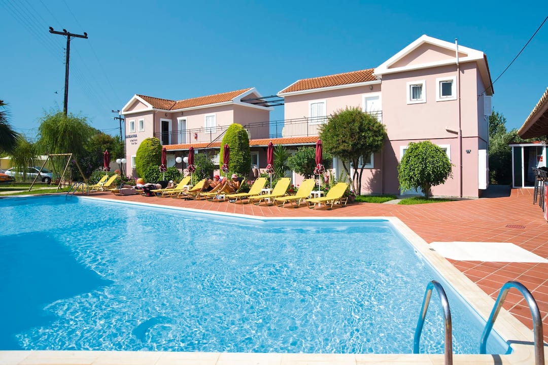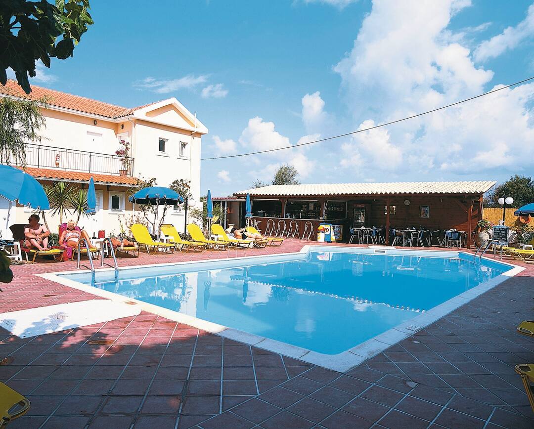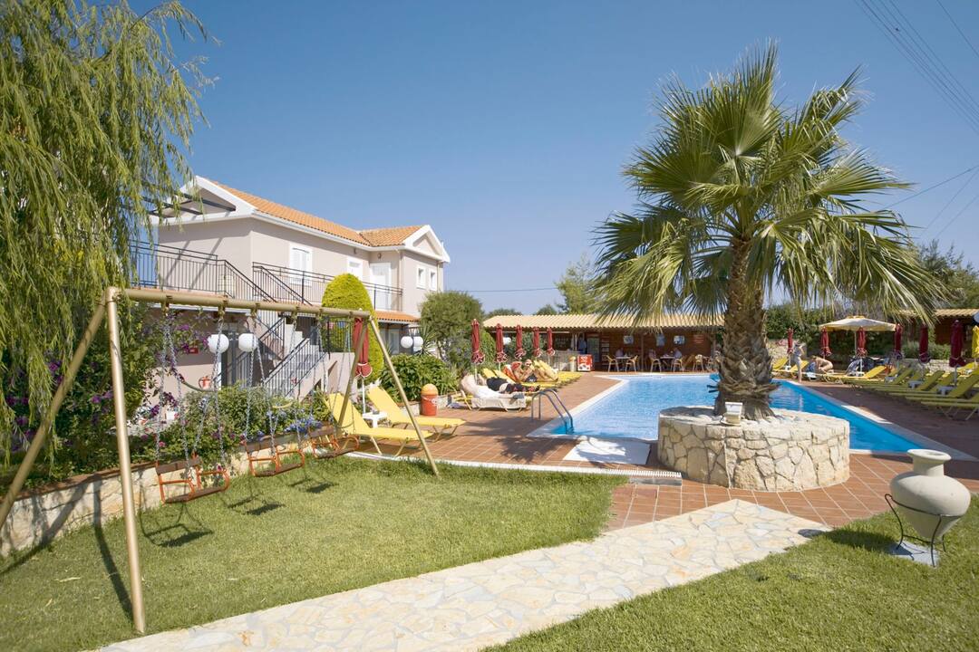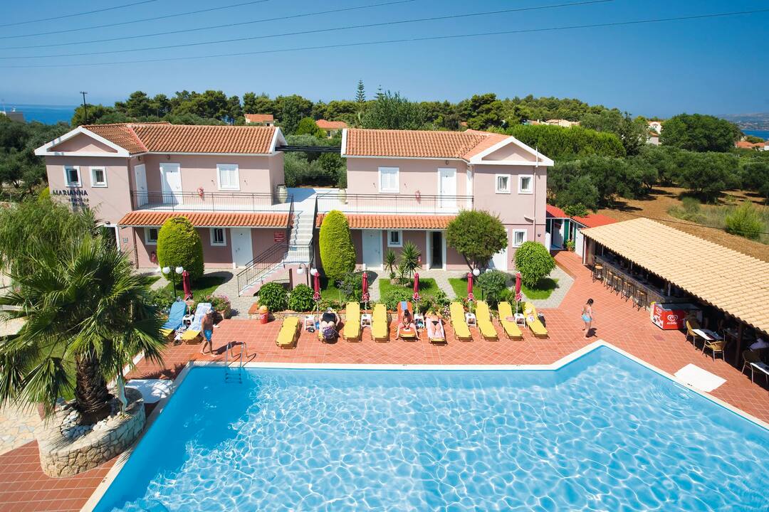 The Marianna Studios offer a real homely feel for your stay in a peaceful setting just a stone’s throw from the sandy shores of Lassi. The pool is on a spacious sun terrace with sun loungers and parasols, plus, the luscious green lawn makes for extra sunbathing space or an area for the kids to play. You’ll find an inviting pool bar that serves up refreshments and a mix snacks to keep you going throughout the day. All of the studios are good sizes with a fully equipped kitchenette so you can cook up a storm for dinner – then you can sit out on the terrace or balcony and enjoy the sunset.