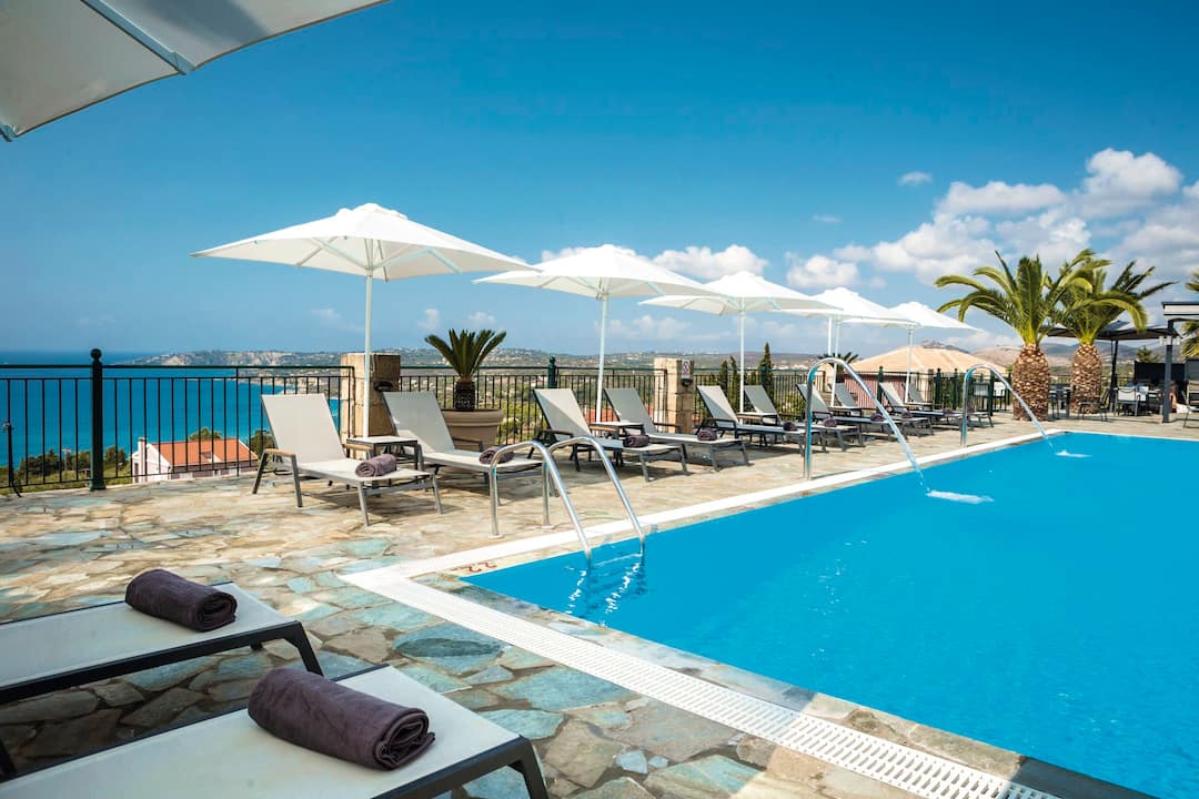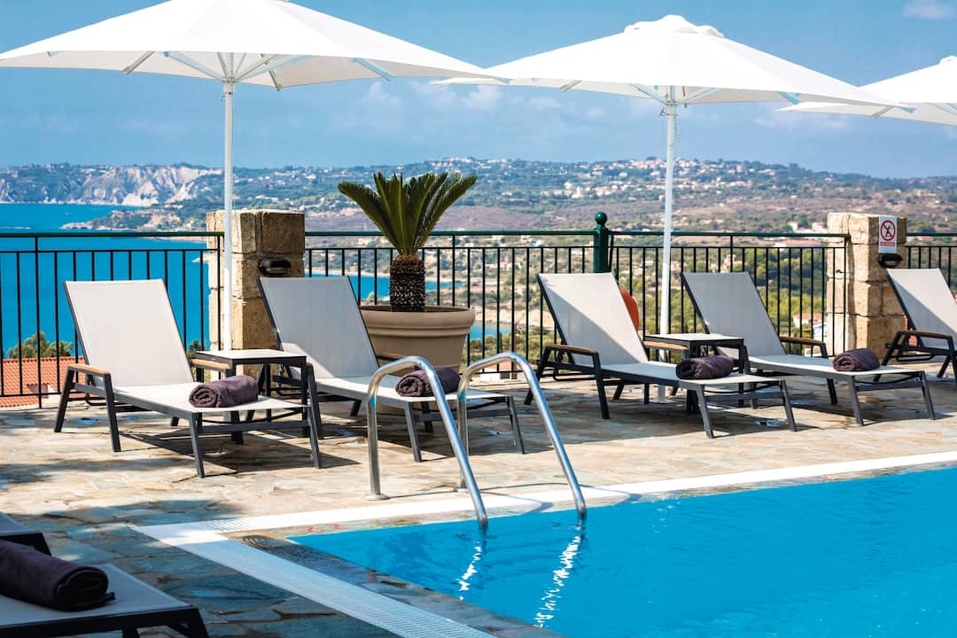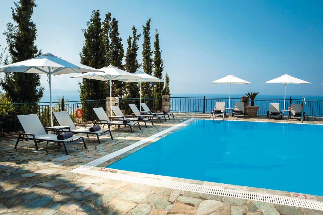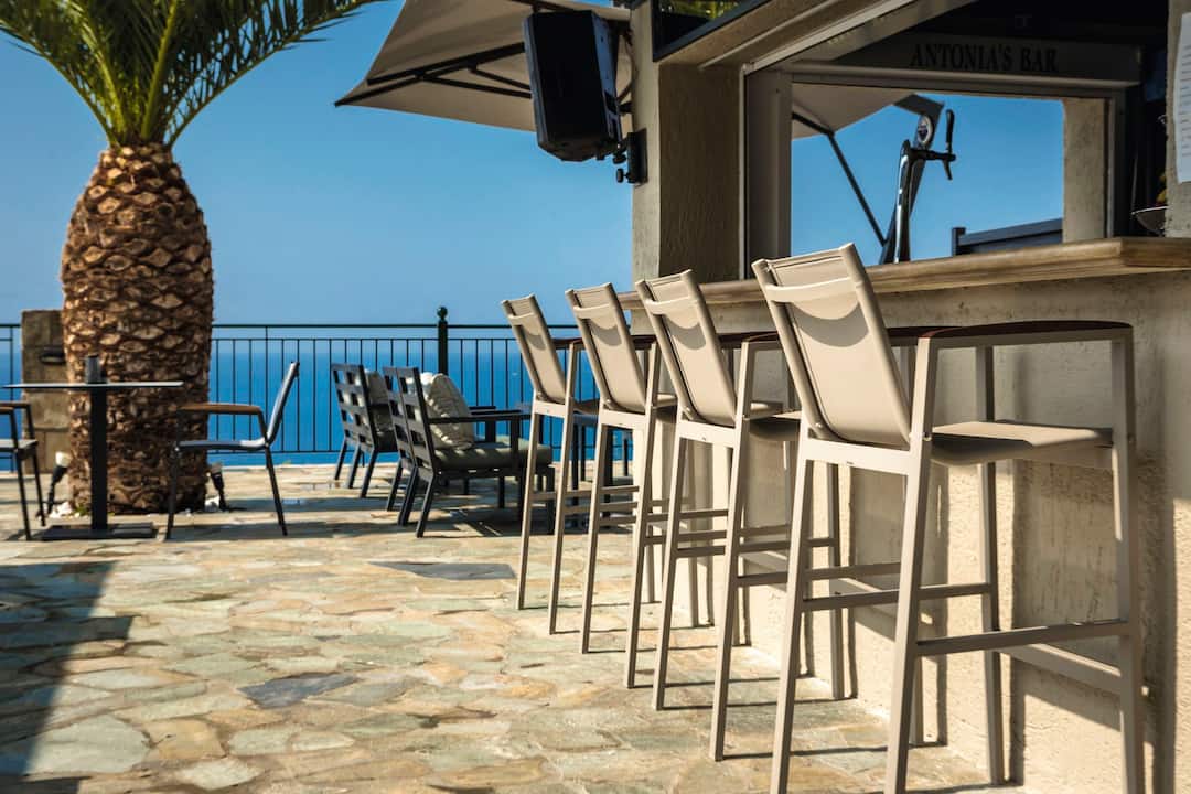It’s a self-catering set-up at the Antonia Hotel, so each studio comes with a kitchenette. A collection of loungers and parasols gather around the edge of the rectangular pool, and just a few steps away there’s a snack bar. This whole area overlooks the Aegean Sea, and you can see as far as Zante on a clear day.