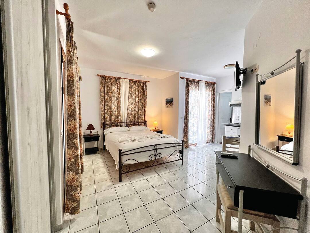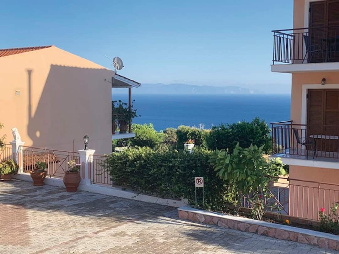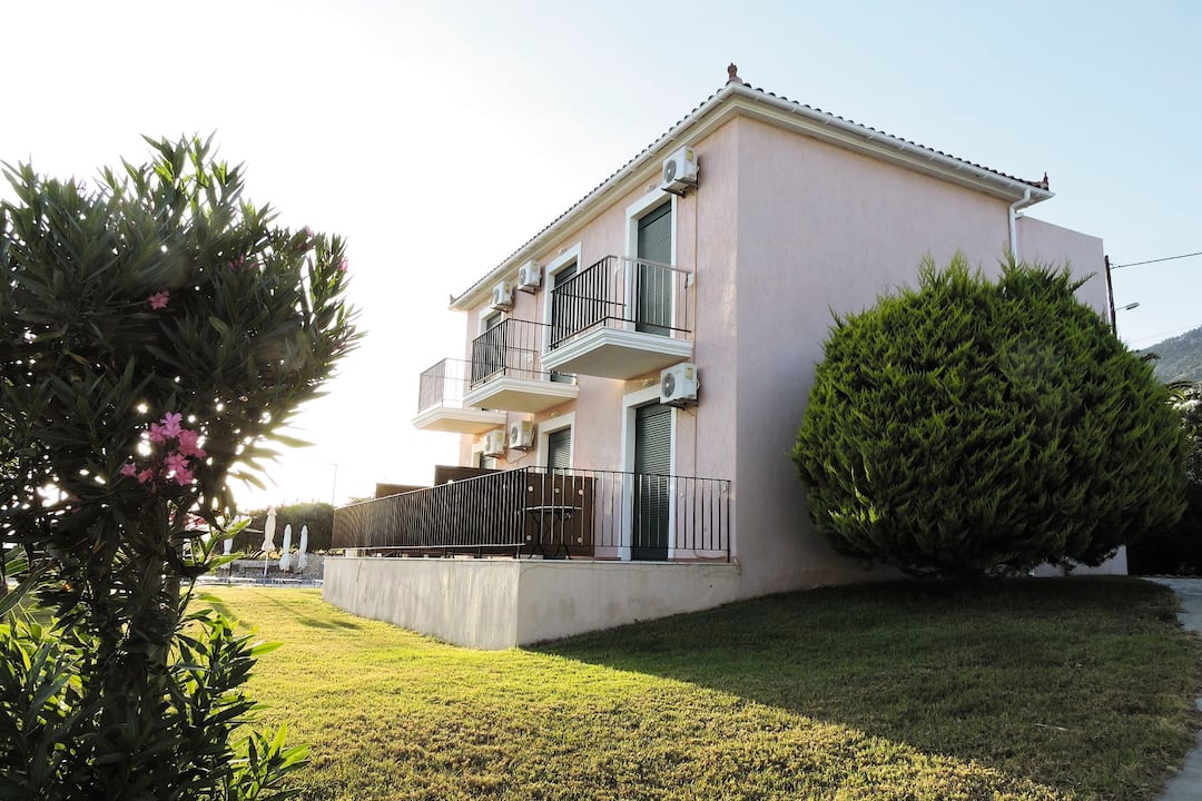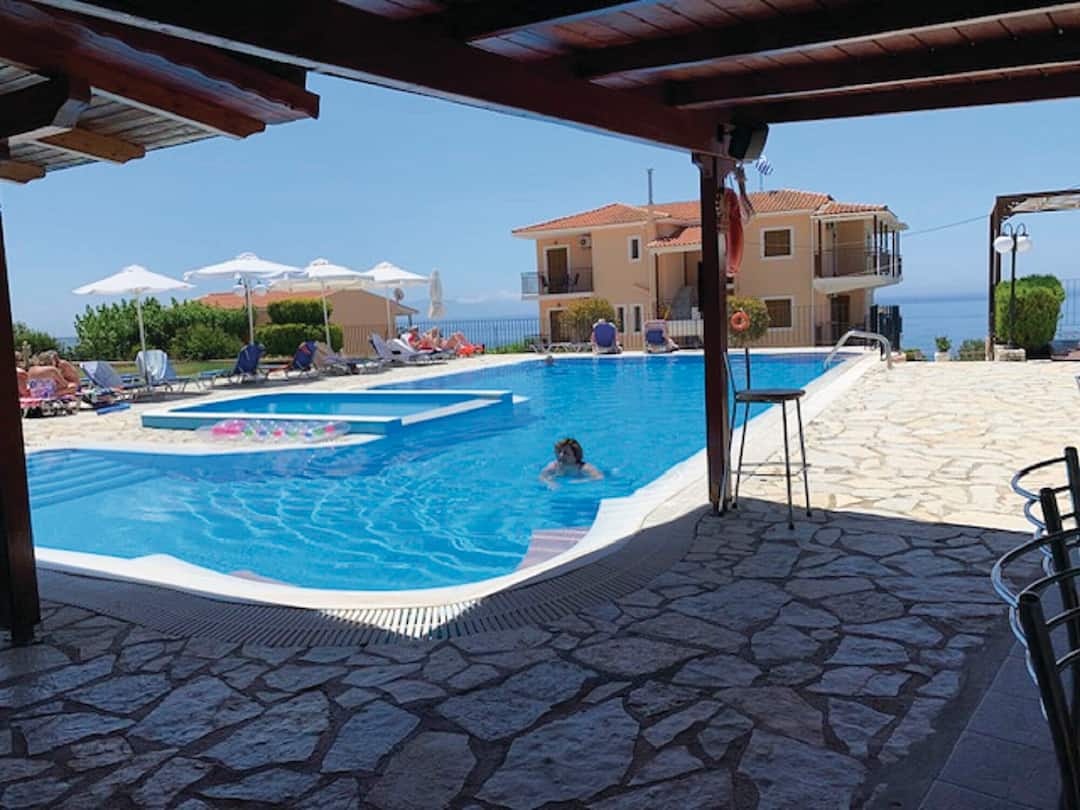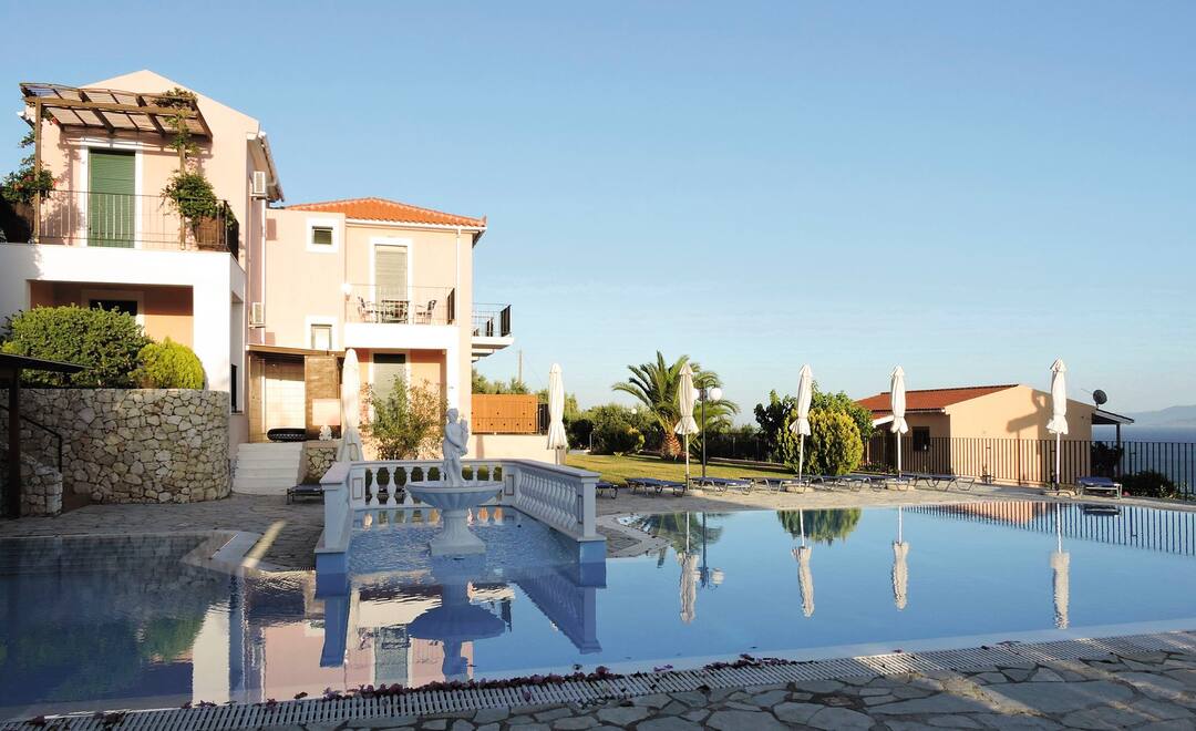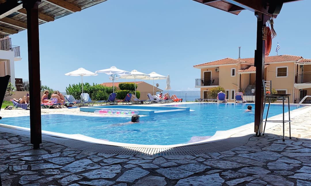 The Aristomenis Studios is anchored into the hillside overlooking Lourdas. Thanks to its sea-view pool, spacious rooms and classic Greek hospitality, it’s a big favourite.