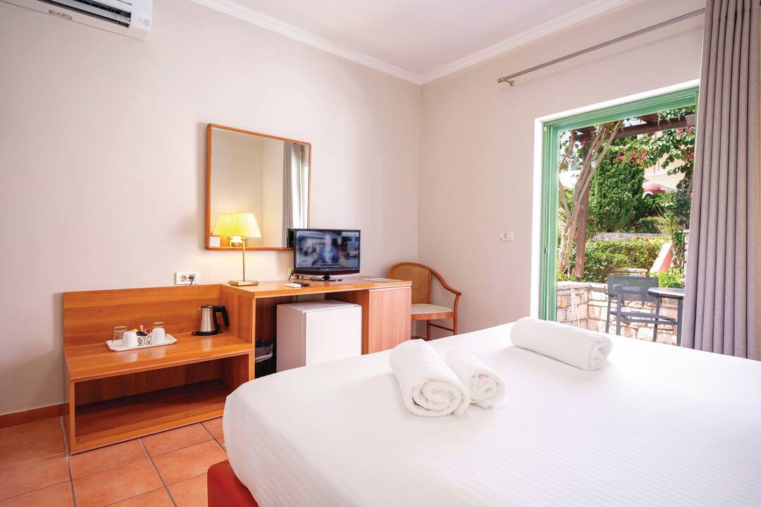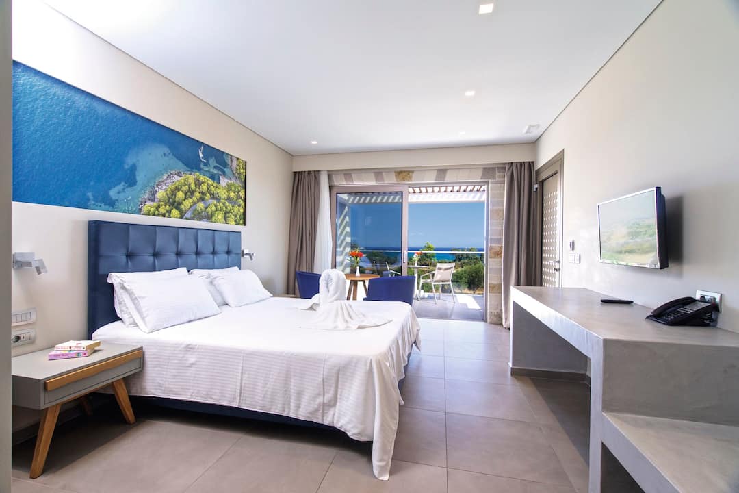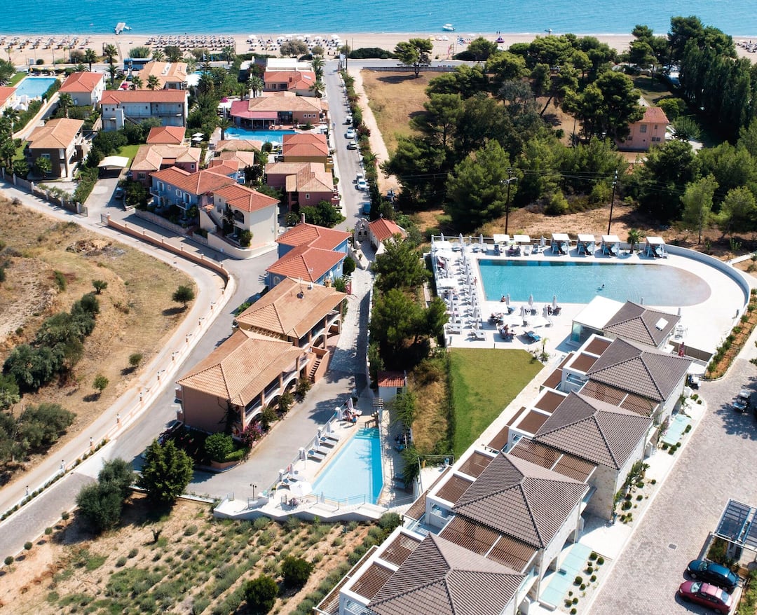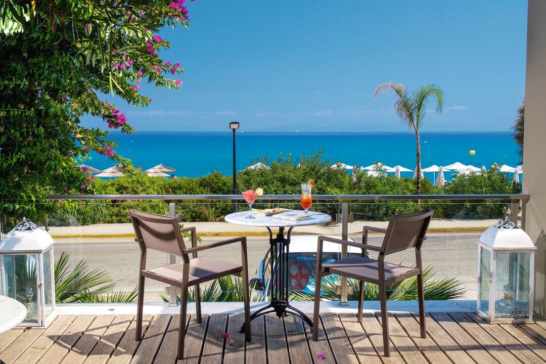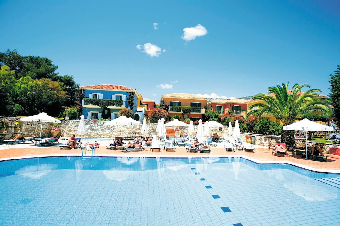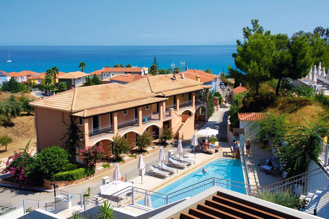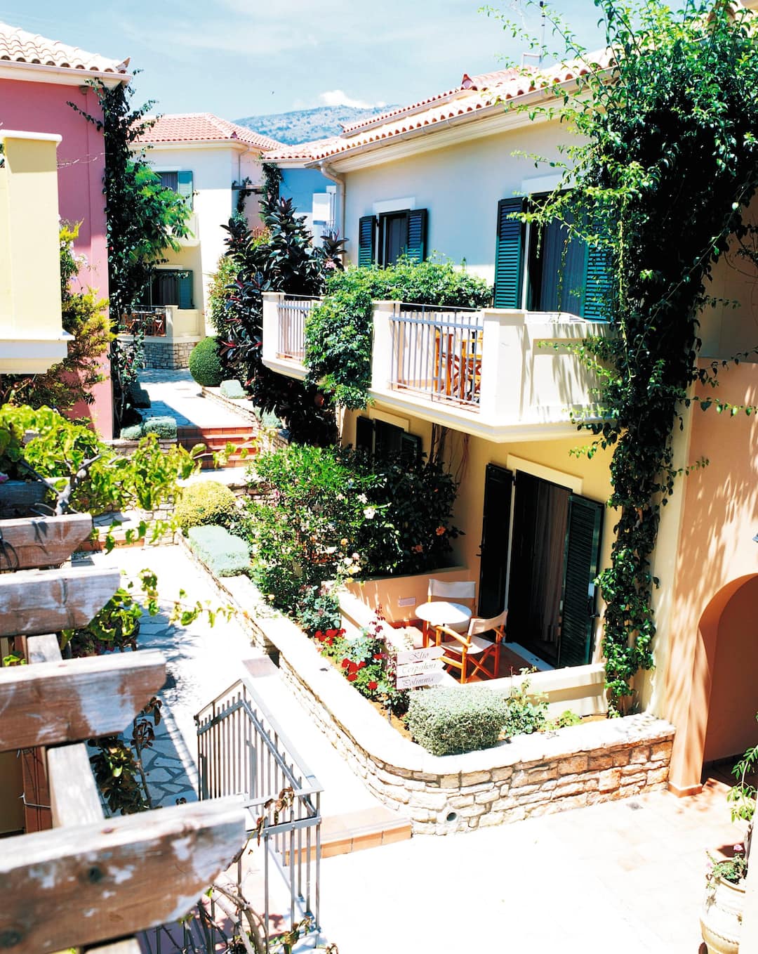 Close to the beach and with a relaxation pool on site, there’s a distinct village-feel about the Nine Muses. Here, flower-lined pathways and pastel-coloured buildings nestle against the shoreline.