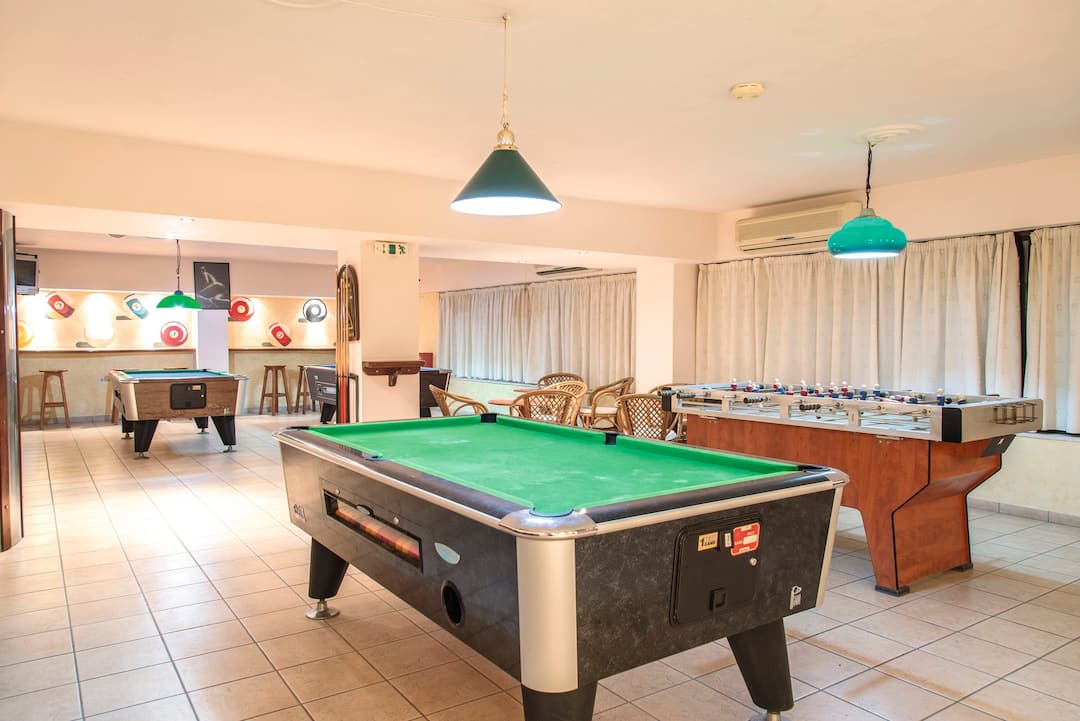 The pool is dressed for summer thanks to canary-yellow parasols and electric-blue loungers. Pull up a stool at the bar and you can order draught beers, local wines and cocktails. There’s also a balcony above the bar that’s set up for games, with three tables for pool and one for table football.