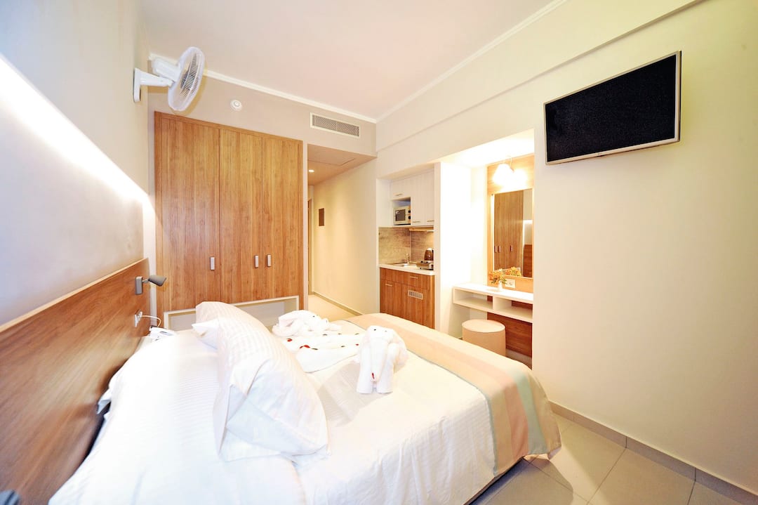At the Astron Suites and Apartments, you’re tucked between a golden-sand beach and the buzz of Kos Town’s harbour. If you stroll all the way around the harbour, you’ll also reach the impressive Castle of the Knights. For more history, head to the Casa Romana museum or the Tree of Hippocrates.