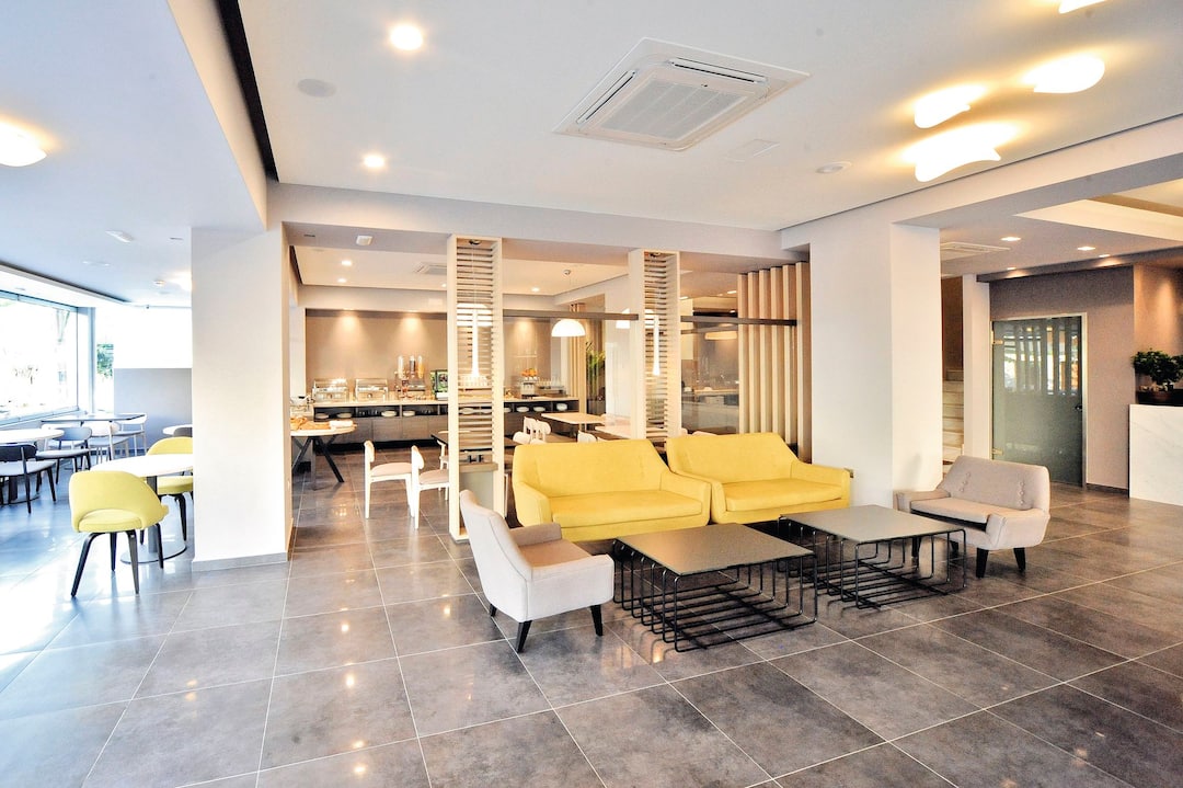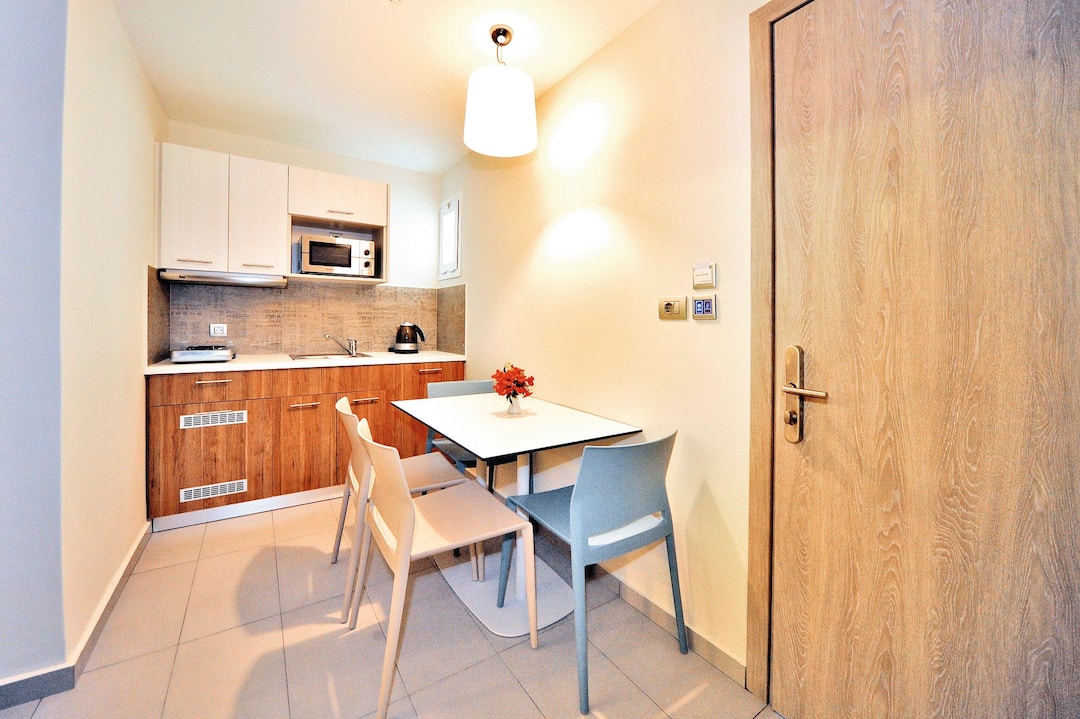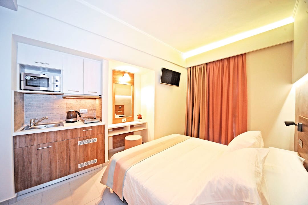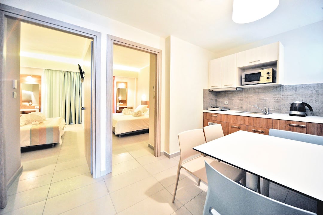 Rooms and apartments are fitted with kitchenettes, so it’s easy to rustle up your own meals. When you’d rather not cook, you can enjoy a breakfast buffet either in the dining room or out on the terrace. There’s also a snack bar by the pool for light bites.
