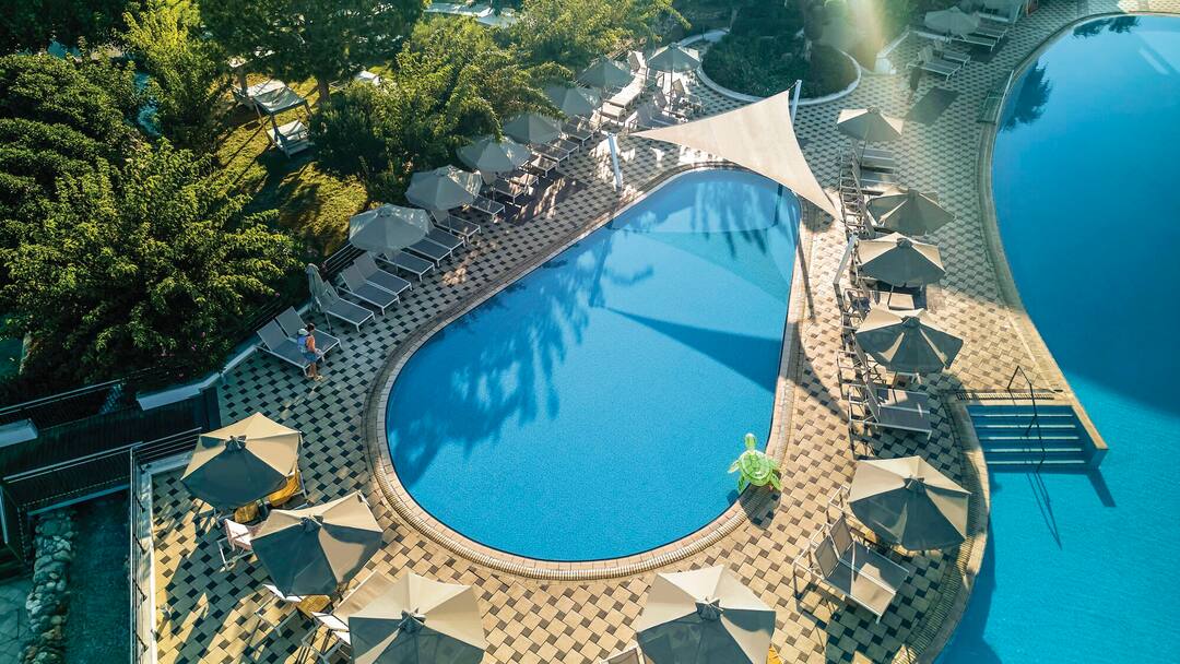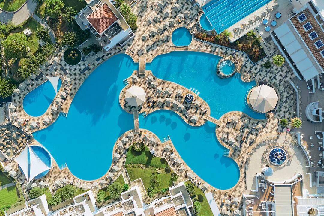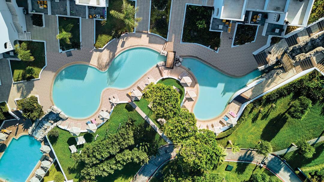 With a stay here you’ll have the choice of three restaurants, six bars and four tennis courts. The pool area’s also spread across 5,000 square metres, so you’ll never be short of space. Across the hotel, there are six pools sprinkled across the grounds, including one with lanes and a quiet number. There are also two huge whirlpools and a shallow pool for little ones.