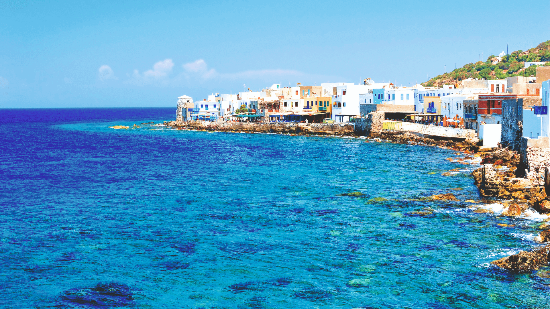 Because of its interesting V-shape layout the water lapping up onto the beach is shallow and great for children to take a dip in. If you look out across the Aegean Sea you’ll see in the distance some of the other small Greek islands.
