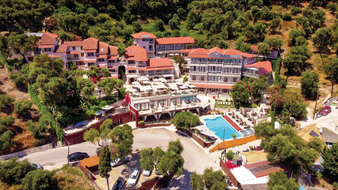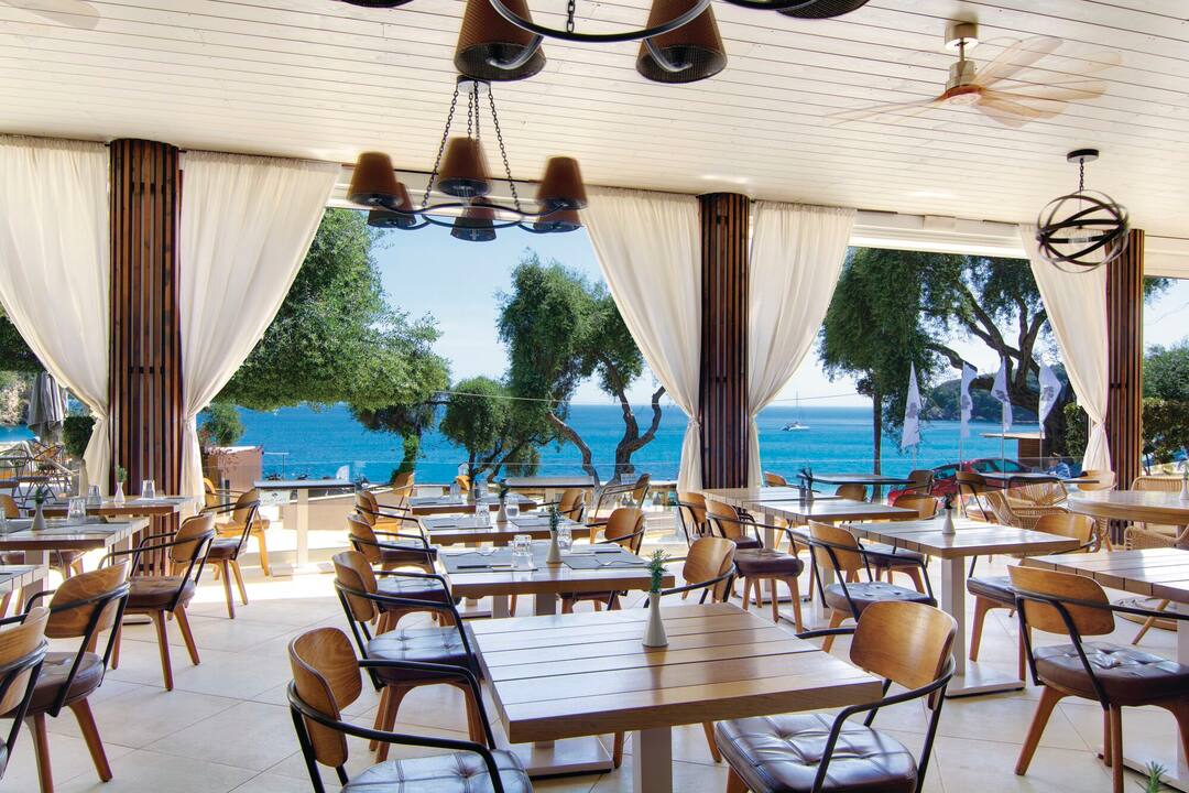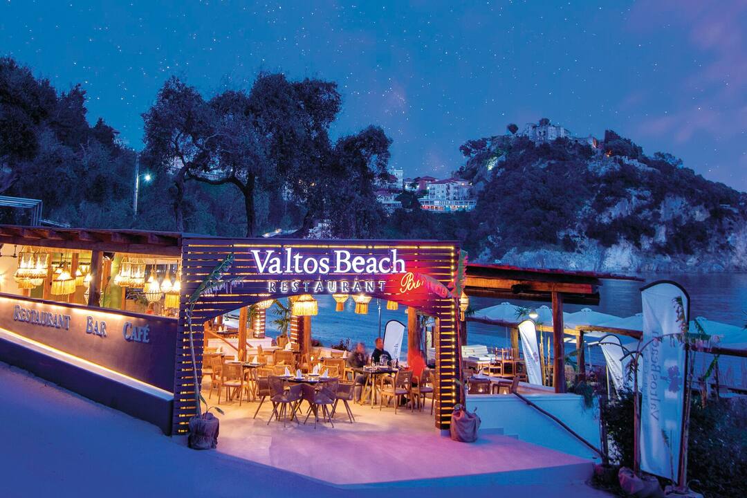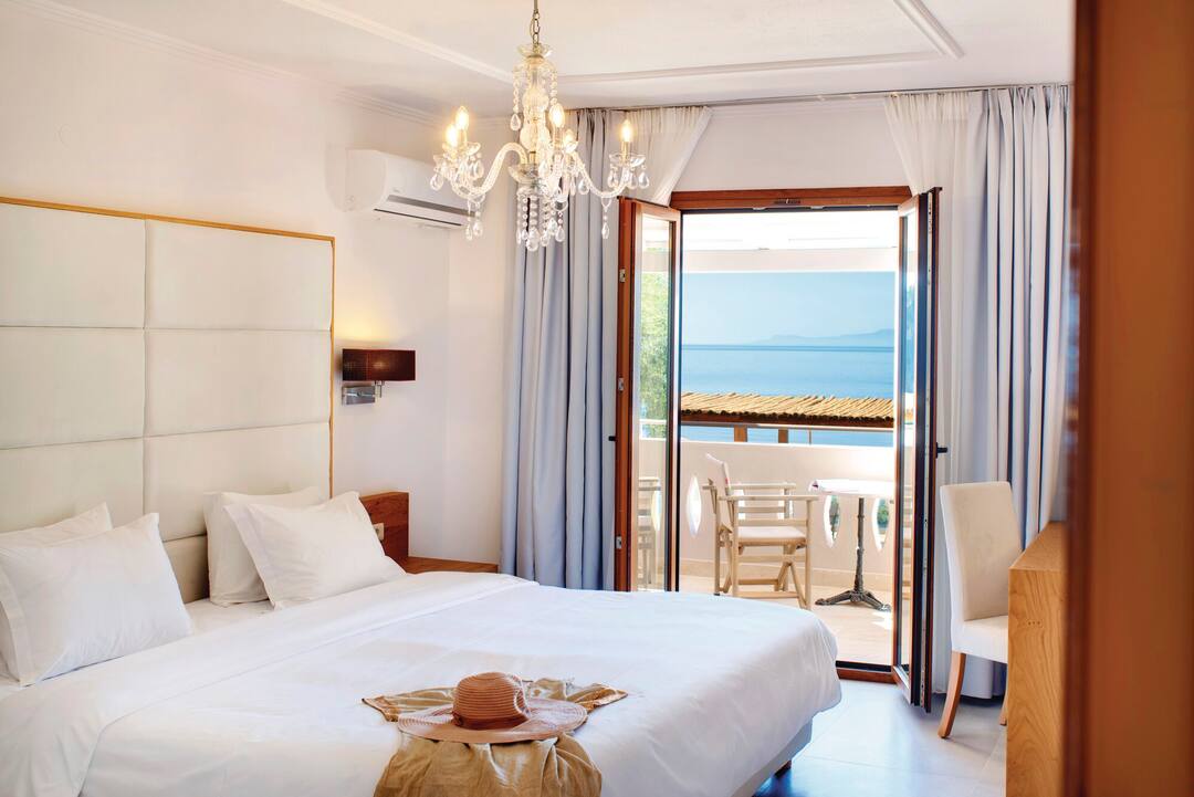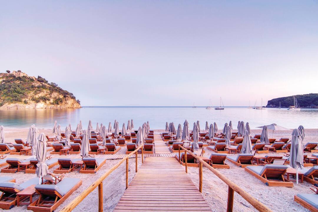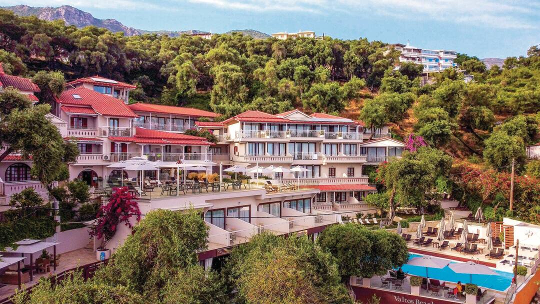The Valtos Beach Hotel is in a secluded spot surrounded by cypress trees and olive groves. It’s only footsteps from the beach, too, with a pool a few metres from the water and a bar down on the sands.