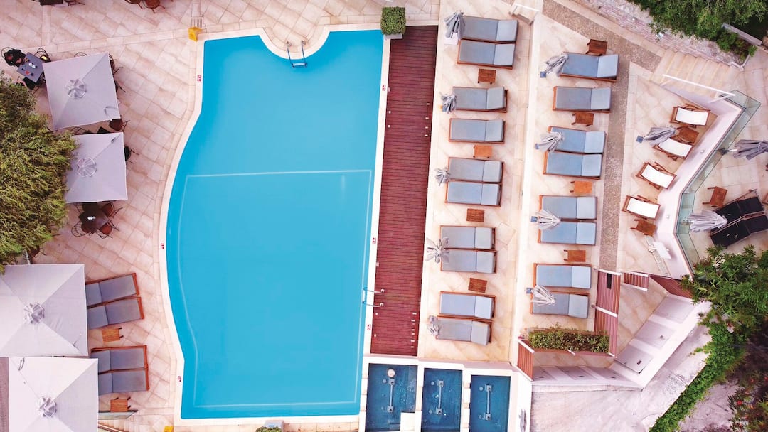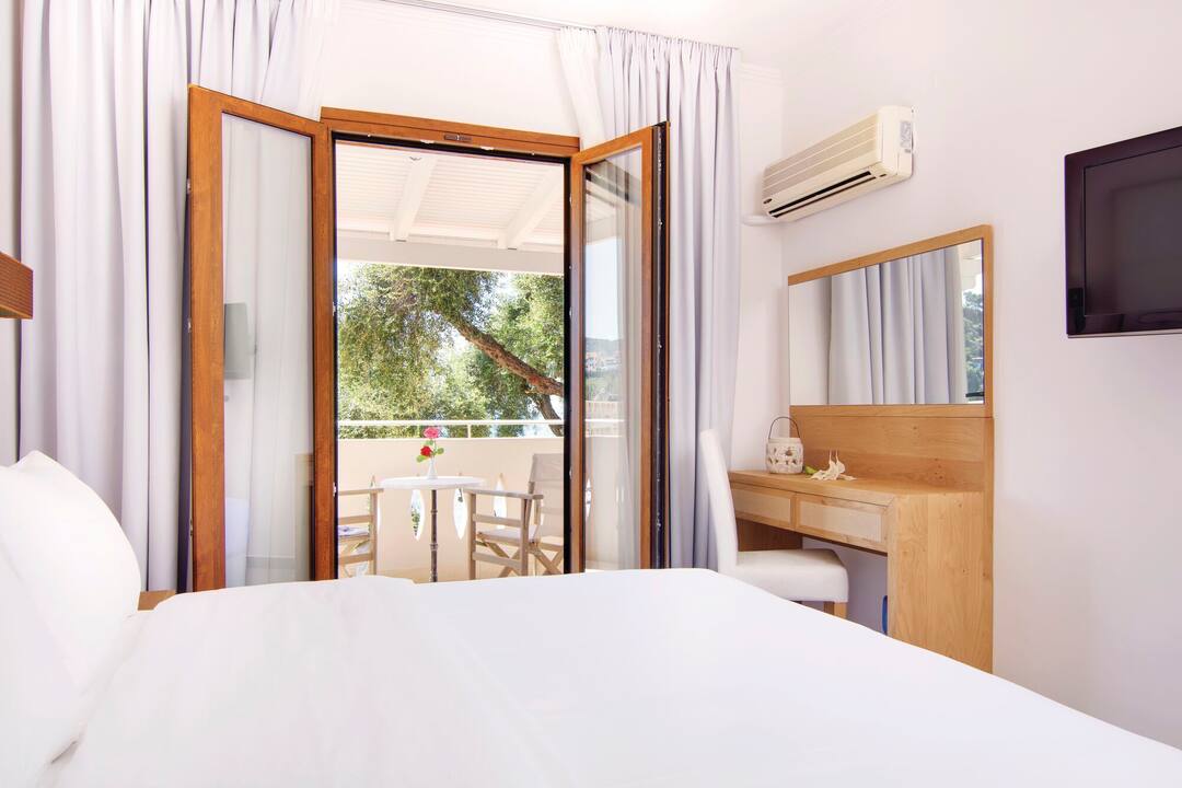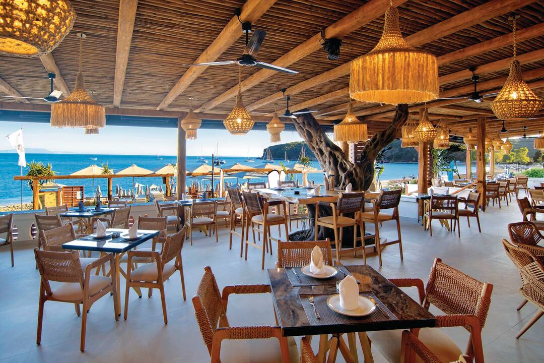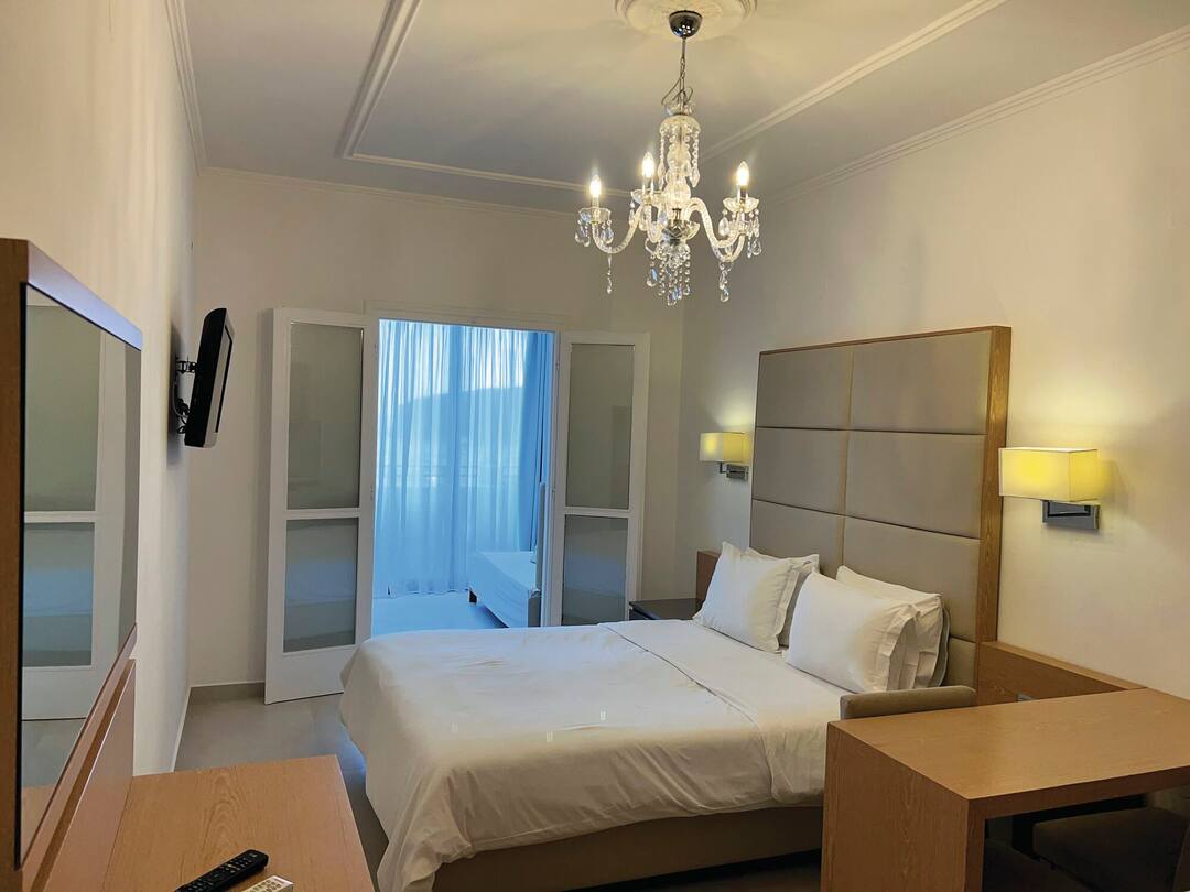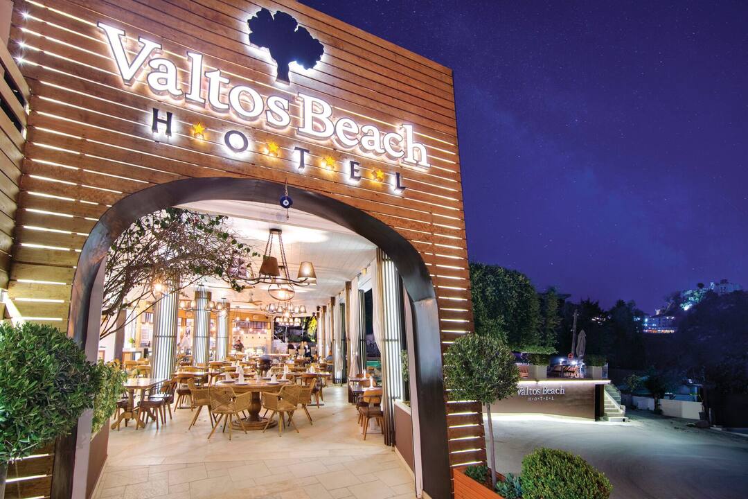 The Valtos Beach Hotel is in a secluded spot surrounded by cypress trees and olive groves. It’s only footsteps from the beach, too, with a pool a few metres from the water and a bar down on the sands.