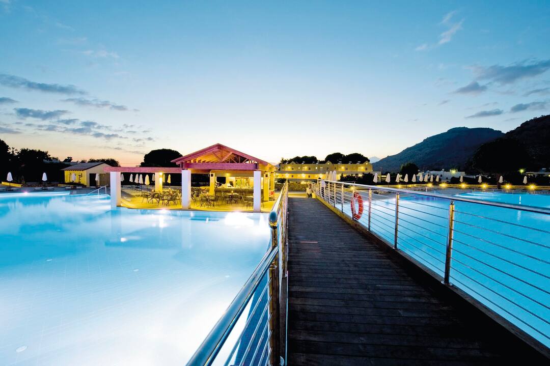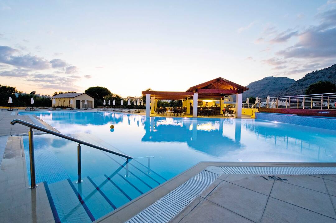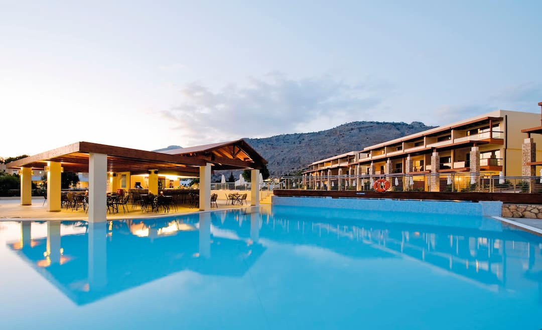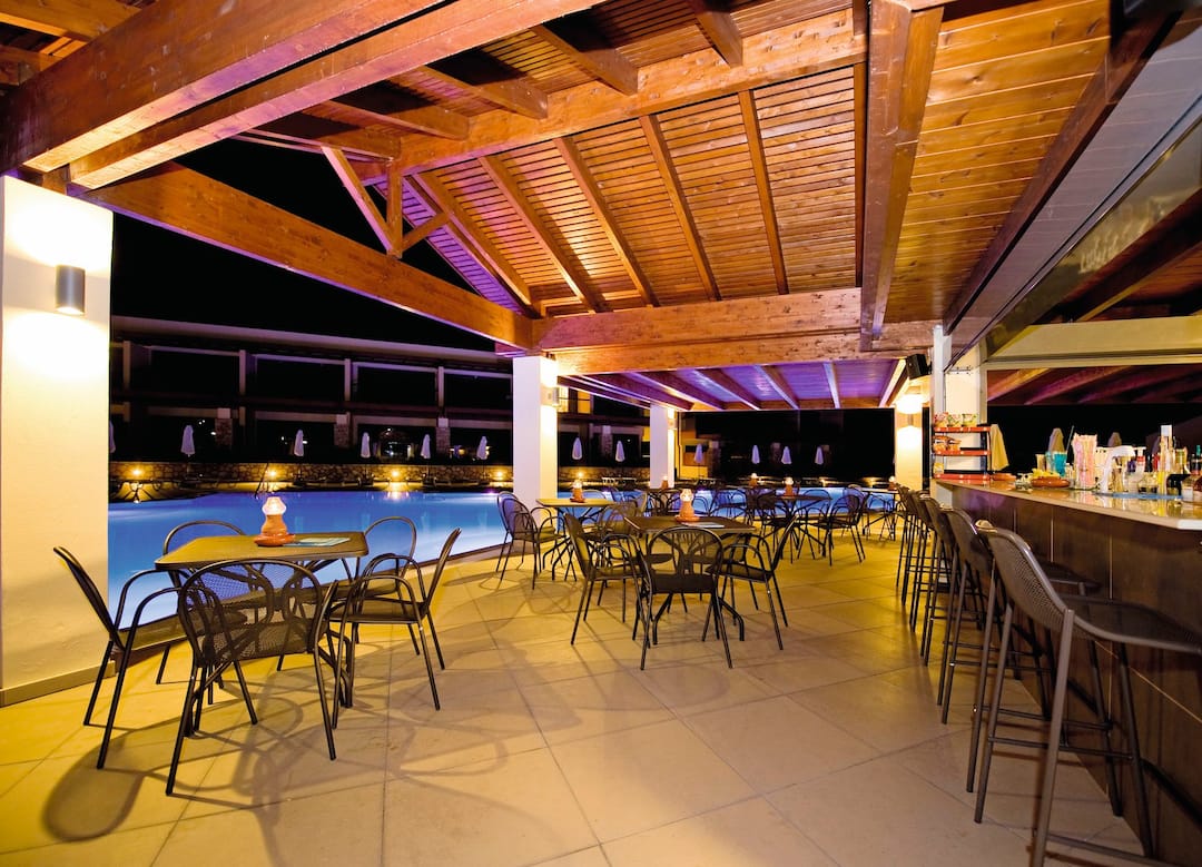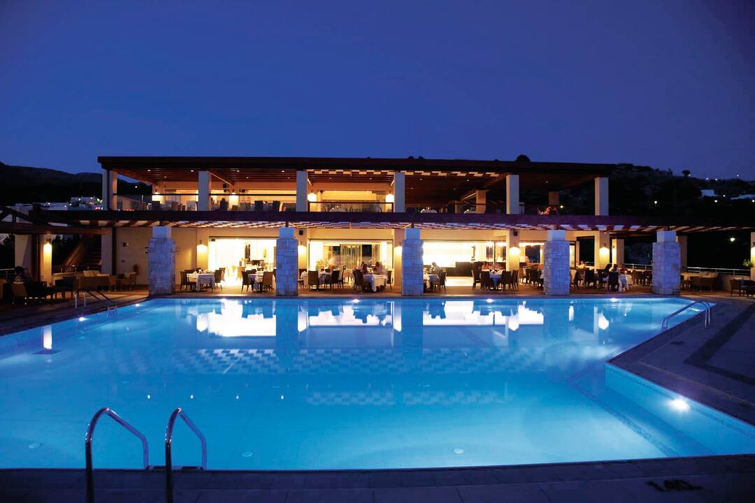 The main restaurant serves buffet breakfasts and, in the evenings, has a la carte service with international favourites and Greek classics on the menu. There’s also a poolside lounge bar and restaurant that lights up at night. During the day, it serves light lunches.