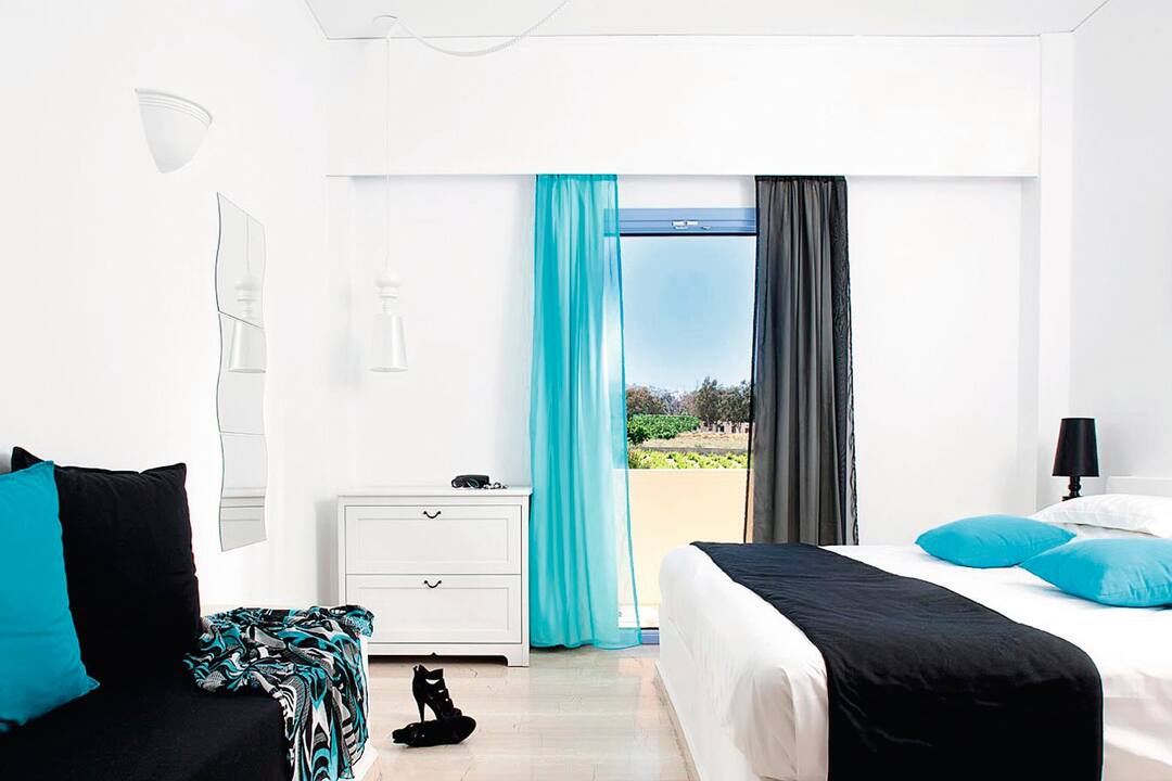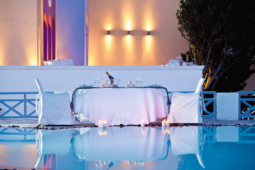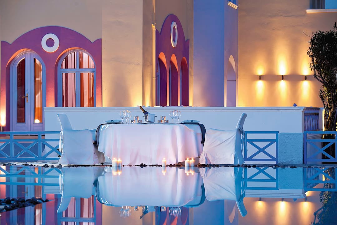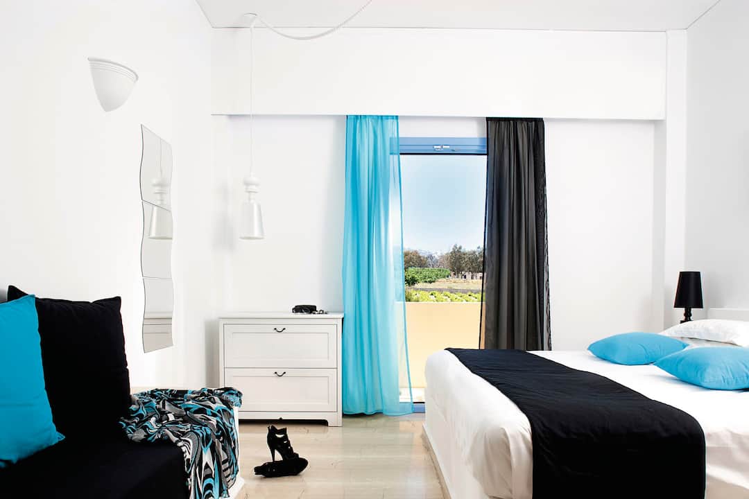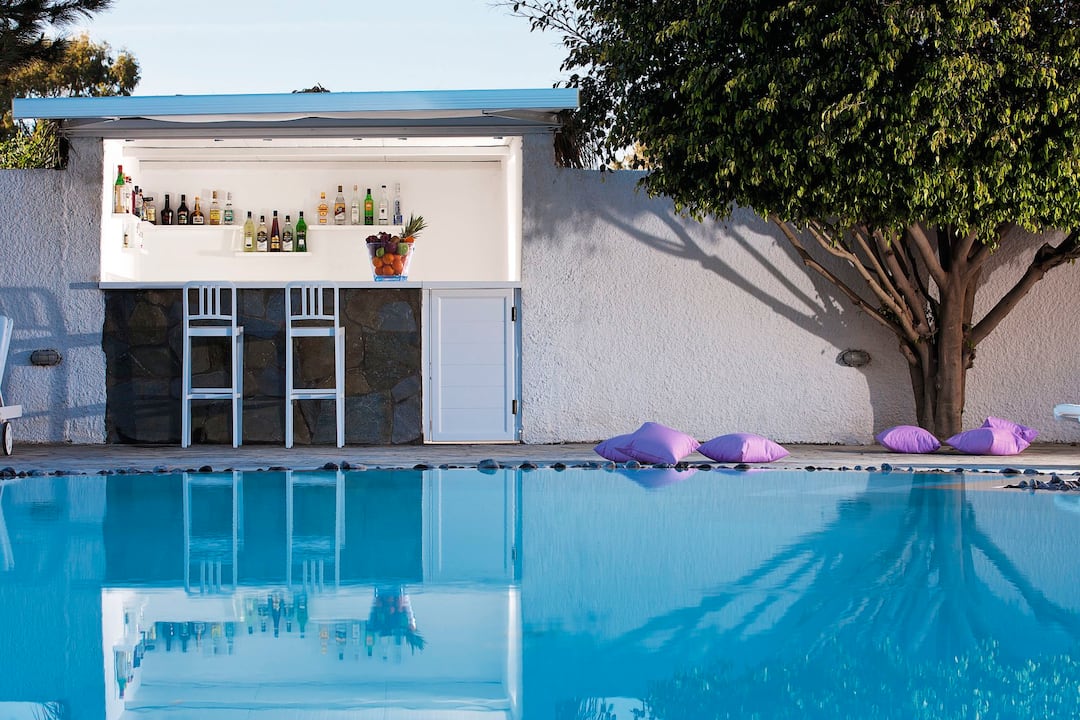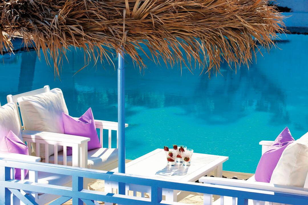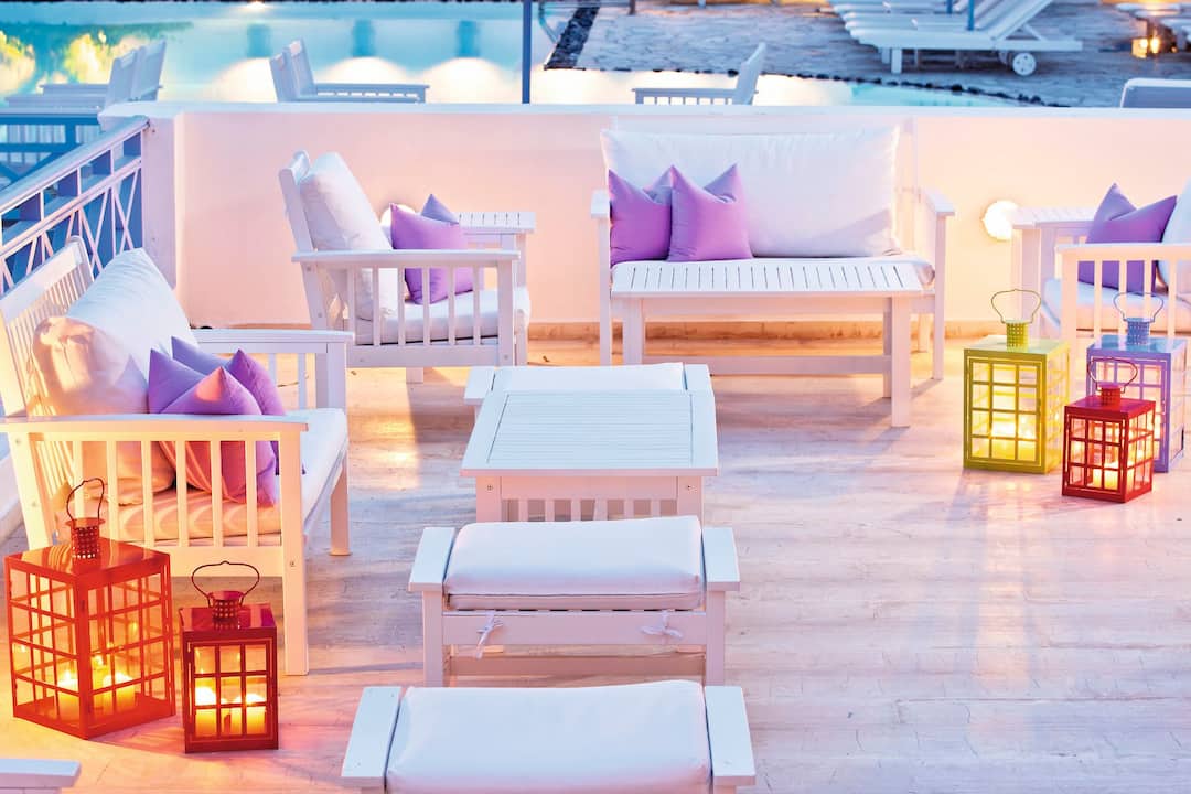 Every morning, the hotel serves hearty Greek food to set you up for the day. Most guests then head straight to the sleek pool, which is framed by thatched parasols and white loungers. It even has its own chill-out area complete with cushioned sofas and oversized lanterns. There’s also a bar by the pool, so it’s easy to get daytime snacks.