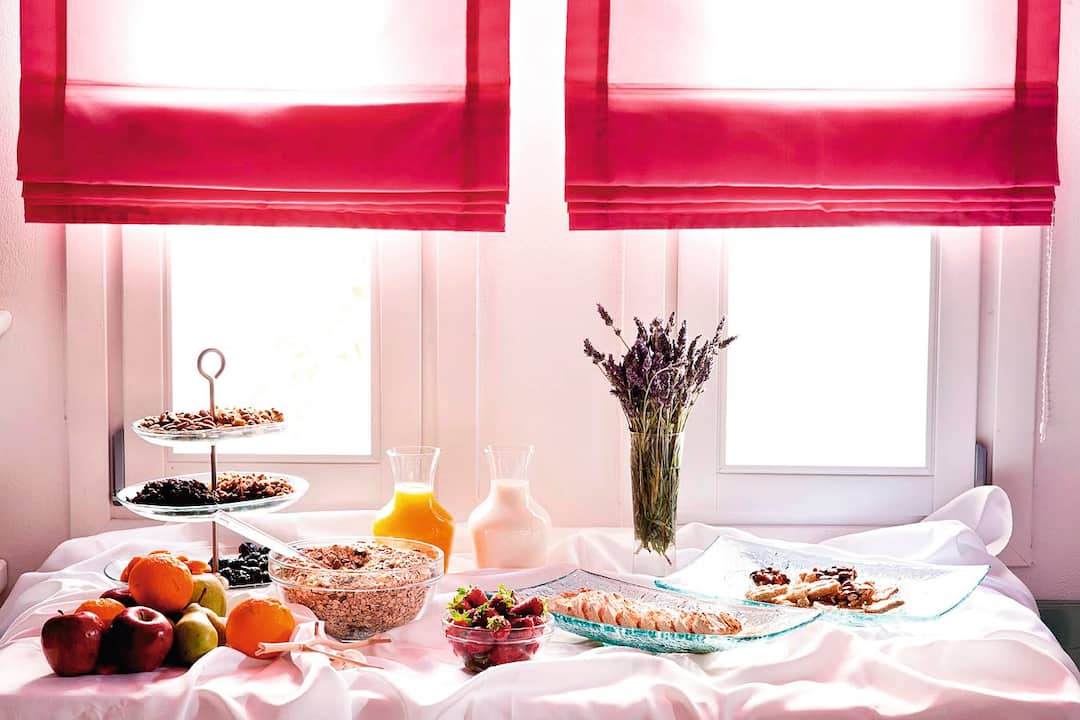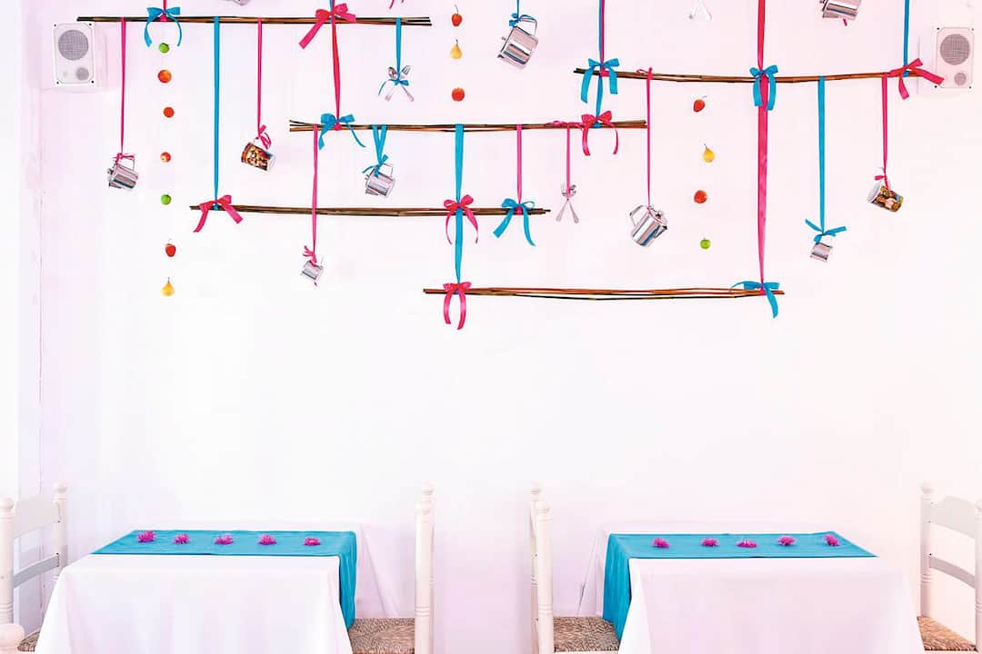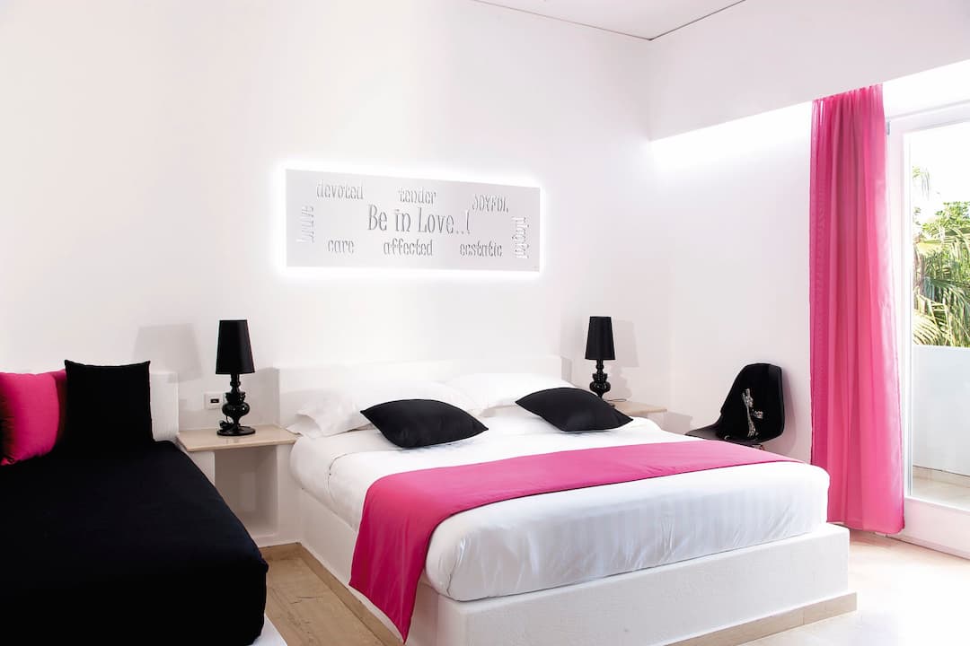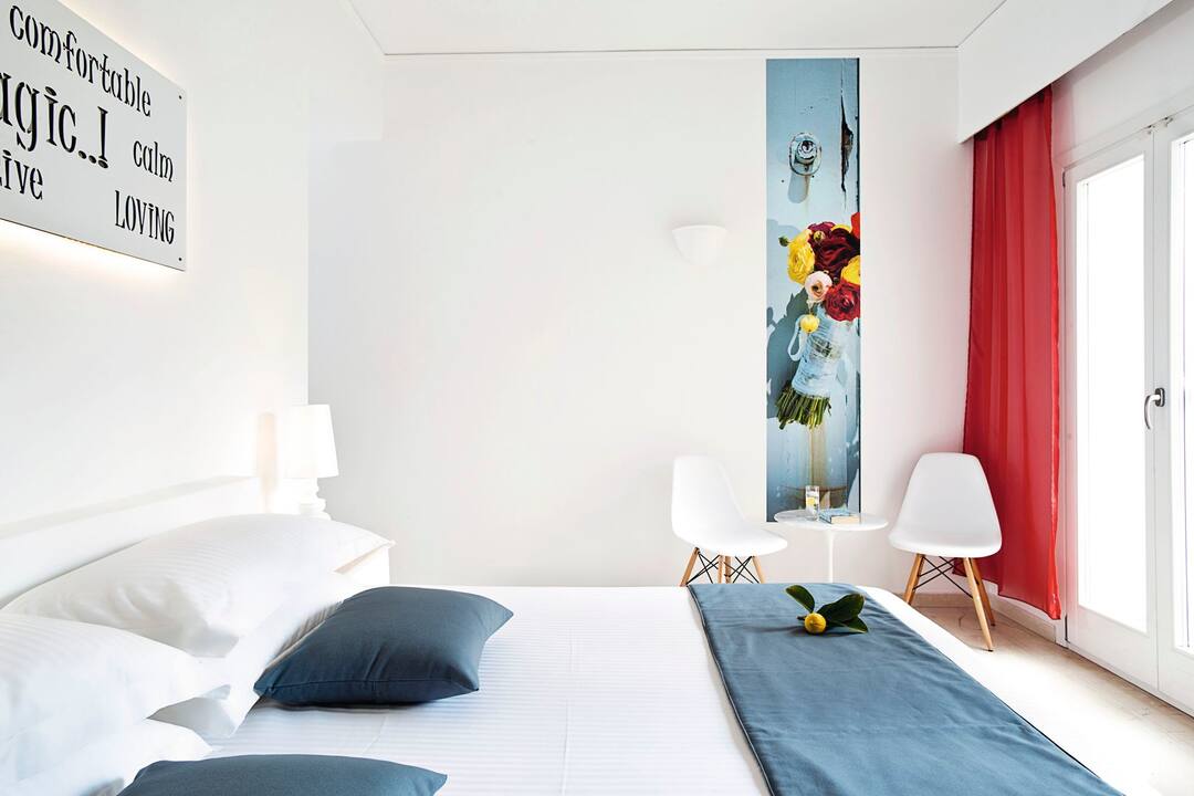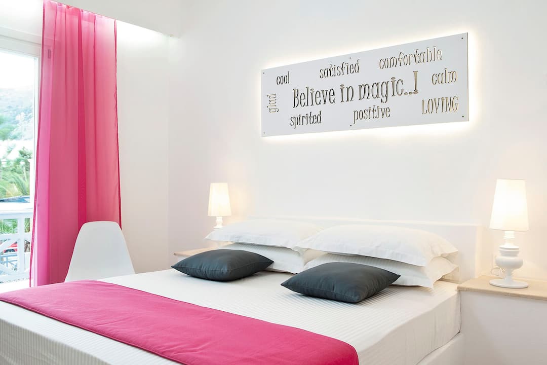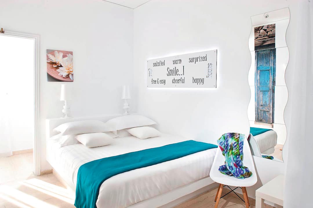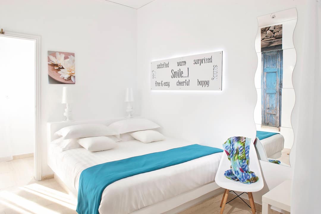 Every morning, the hotel serves hearty Greek food to set you up for the day. Most guests then head straight to the sleek pool, which is framed by thatched parasols and white loungers. It even has its own chill-out area complete with cushioned sofas and oversized lanterns. There’s also a bar by the pool, so it’s easy to get daytime snacks.