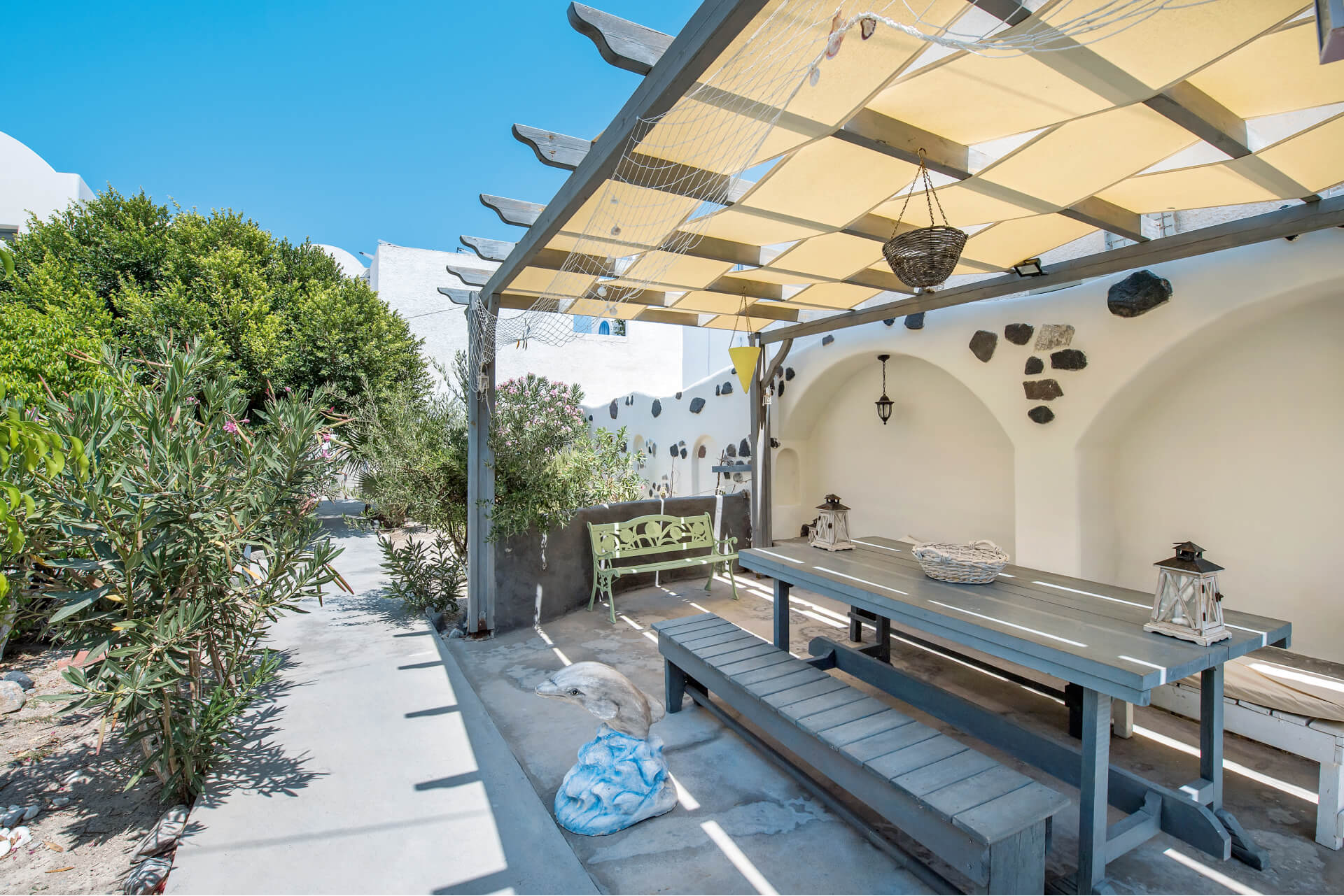 The Belair Santorini combines traditional self-catered rooms with a fantastic location. The hotel is a mere five-minute walk from the rich sands of Perissa Beach while authentic tavernas line the coastal roads. The rooms are simple yet comfortable with gorgeous Grecian touches running throughout the architecture. The curved ceilings and stone archways make for great photos while the hidden loveseats in alcoves make the perfect spot for relaxing. This peaceful resort has its own tranquil gardens and you’ll find enough sunny and shady spots to satisfy your preferences. There’s even a picnic table outside to enjoy meals at. If you want to swim, head to the neighbouring Meltemi Village Hotel and use the pool free of charge.