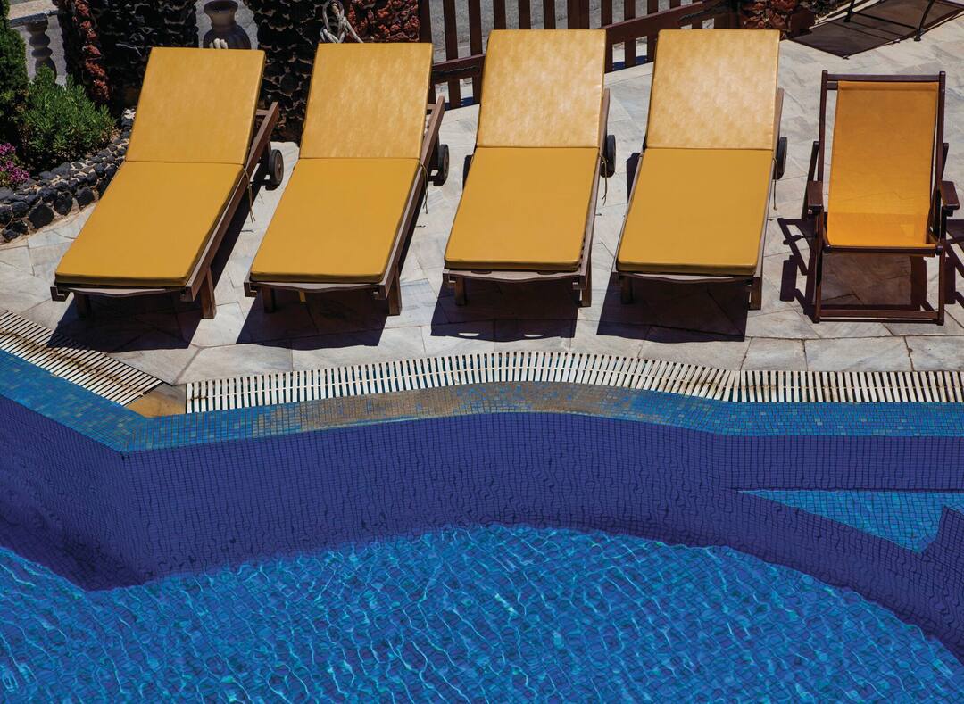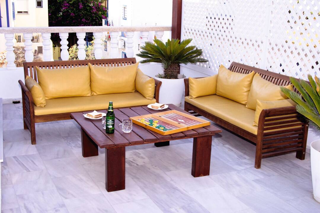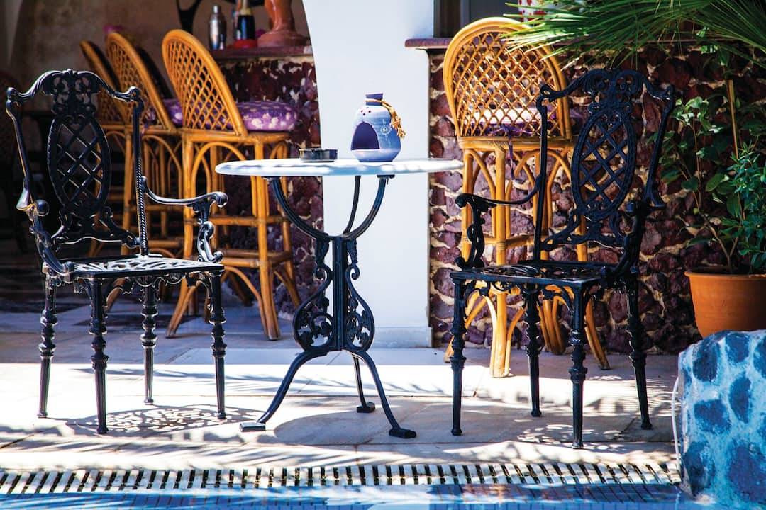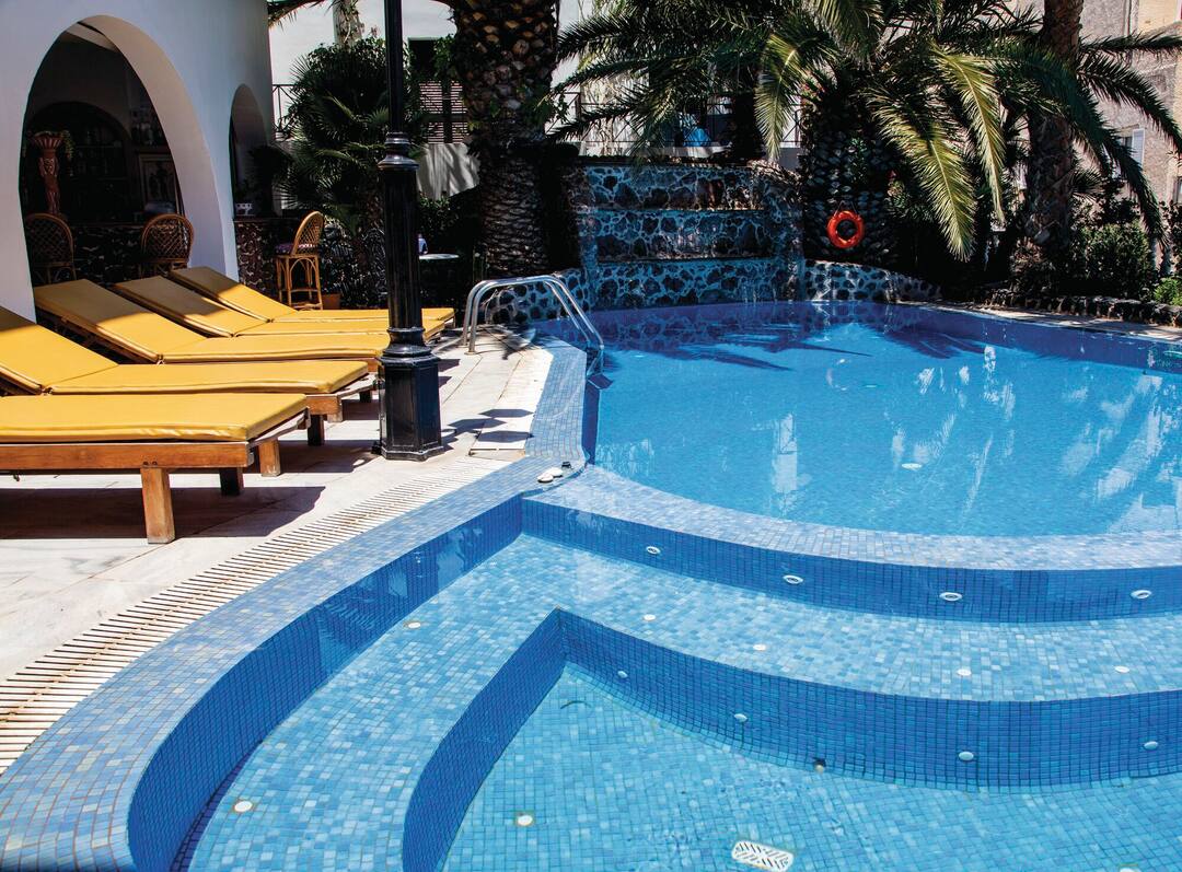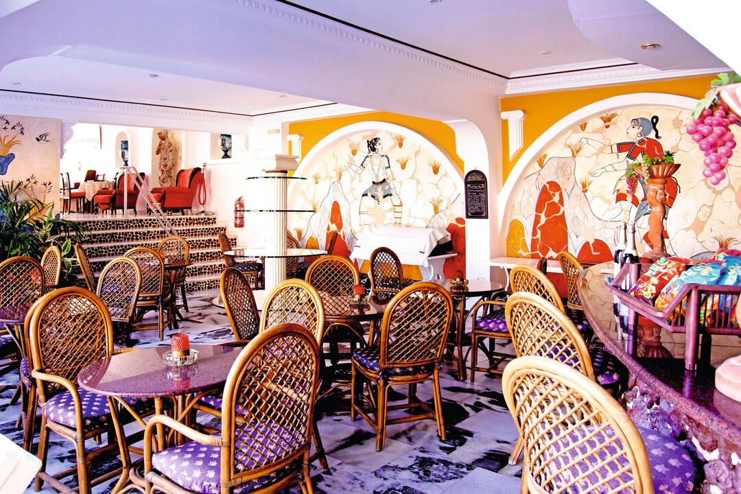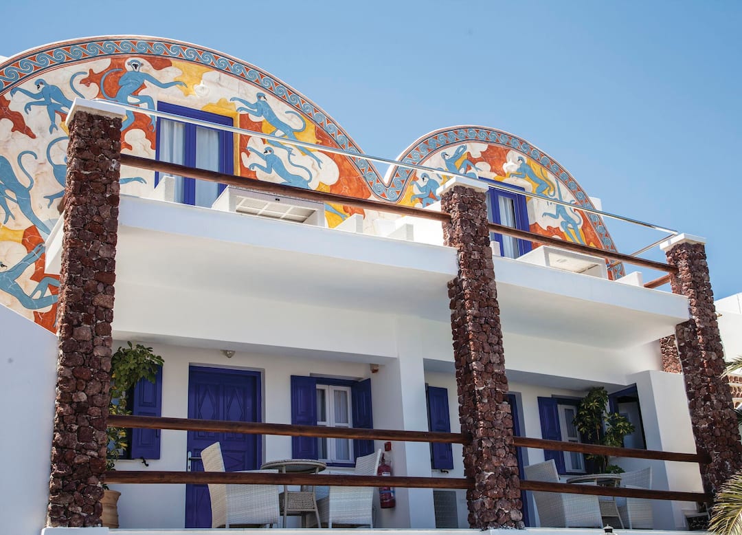 The Black Sandy Beach looks like a traditional Greek villa. The whitewashed building comes with mosaics on the walls and there’s even an open-sided bar that looks like a taverna.