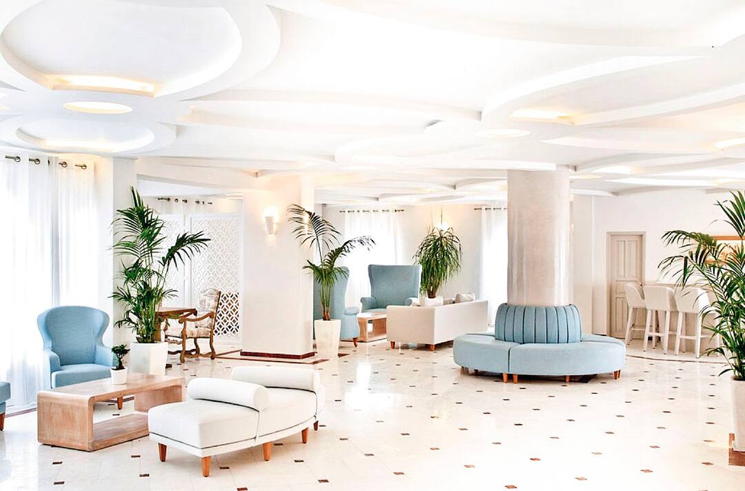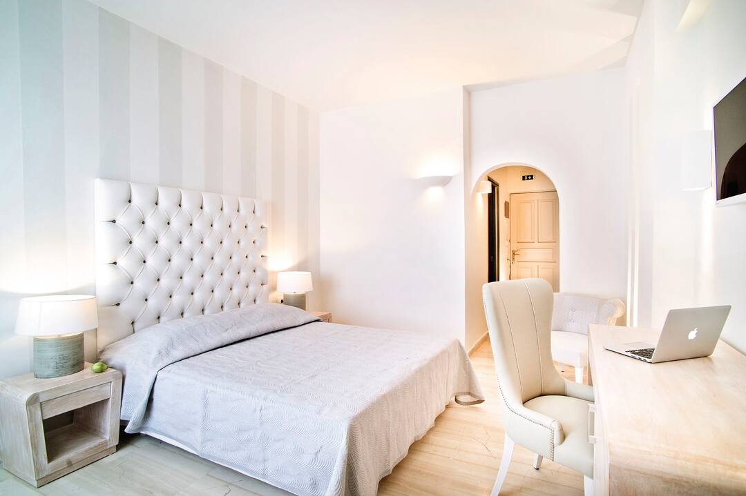 The Santorini Palace has a relaxing vibe and spectacular views of Santorini’s caldera. The hotel’s built in a typically Cycladic style, and is made up of a maze of sugar-cube buildings, while inside, the modern bedrooms feature all-white walls and furniture, as well as bleached-wood flooring.