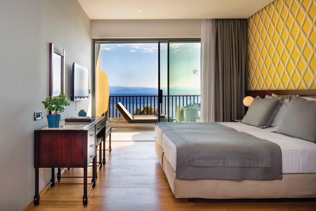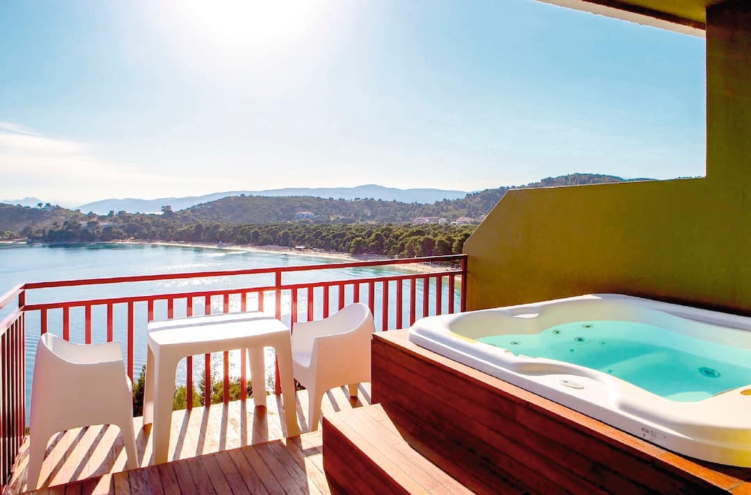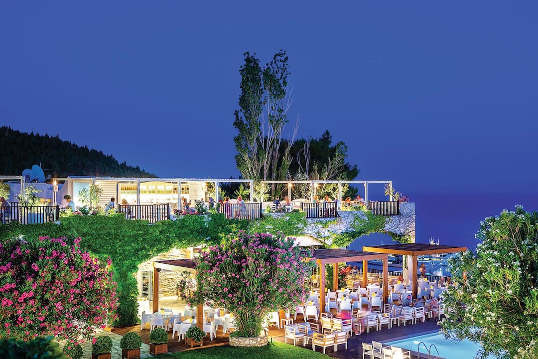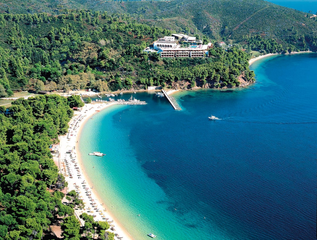 The hotel is on a pine-covered cliff that overlooks the bay of Koukounaries. What’s more, two of the best sandy beaches in Skiathos sit either side of the hotel.