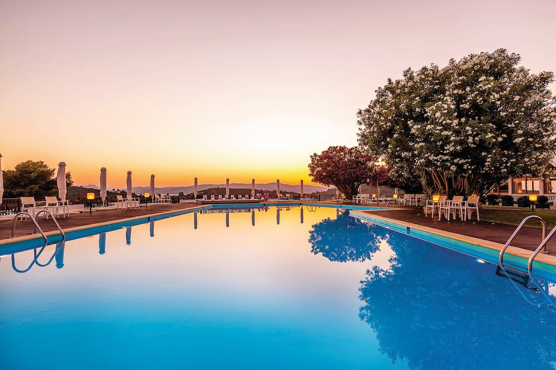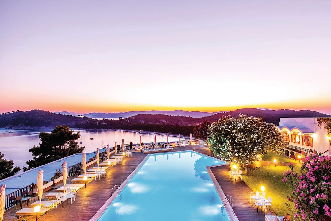 With two beaches nearby, a sea-view pool and a rooftop restaurant, the Skiathos Palace Hotel is as palatial as its name suggests.