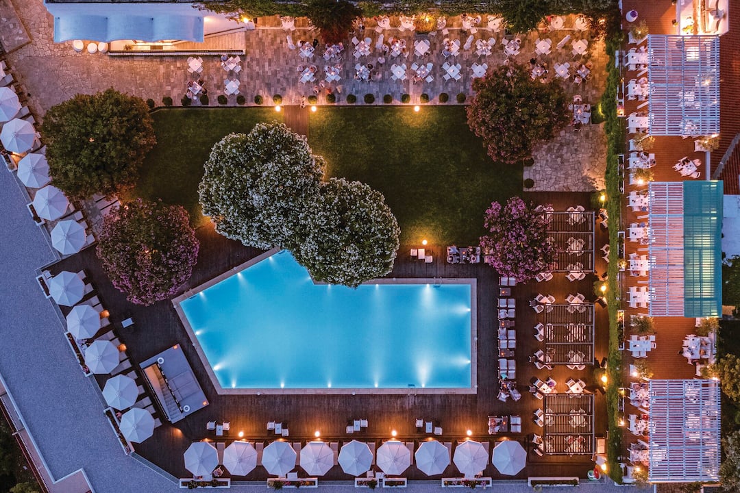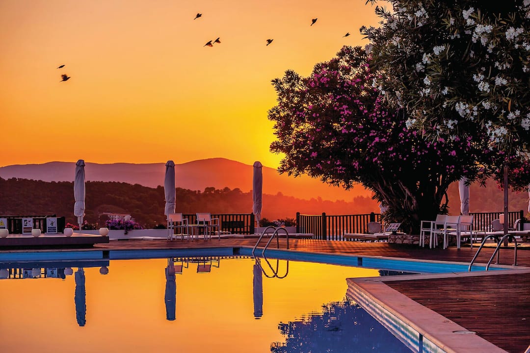 The pool is on a raised deck to make the most of the views, and surrounding the pool, you’ll find touches of luxury, like cushioned loungers, smart parasols and vine-clad pergolas.