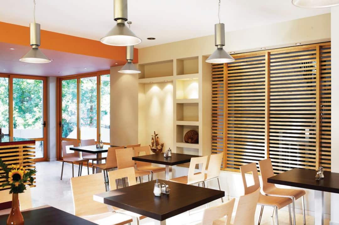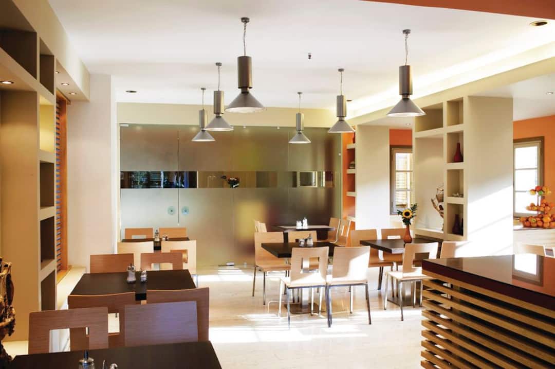 The restaurant here has floor-to-ceiling windows that make it a bright spot for breakfast. Food-wise, everything’s available, from traditional Greek options to classic British meals.