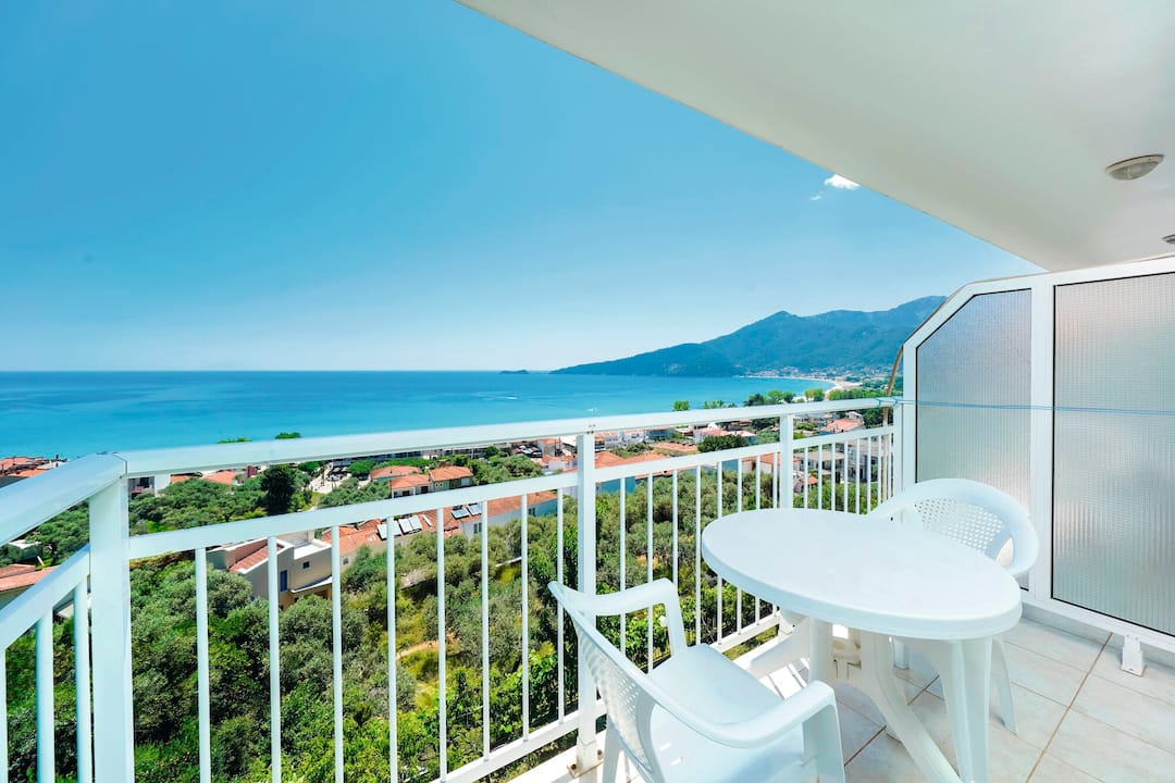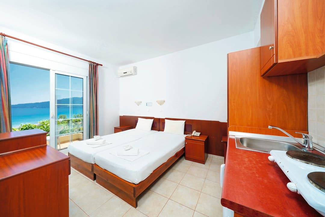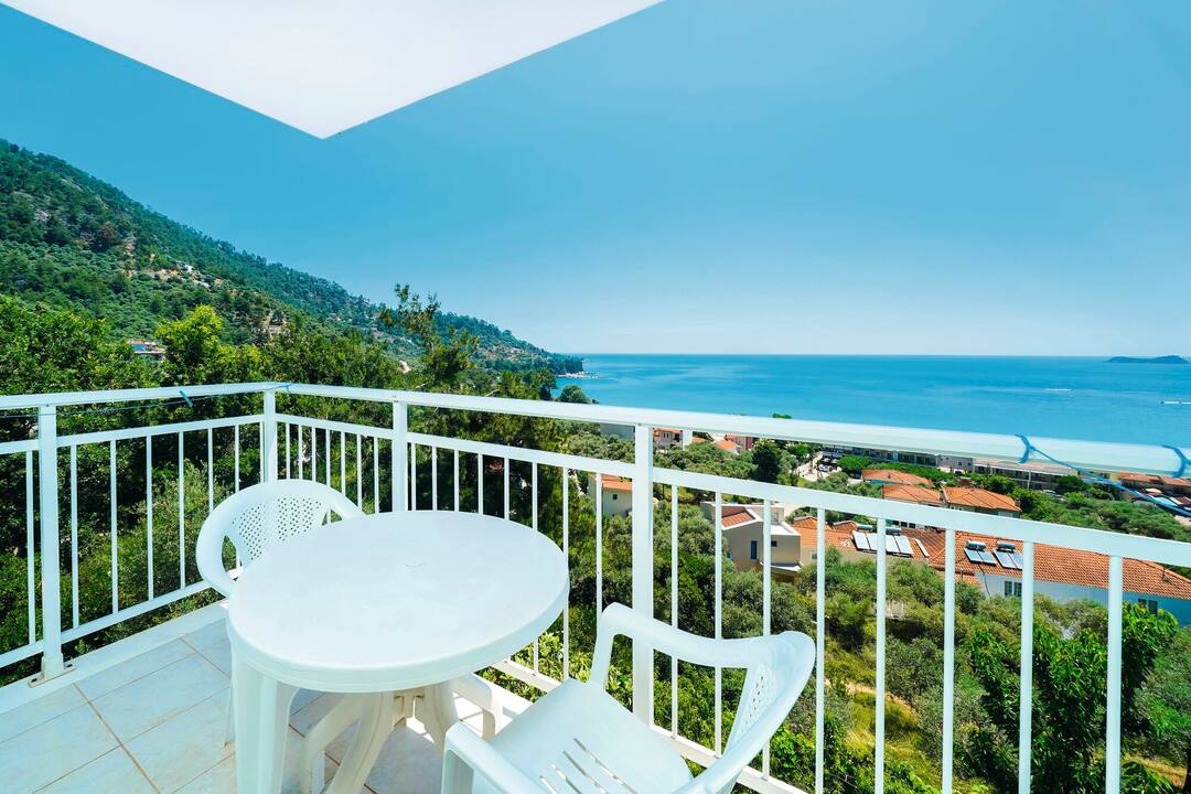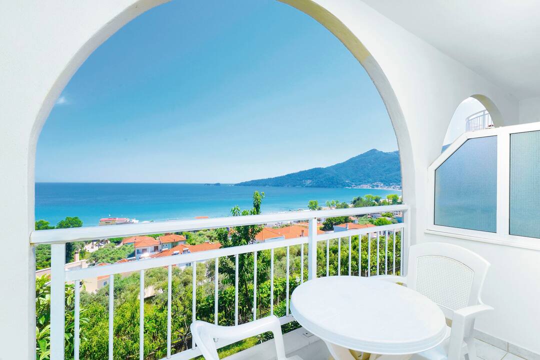 Located in the quaint family surroundings of Golden Beach, the Smaragdi II Studios provides a rustic, yet contemporary setting for your holidays to Thassos. Adorned with fertile shrubbery and traditional architecture, you’ll find yourself just minutes’ walk from a Blue flag beach, where you can sunbathe and soak up the local atmosphere. You have access to a pool via a neighbouring hotel pool, which also has a bar and plenty evening entertainment. Smaragdi’s quaint setting and awe-inspiring hilltop views make it the perfect destination for a quiet romantic break. It’s located a short walk from the Golden beach resort, where you’ll find a range of authentic Greek bars, restaurants, and international cuisine. Access to Thassos island is readily available by ferry from the mainland, making it easy to escape the tranquility of the surroundings – if you really want to.