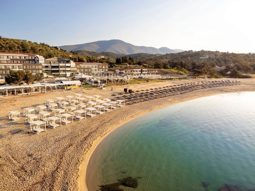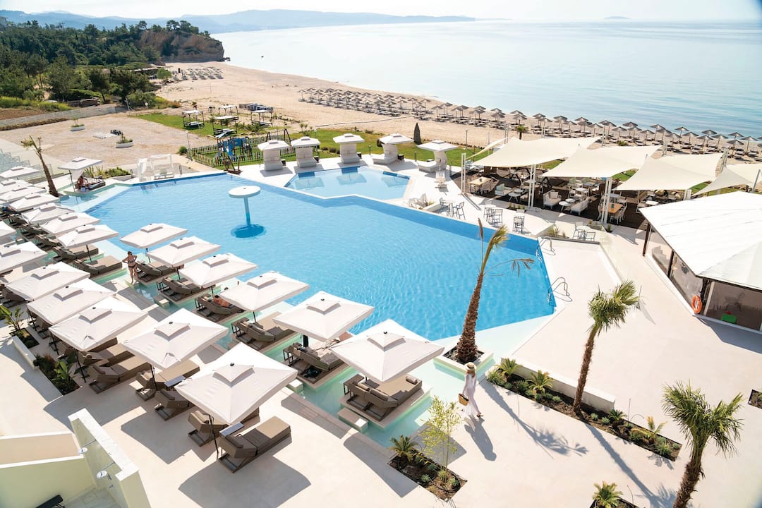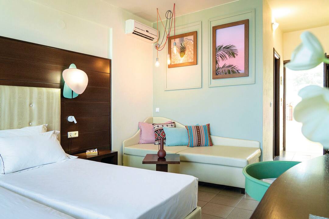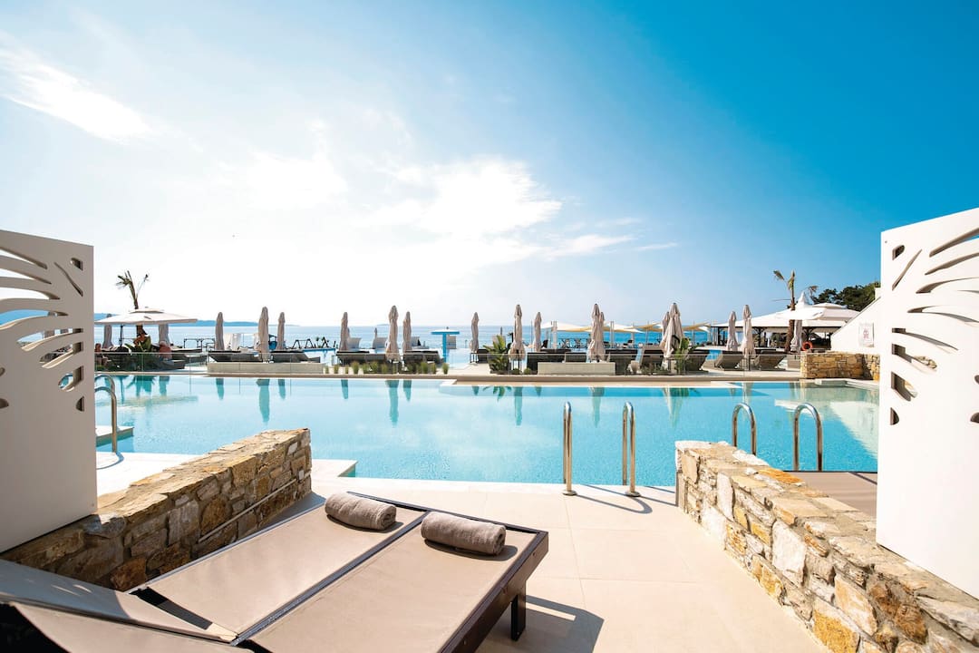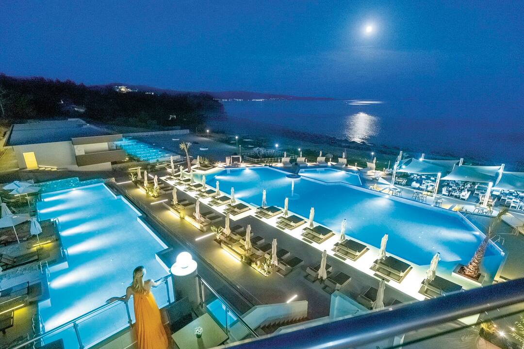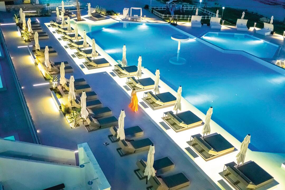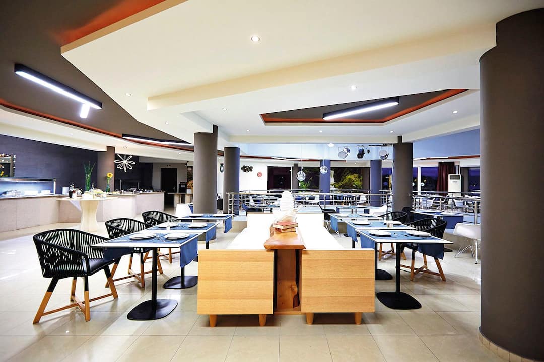 For meals, there’s a buffet restaurant that specialises in Mediterranean cuisine and a poolside taverna that offers up seafood dishes. After, cocktails are served in the lobby bar.