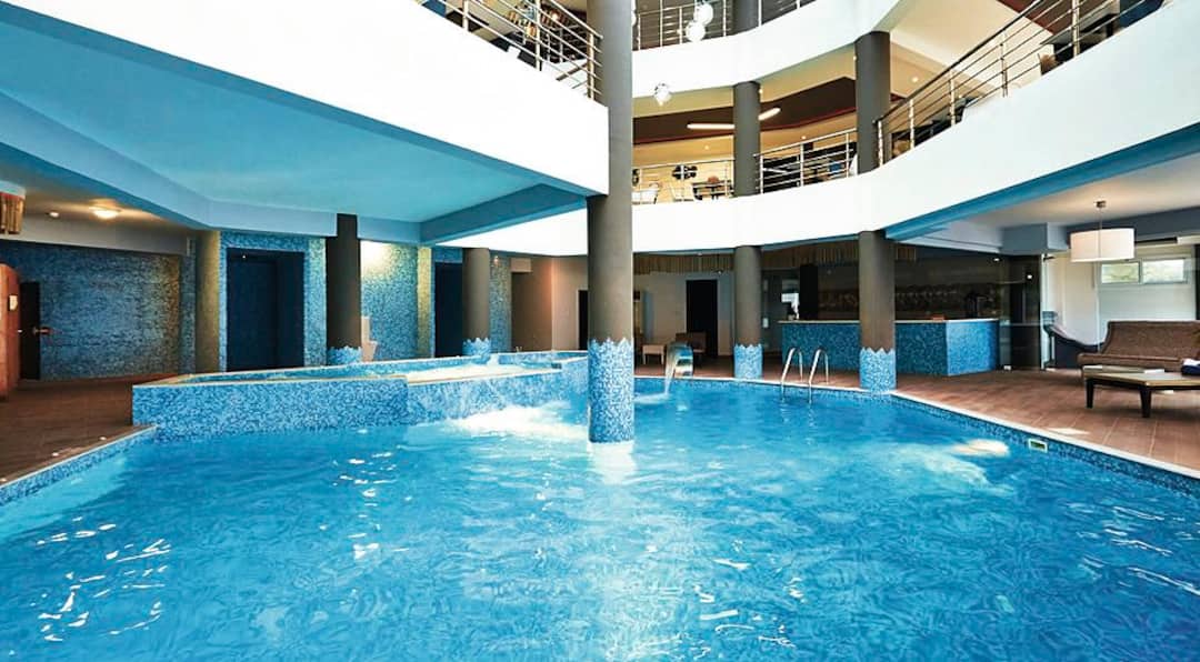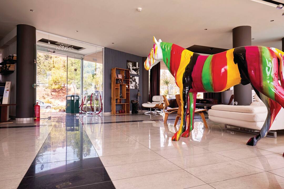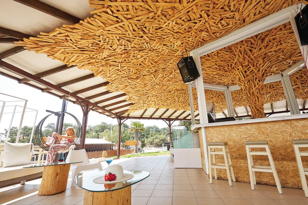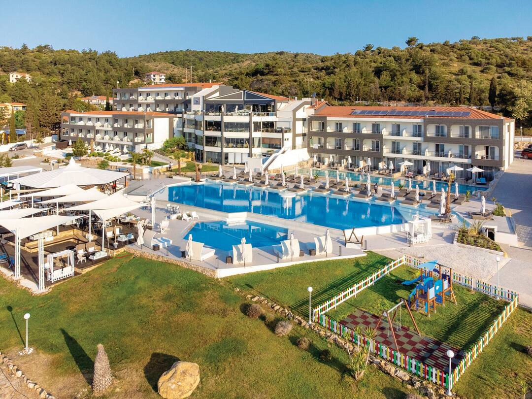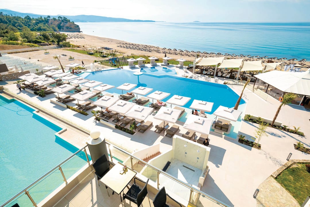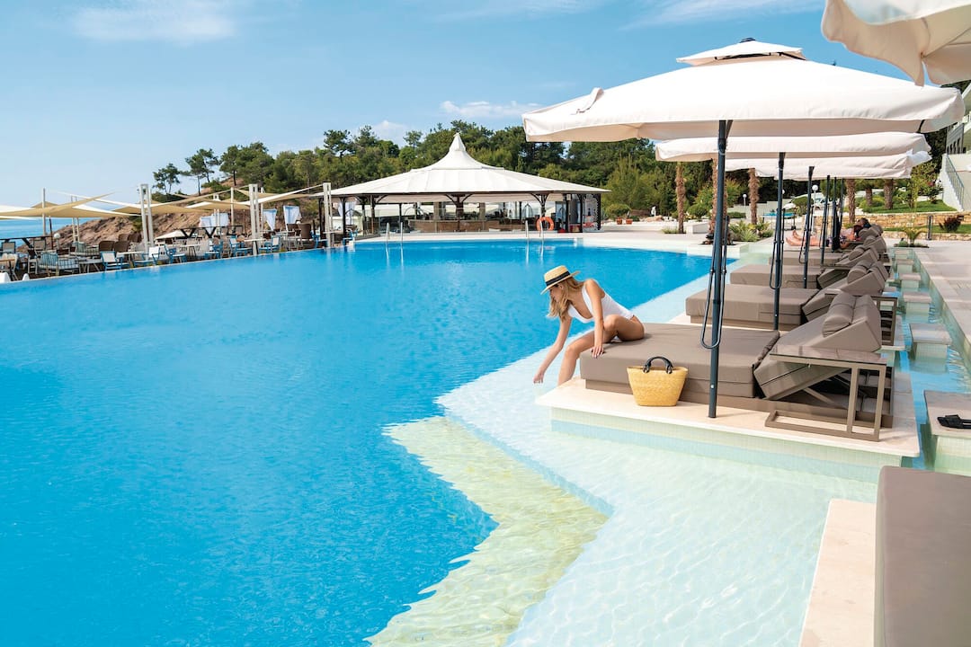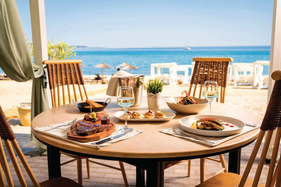 For meals, there’s a buffet restaurant that specialises in Mediterranean cuisine and a poolside taverna that offers up seafood dishes. After, cocktails are served in the lobby bar.