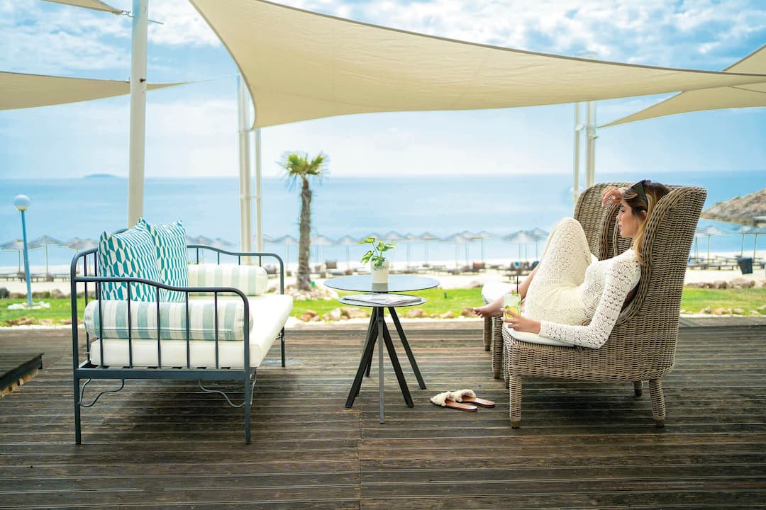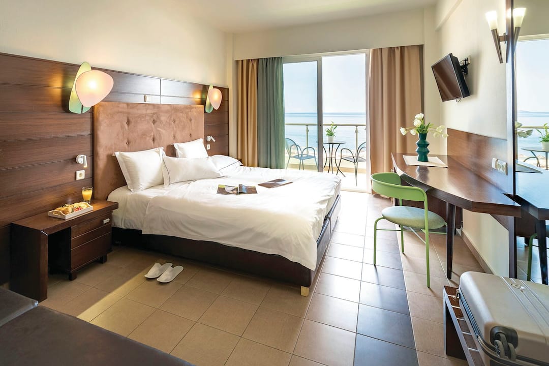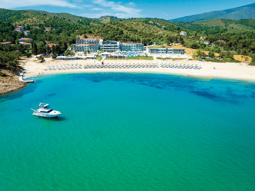 The Blue Dream Palace Hotel overlooks a peaceful beach and the Aegean Sea. Set on a long stretch of beach that rarely sees crowds, peace and quiet are part of the package when you stay here.
