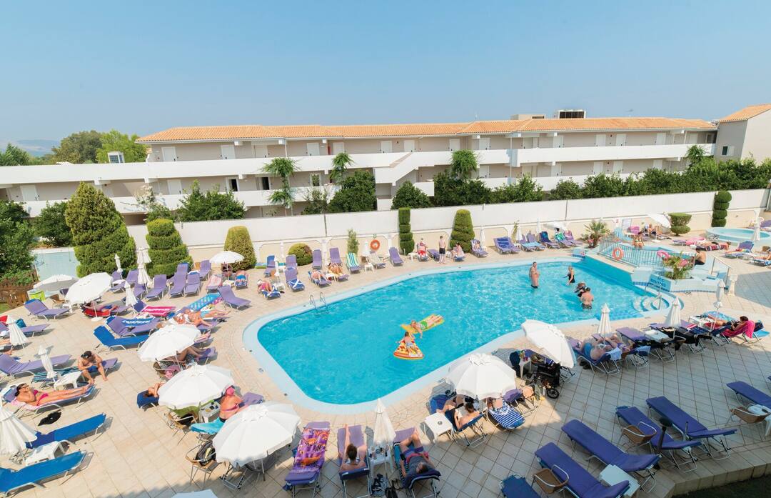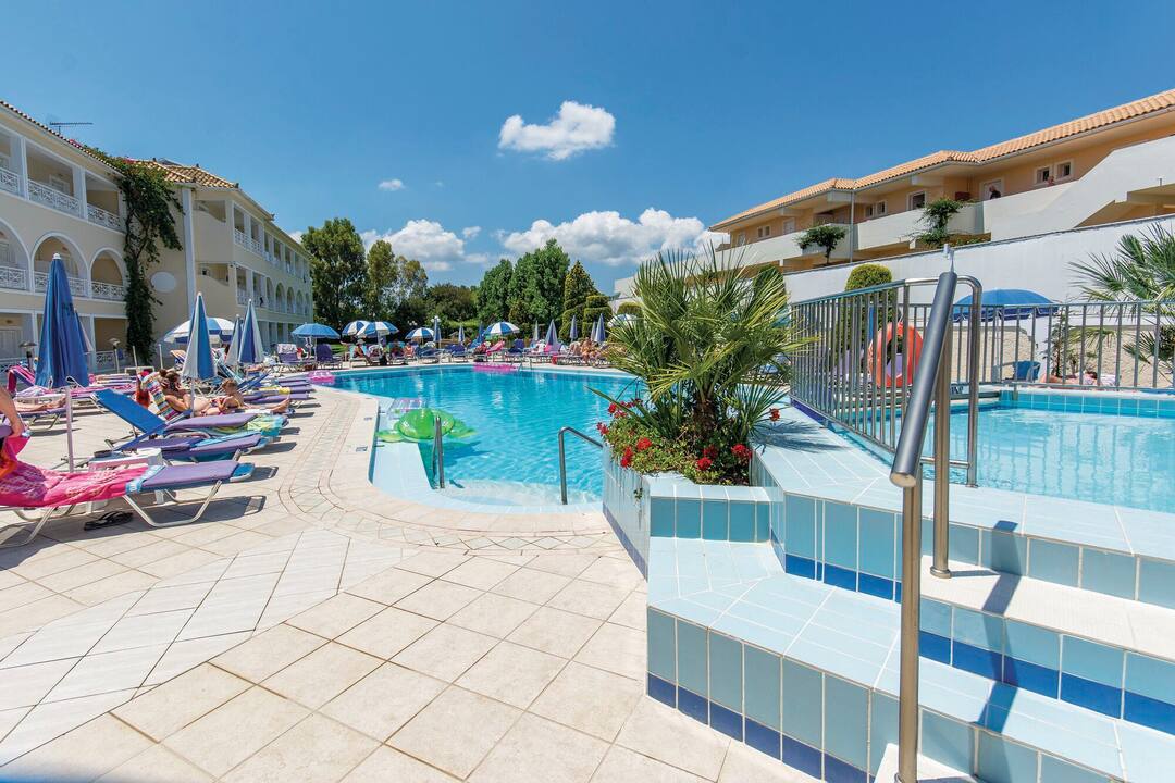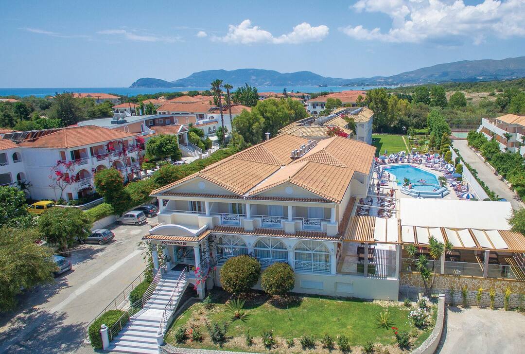 The picturesque Hotel Roseland is tucked away in a corner of the traditional Greek village of Kalamaki, one of the most popular tourist resorts in Zante. This family-run hotel has a splash pool and playground for the little ones and a large swimming pool with a jacuzzi for older guests.