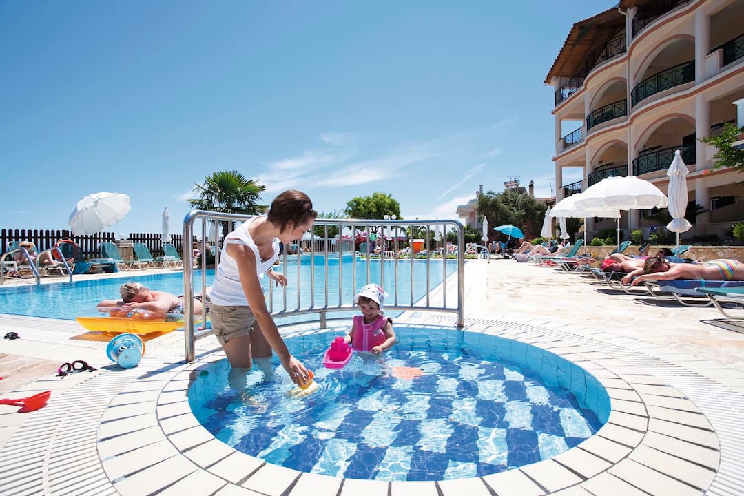 The pool has a children’s area and whirlpool bath, giving the whole family a slice of luxury and fun. Nearby, a bar serves drinks and snacks. The beach is also on your doorstep.